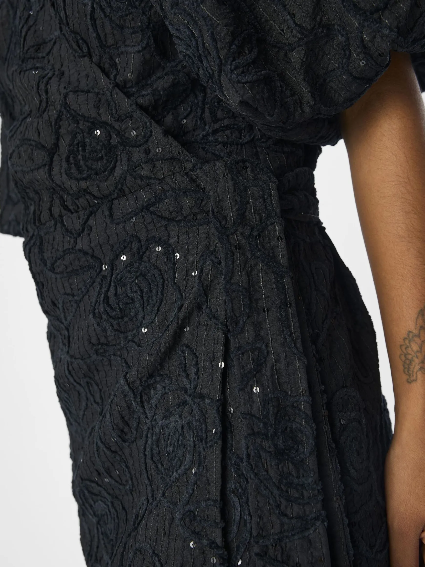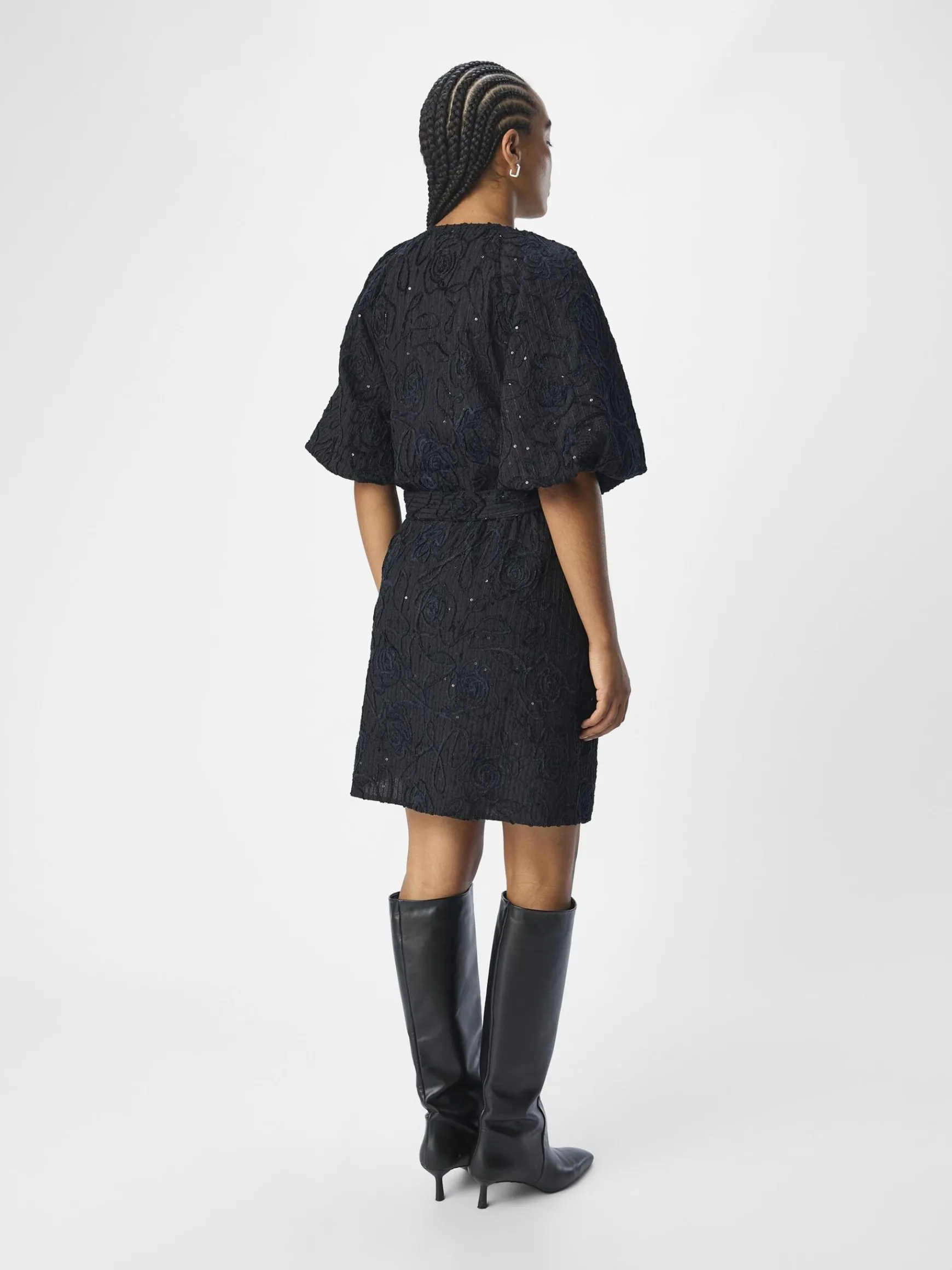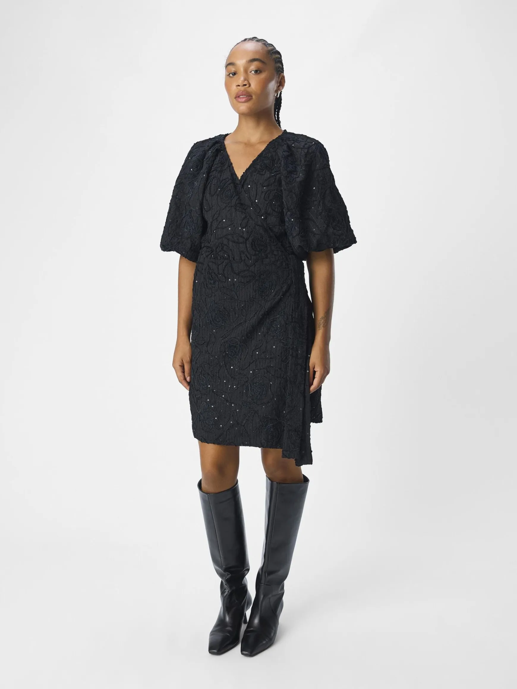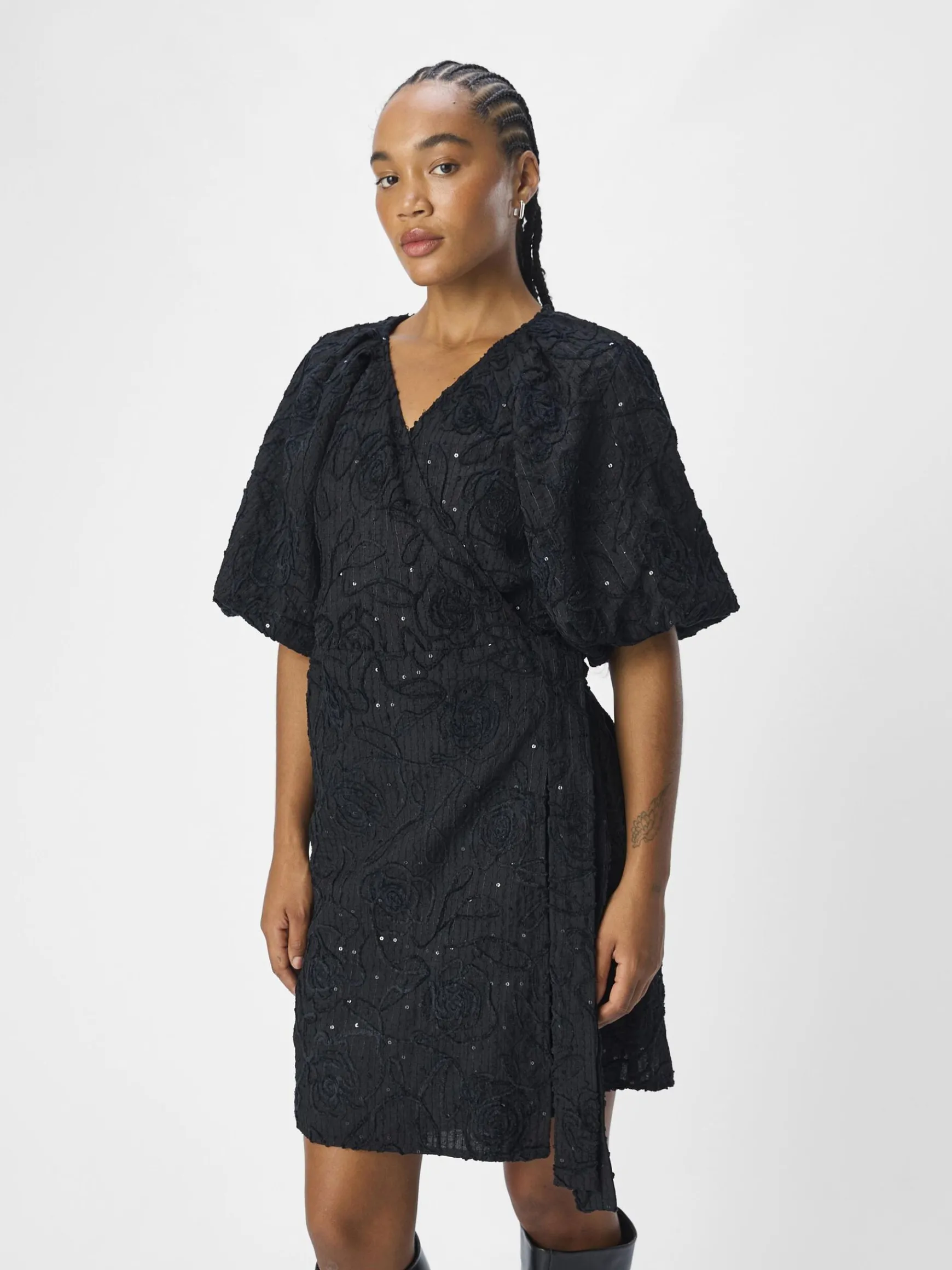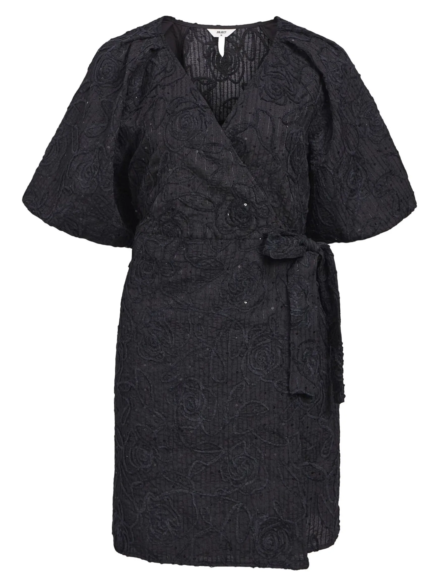 – Slå-om-kjole i mini-længde- All-over jacquard blomstret design- Pallietdetalje – V-hals- Plisserede raglanskuldre- Korte pufærmer- Bindebånd i siden- Almindelig pasform