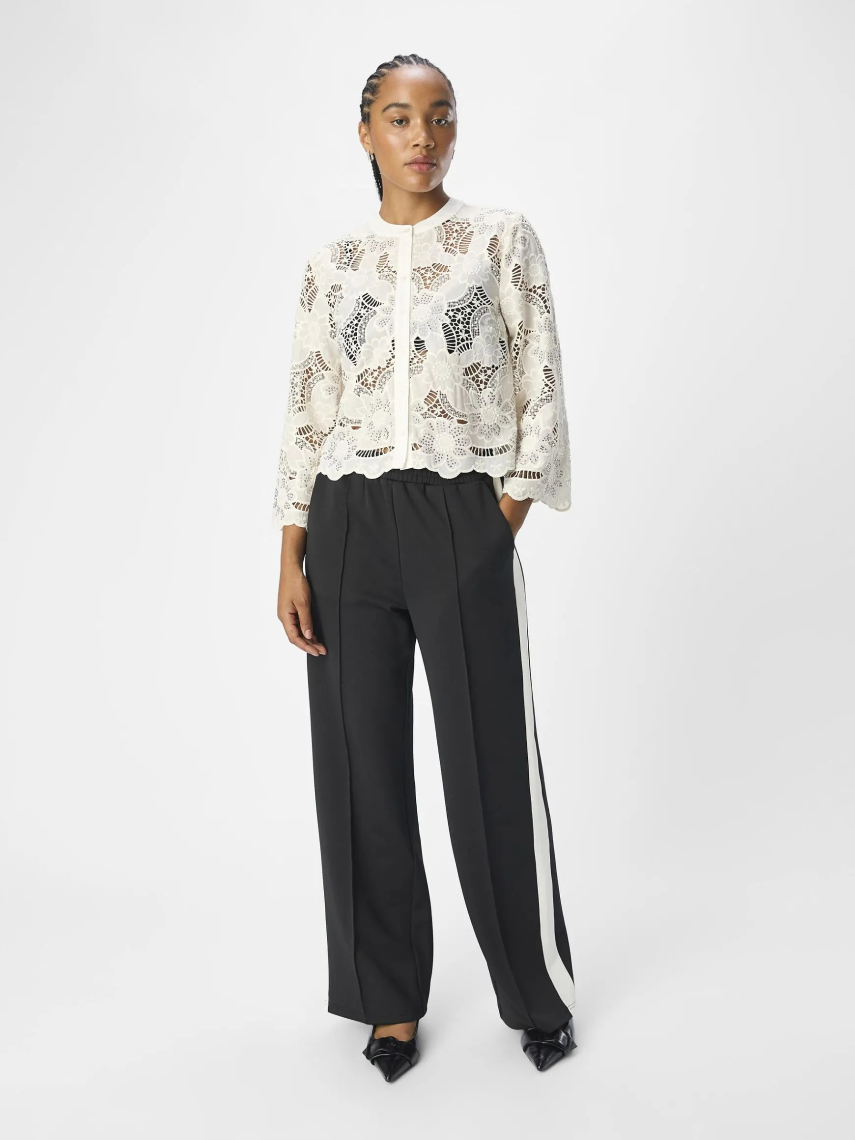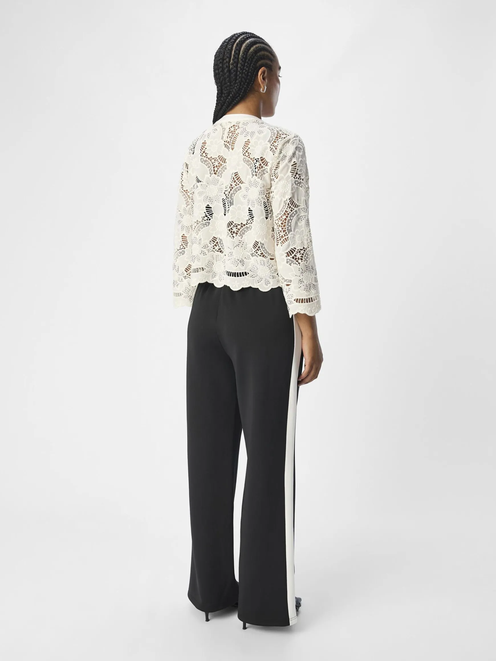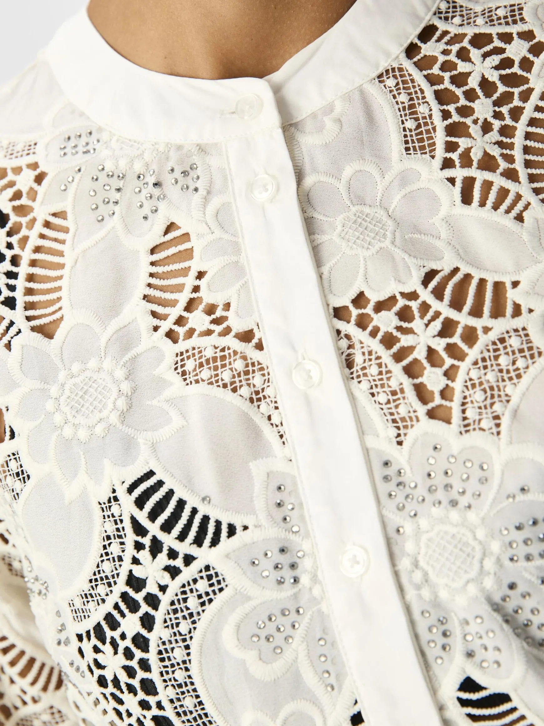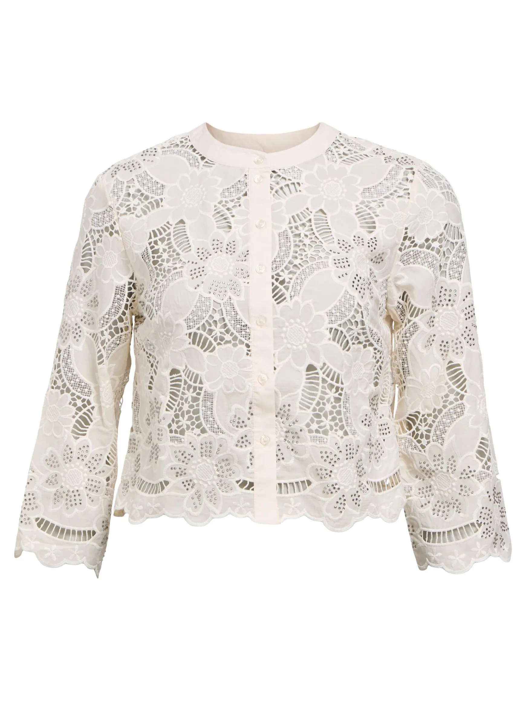 – Croppet blondeskjorte- Rund halsudskæring- Ærmer i 3/4-længde- Knapper foran- Bølgekanter- Uforet- Regular fit