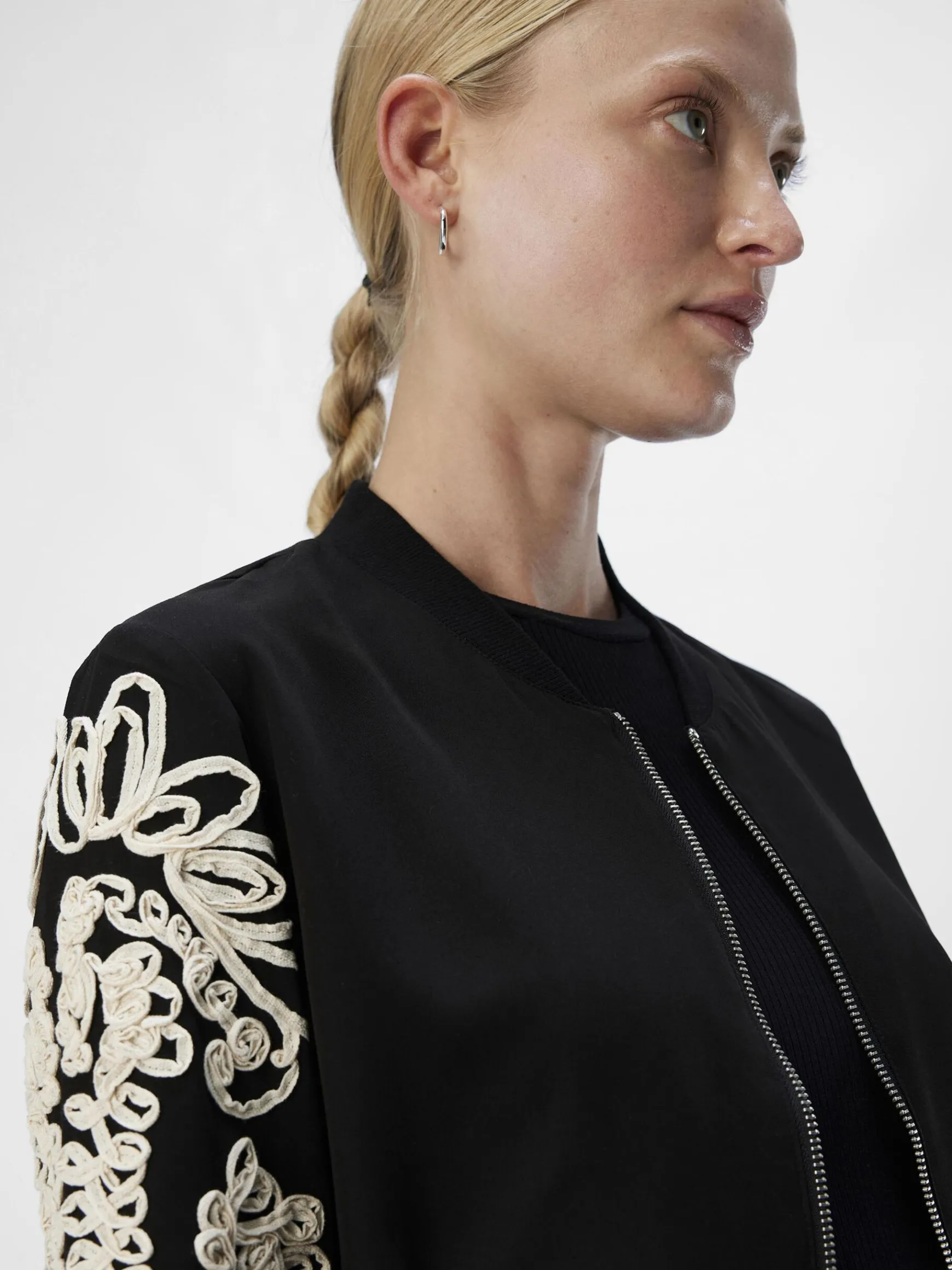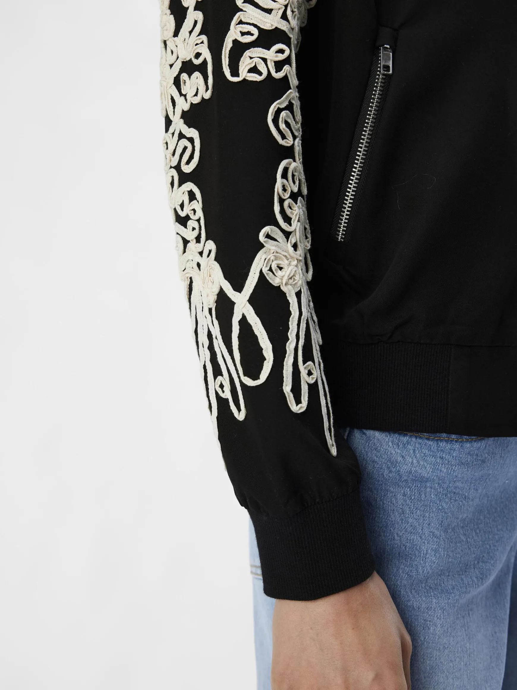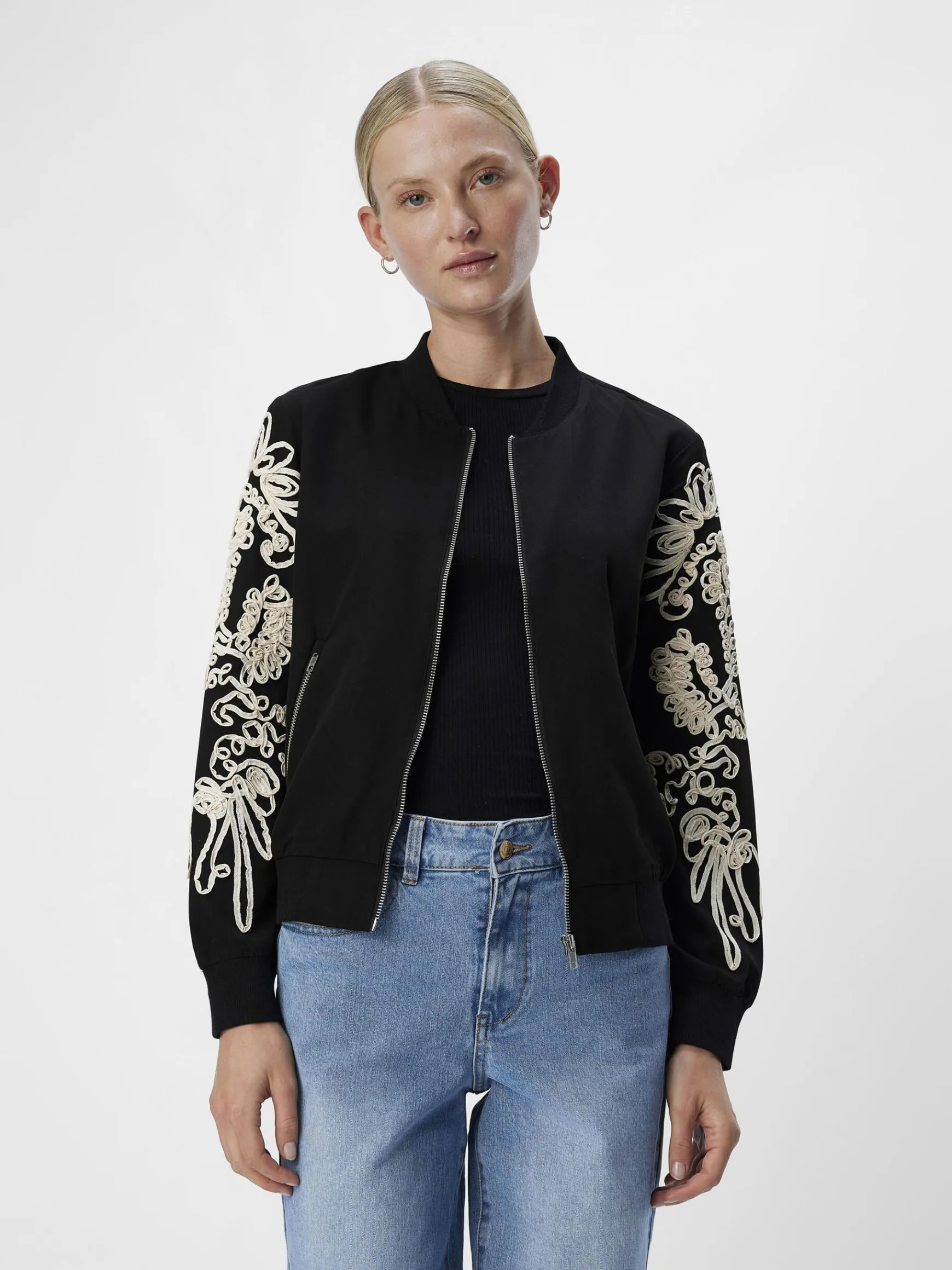 – Bomberjakke med broderede ærmer- Ribbet bomberkrave- Lynlås foran- Sidelommer med lynlås- Ribbede manchetter og kanter- Almindelig pasform