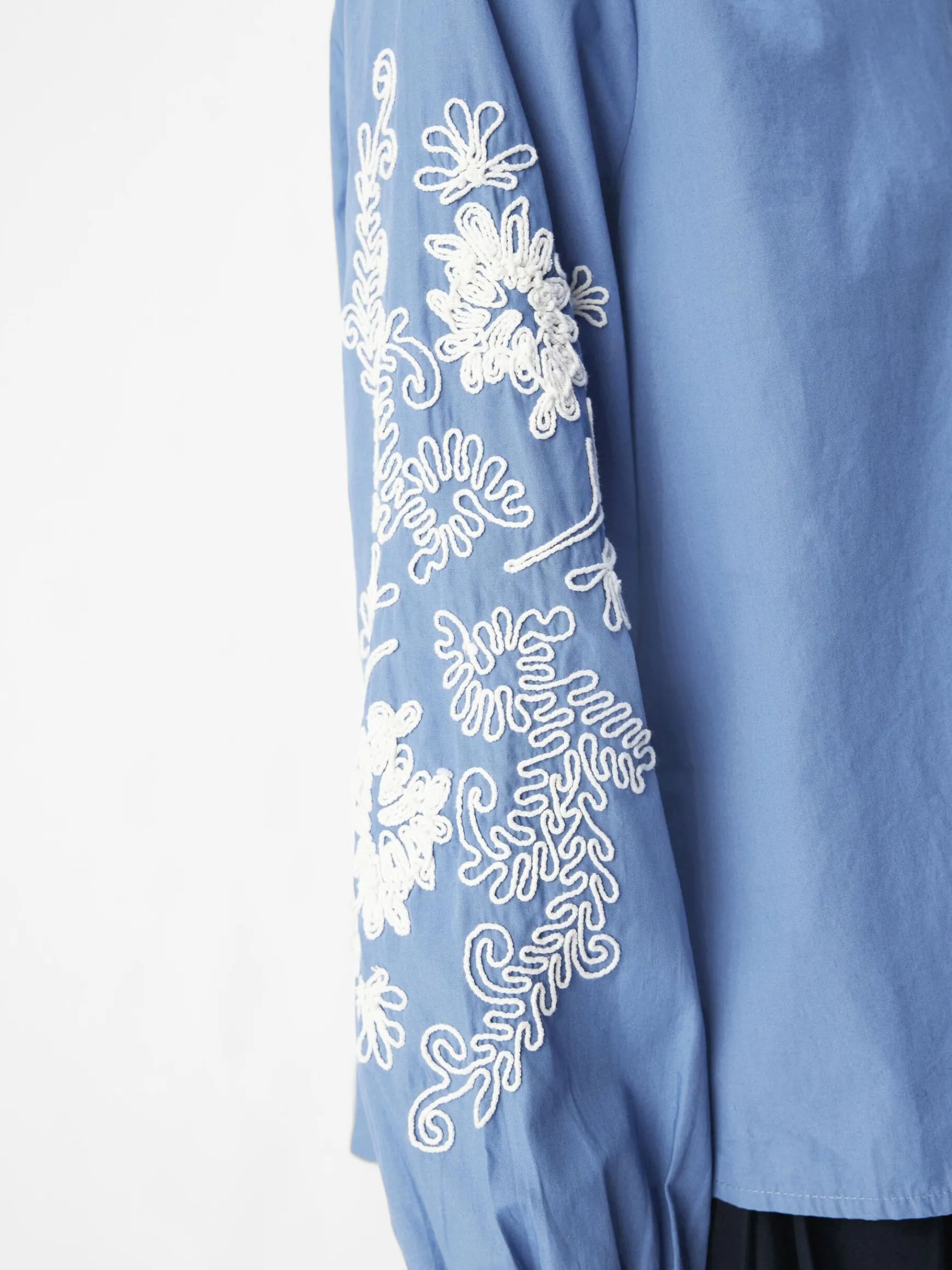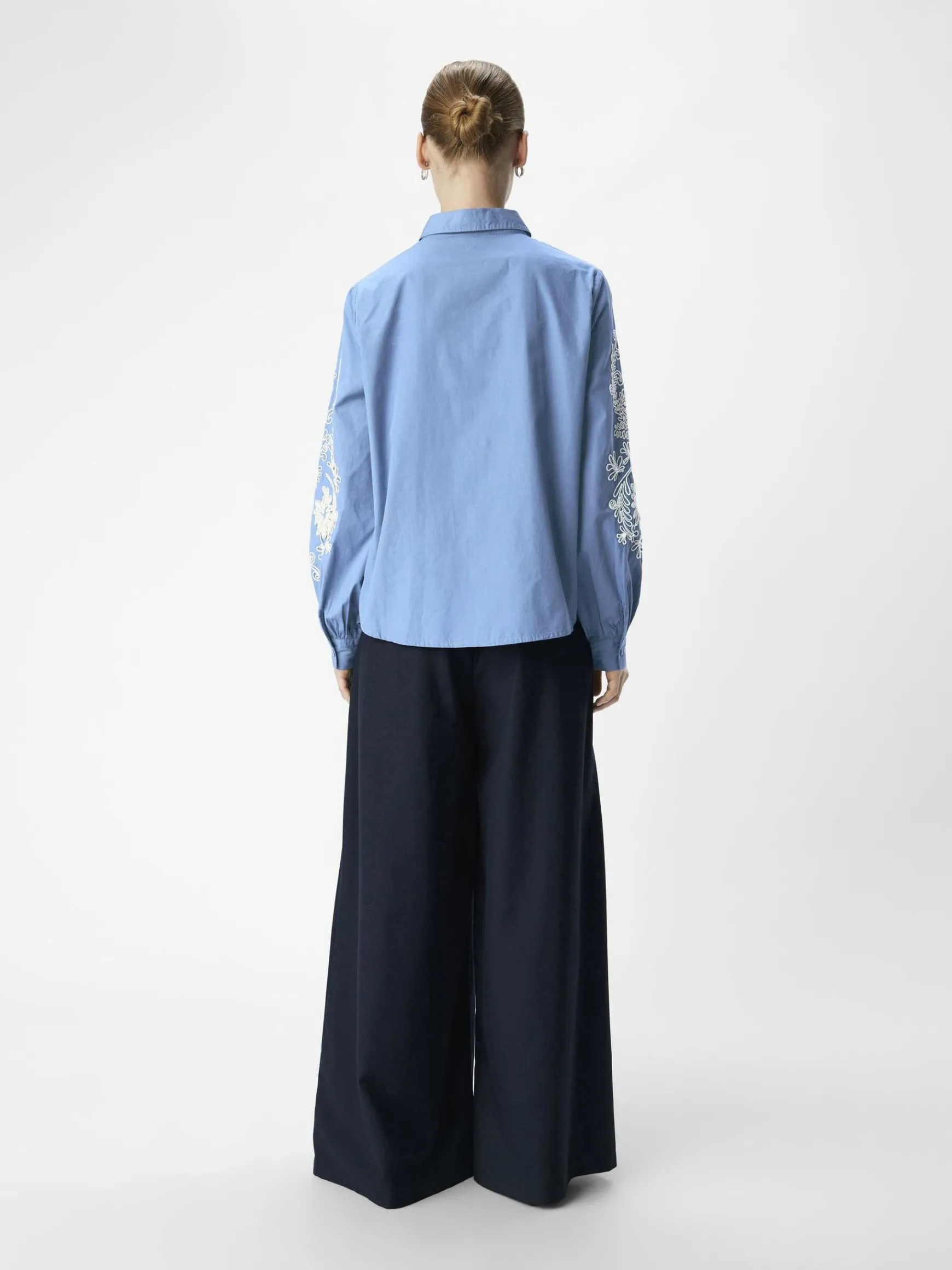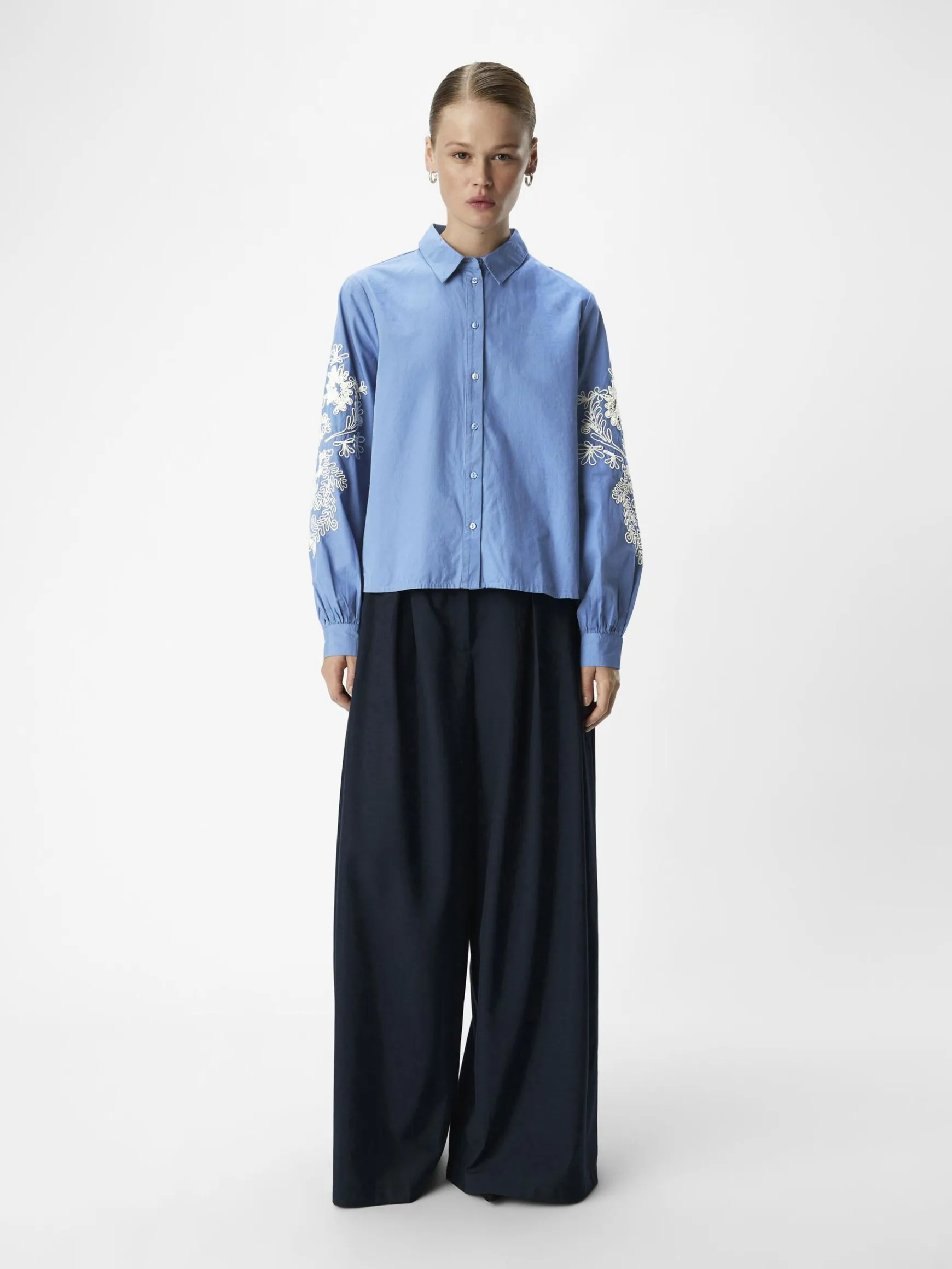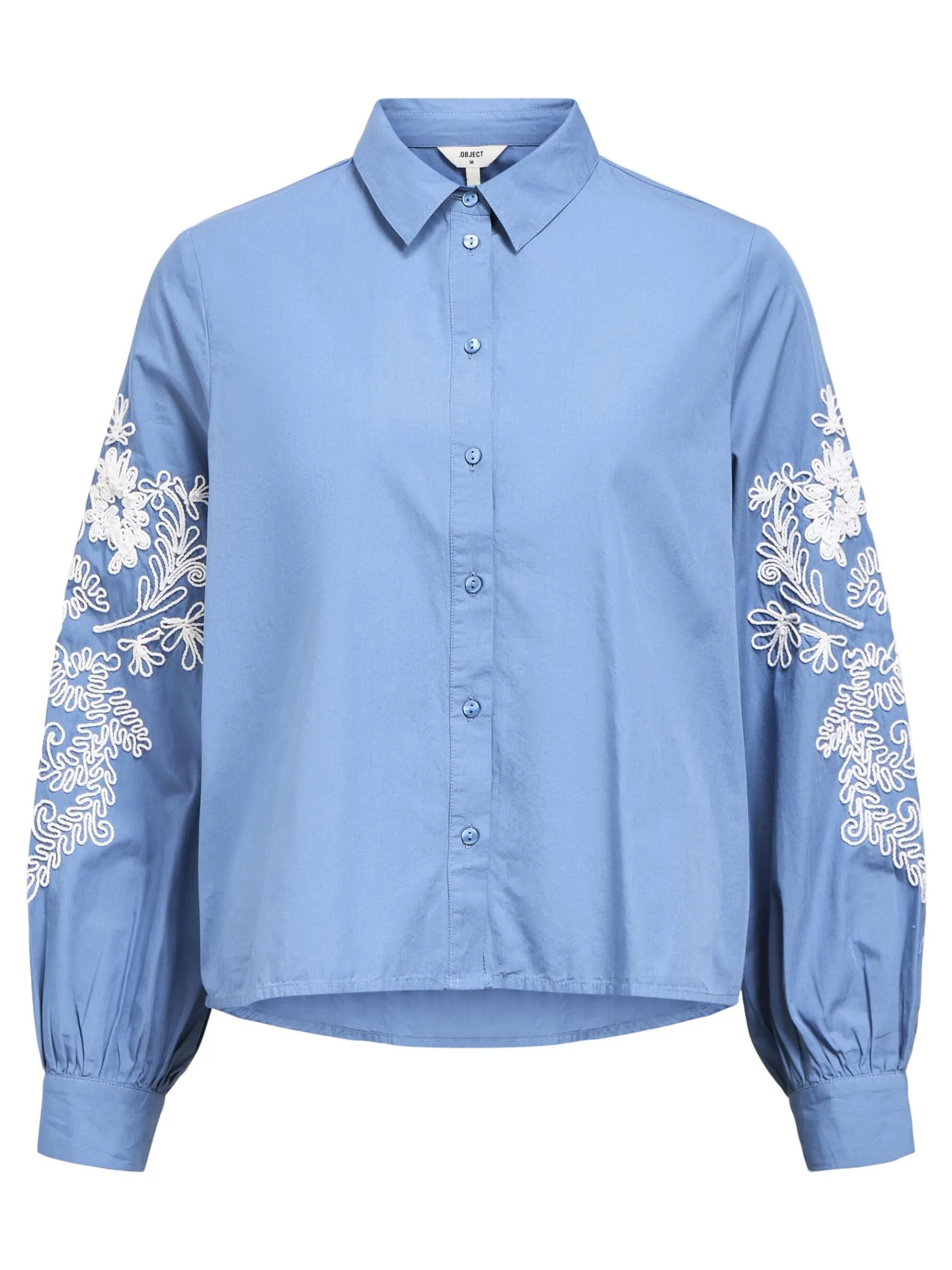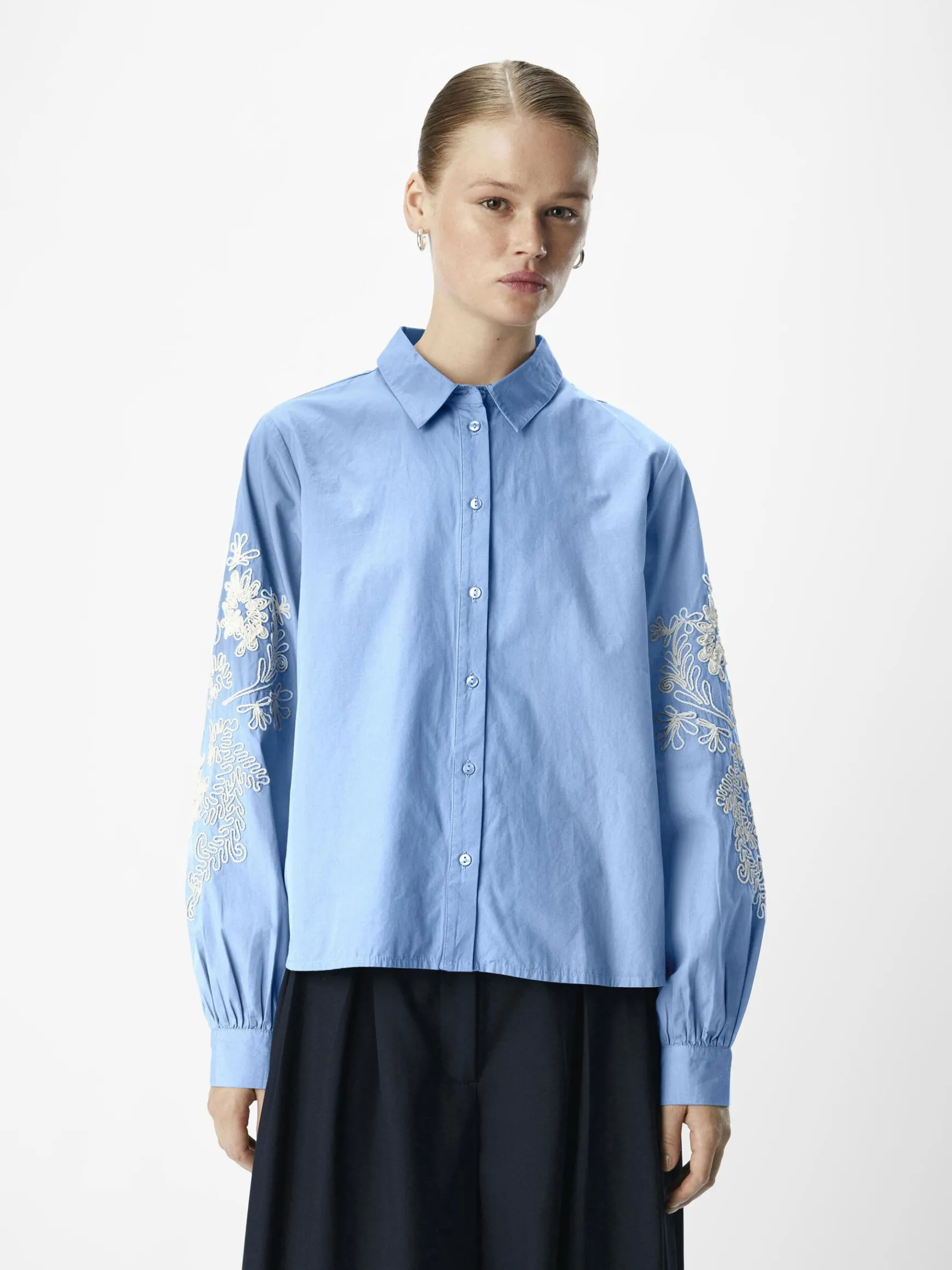 – Skjorte med blomsterbroderi på ærmerne- Almindelig krave- Lange voluminøse ærmer- Manchetter med knap- Knapper foran- Løs pasform