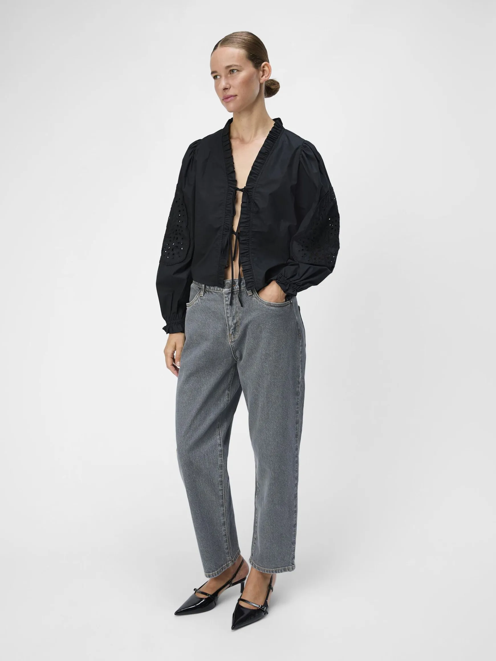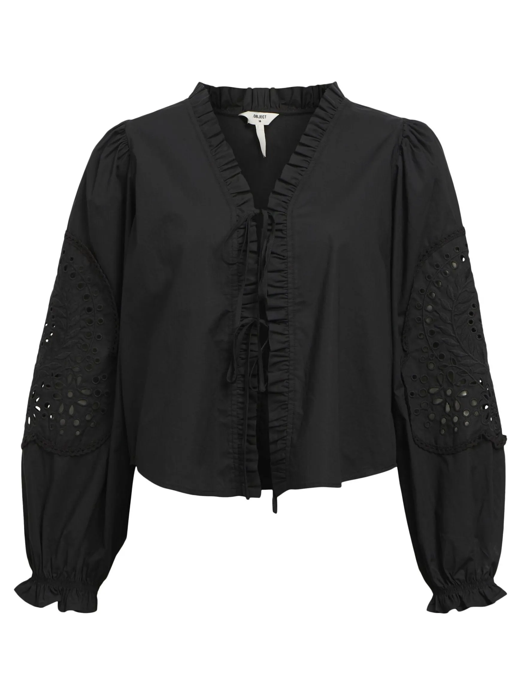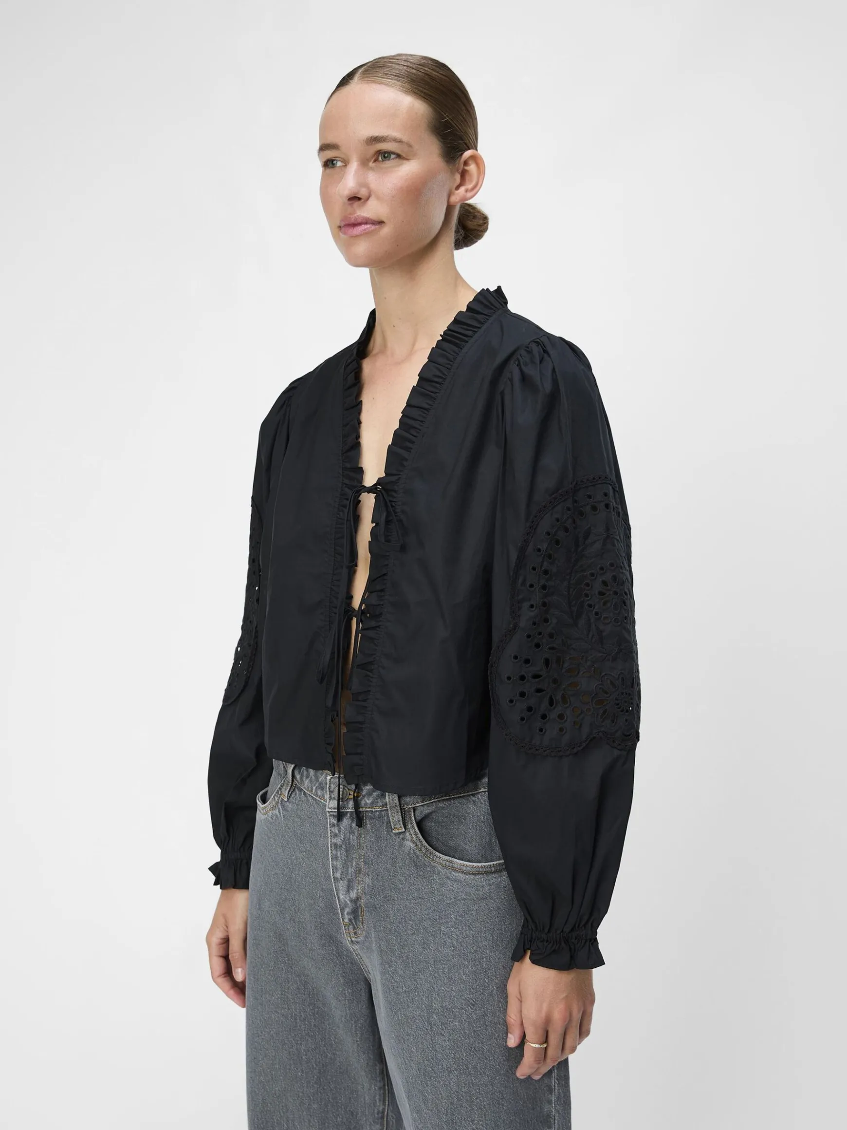 – Broderet top med bindelukning foran- V-udskæring med flæser- Lange ballonærmer- Elastiske ærmekanter med vide- Almindelig pasform