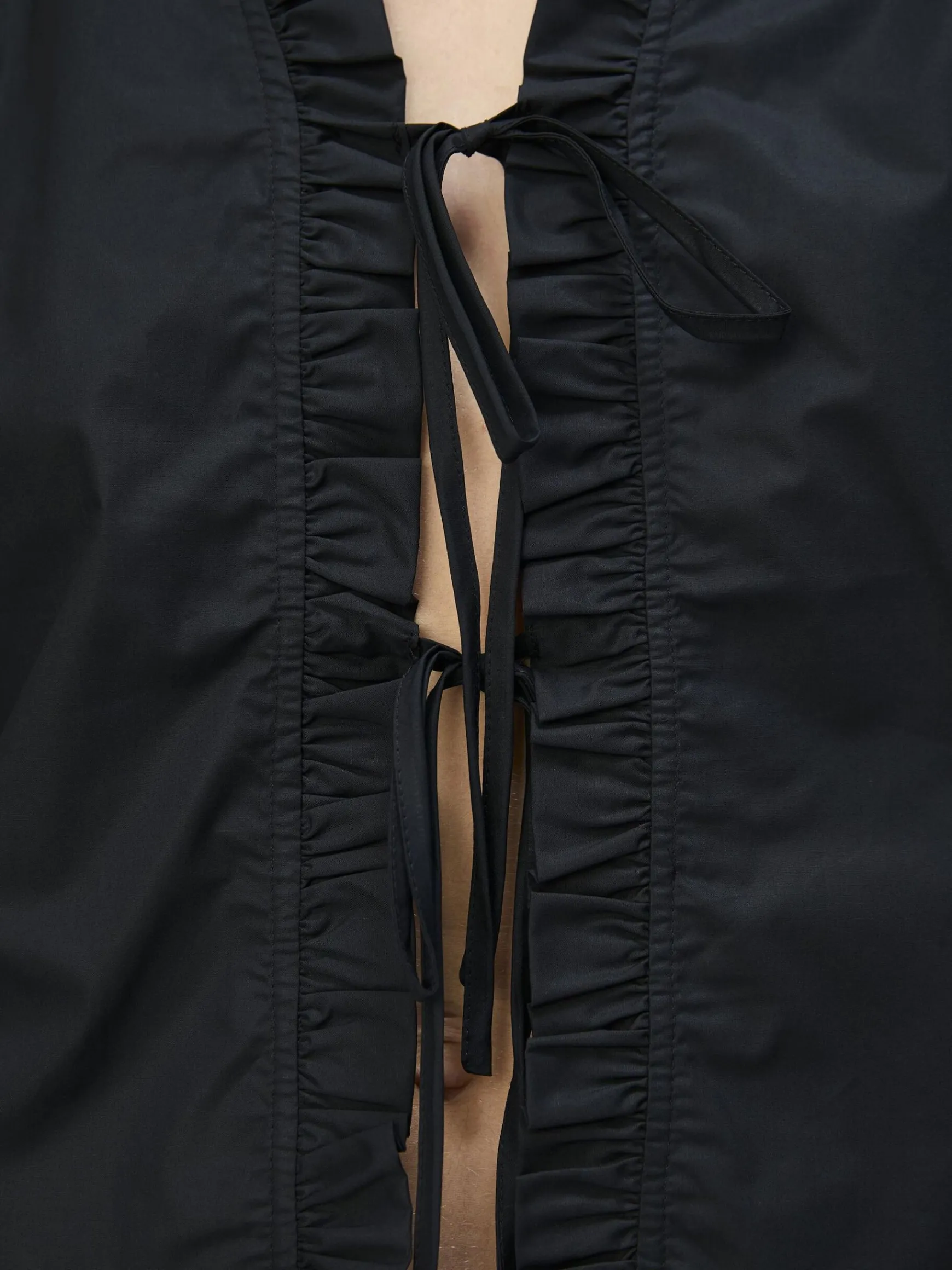 – Broderet top med bindelukning foran- V-udskæring med flæser- Lange ballonærmer- Elastiske ærmekanter med vide- Alm…