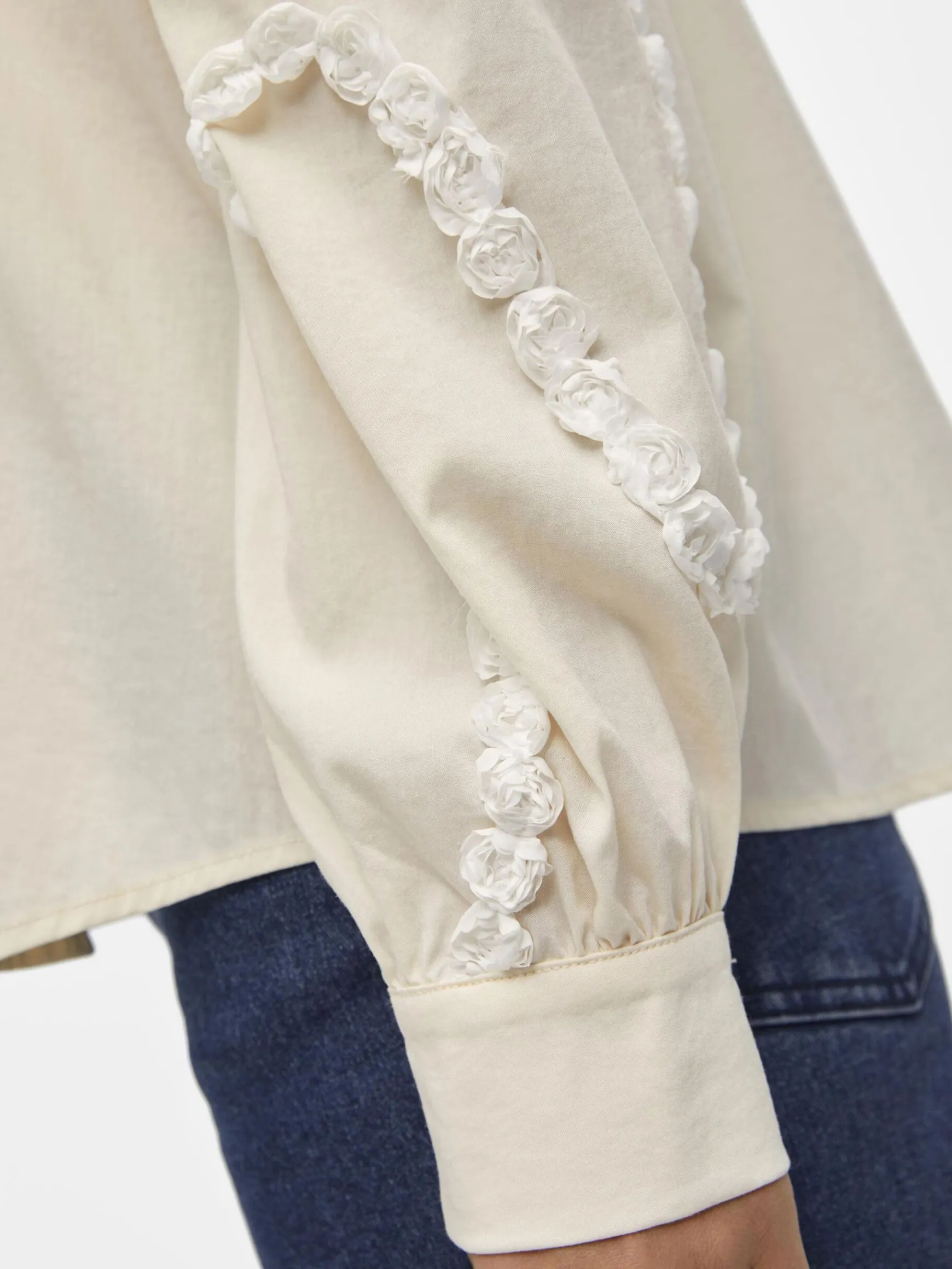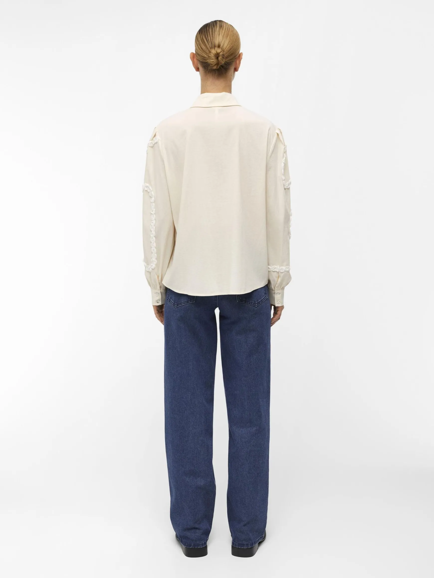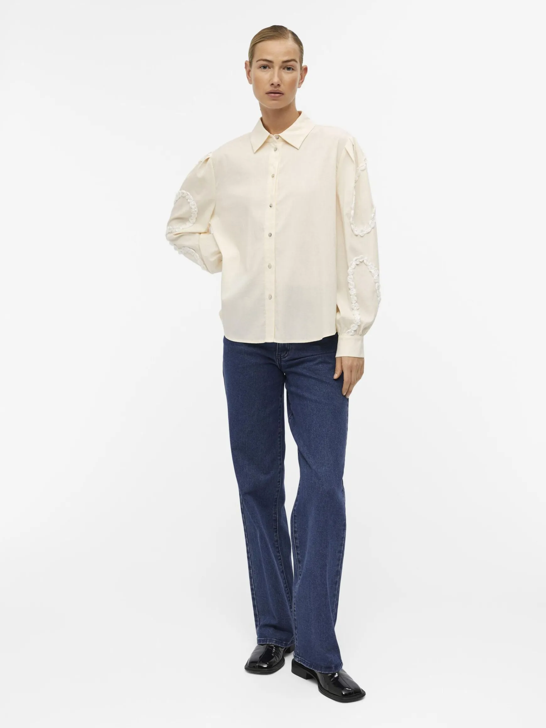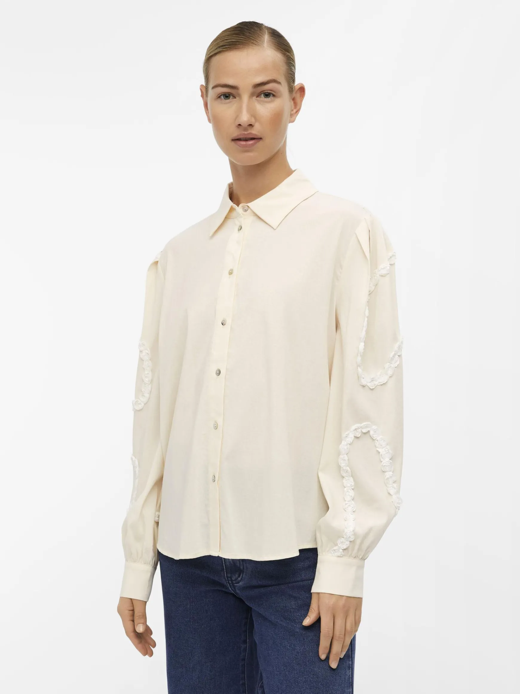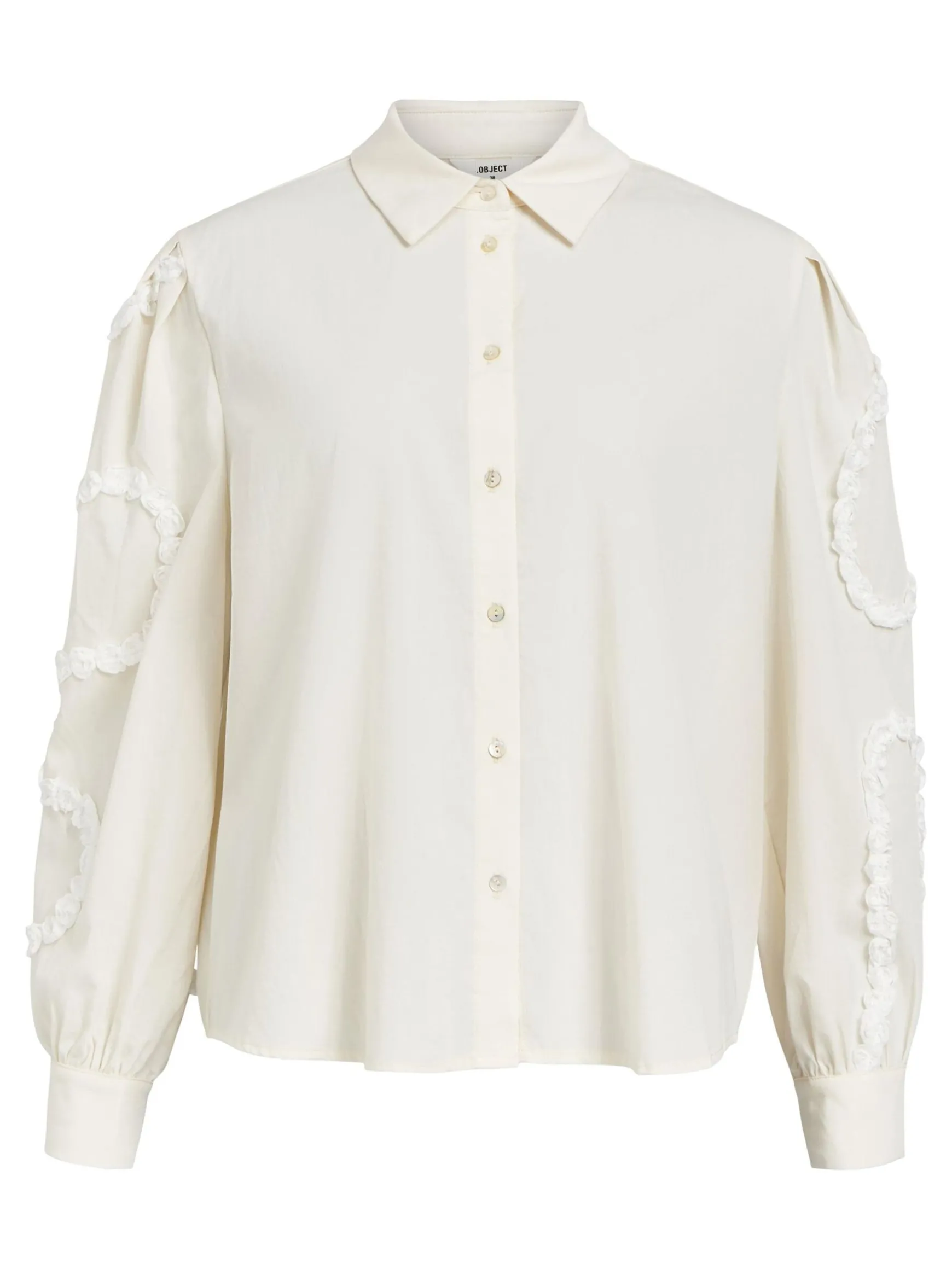 – Langærmet skjorte- Broderede detaljer på voluminøse ærmer- Plisserede detaljer på skuldrene- Manchetter med knap- Knapper foran- Almindelig pasform