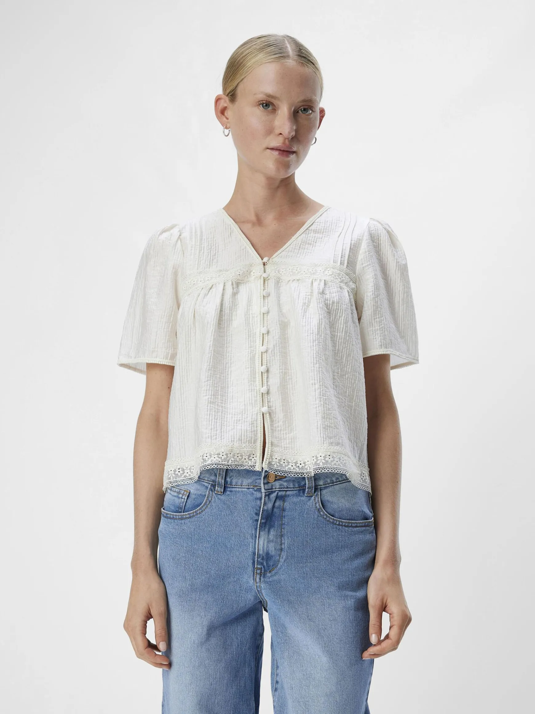 – Kortærmet broderet top – V-hals- Betrukket knap-detalje- Blondedetalje- Plisseringer i skuldrene- Almindelig pasform