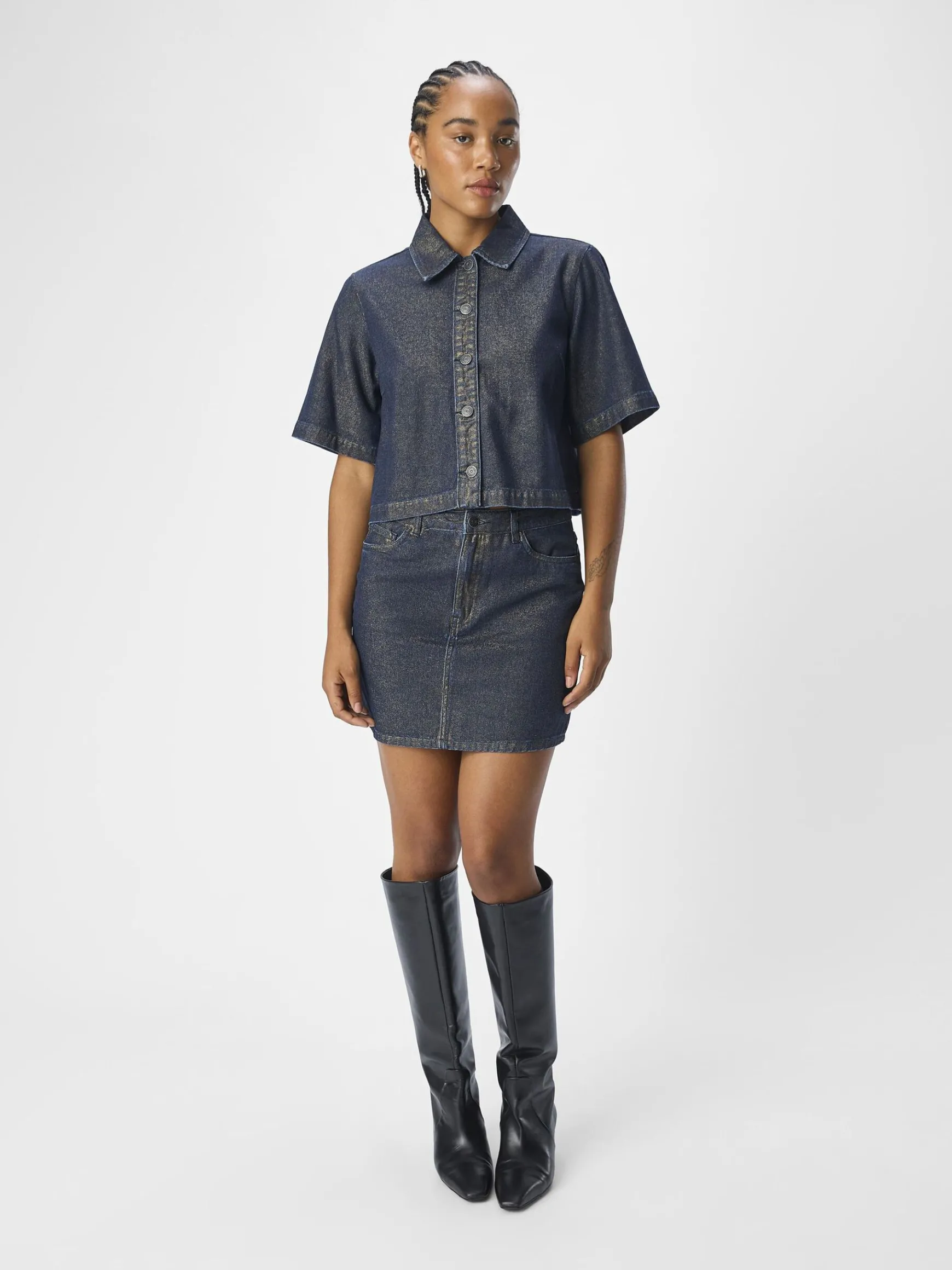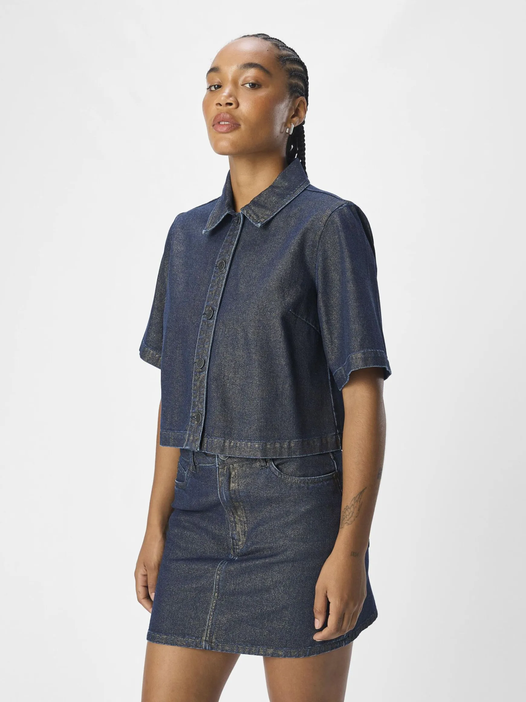 – Skinnende coatet denimskjorte- Almindelig krave- Korte ærmer- Knapper foran- Cropped firkantet pasformINDEHOLDER GENA…