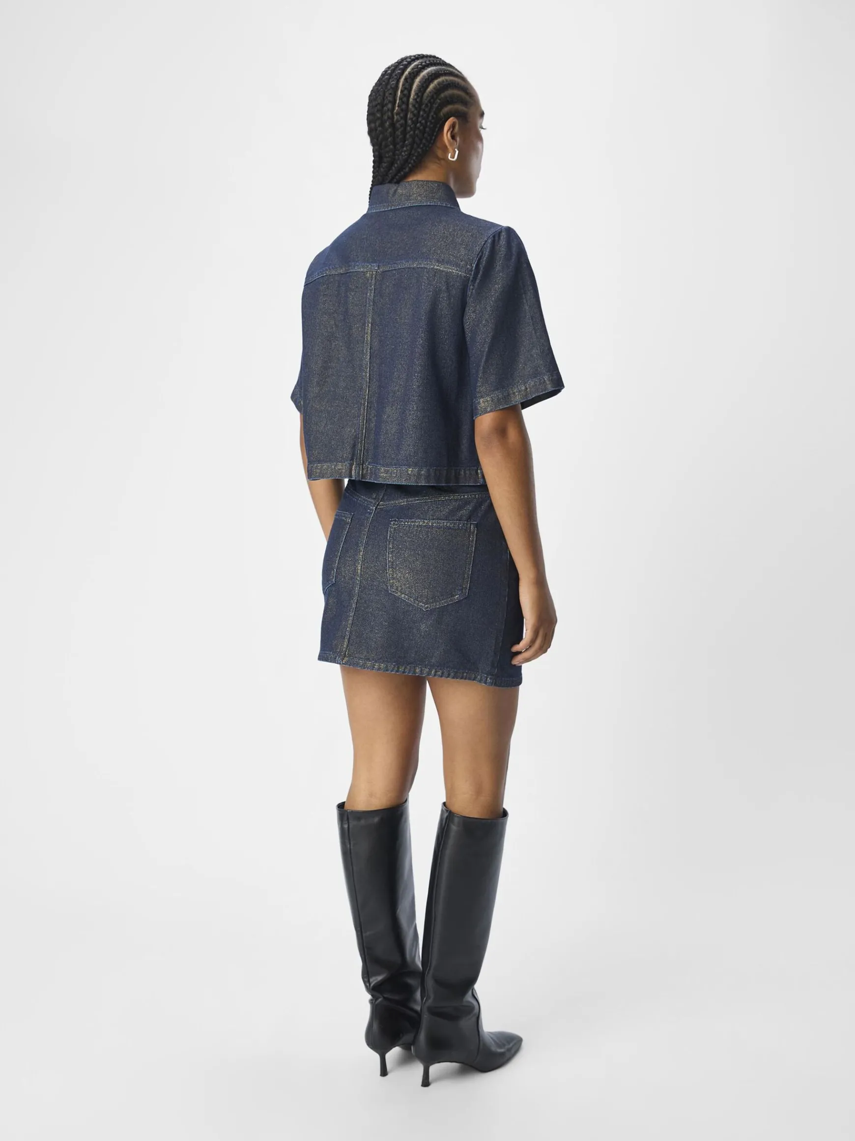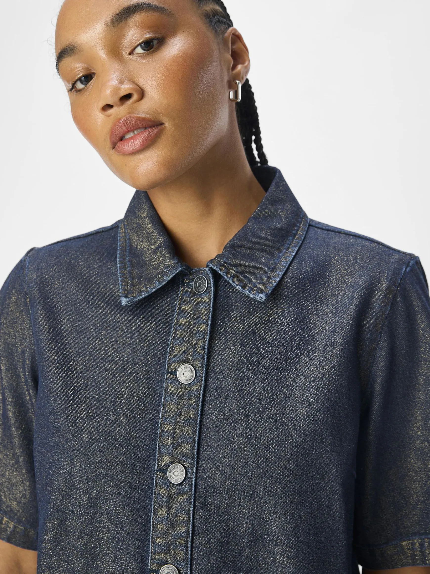 – Skinnende coatet denimskjorte- Almindelig krave- Korte ærmer- Knapper foran- Cropped firkantet pasform