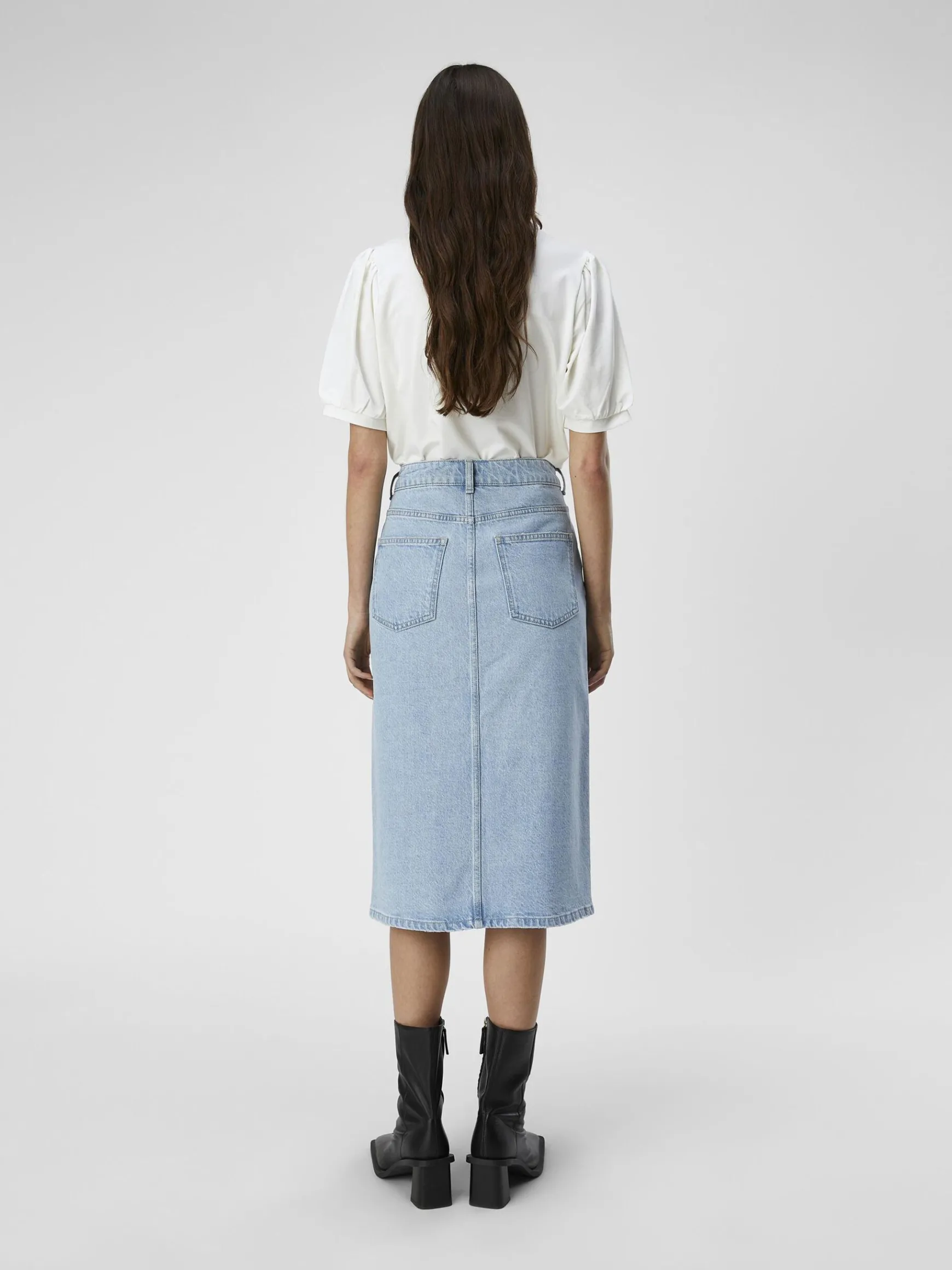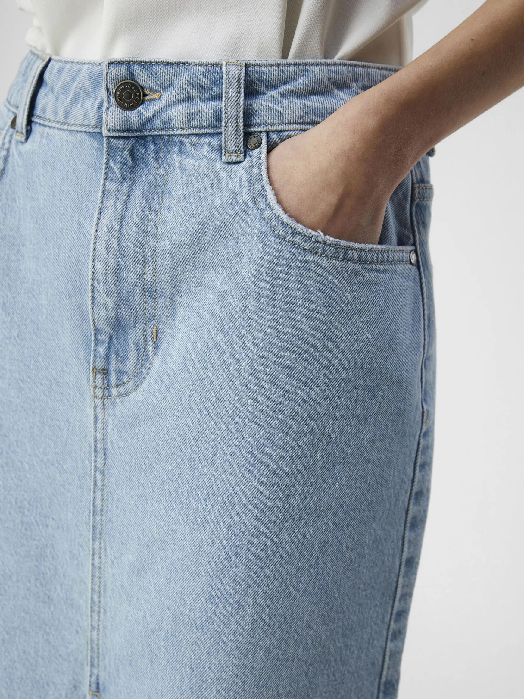 -Denim-midinederdel med mellemhøj talje-Design med 5 lommer-Slidsdetalje foran-Lynlåsgylp med knaplukning-Bæltestropper-Modellen er iført størrelse 36-Lavet med mere ansvarlige materialer