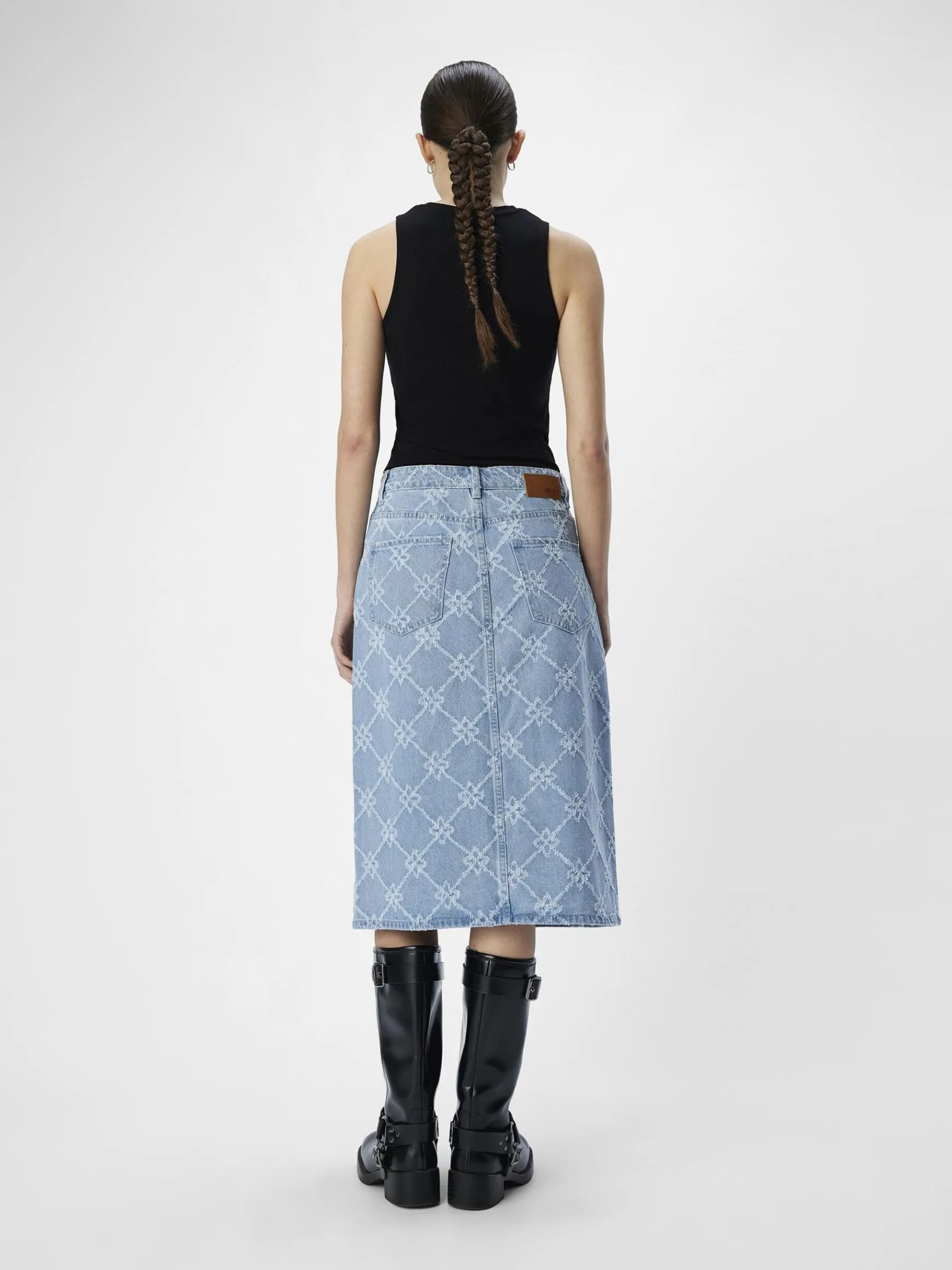 – Printet denim-midinederdel- Høj talje- Mønster med slidt effekt- Slidsdetalje foran- Lynlås i gylp med knaplukning- Bæltestropper- Jacron-patch- Regular fit