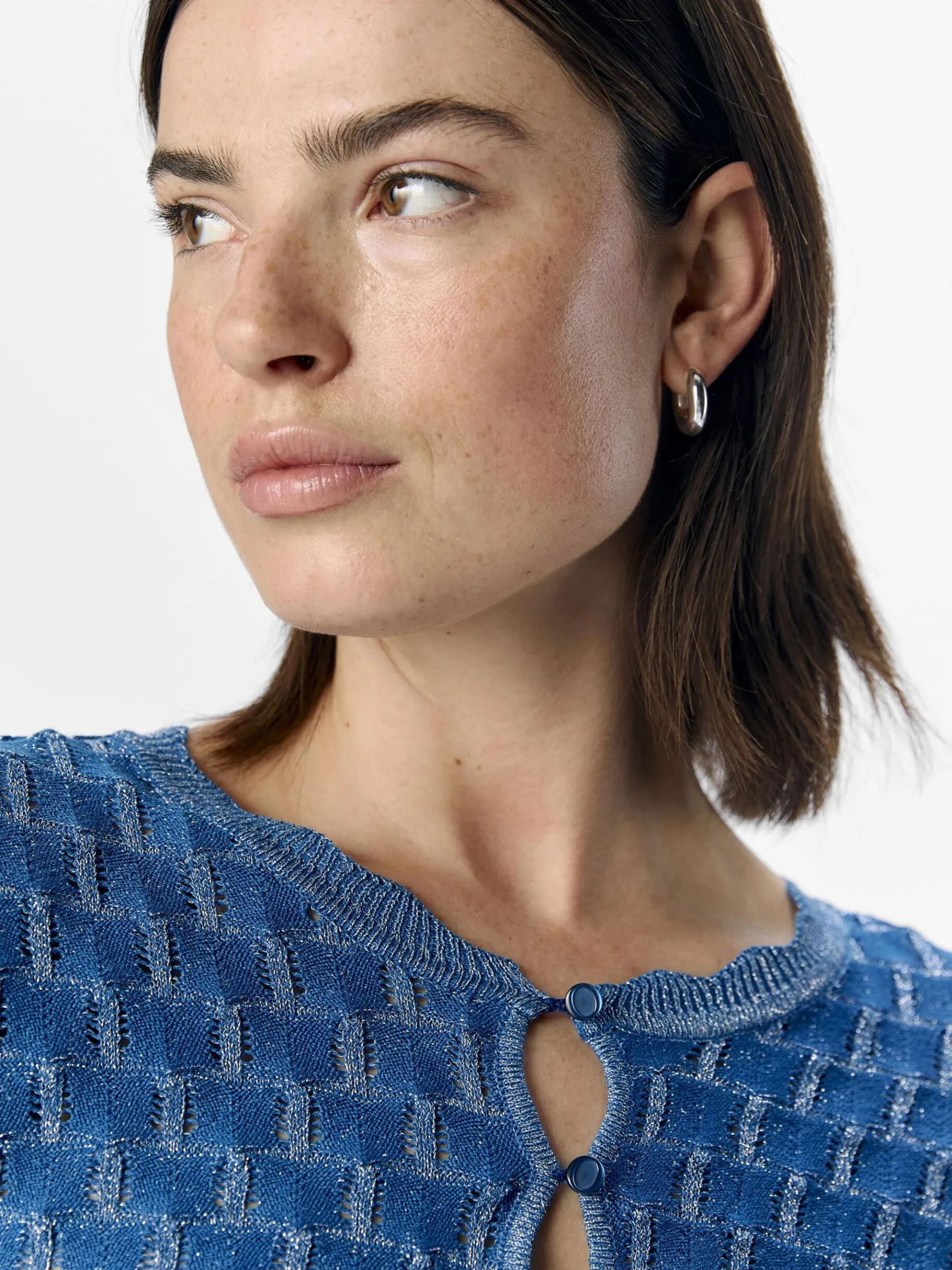 – Tekstureret detaljeret cardigan- Rund halsudskæring- Lange ærmer- Fine ribstrikkede ærmekanter med bølgekant- Slim fit