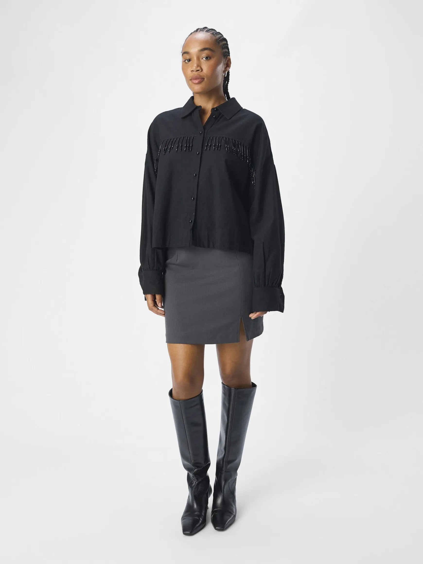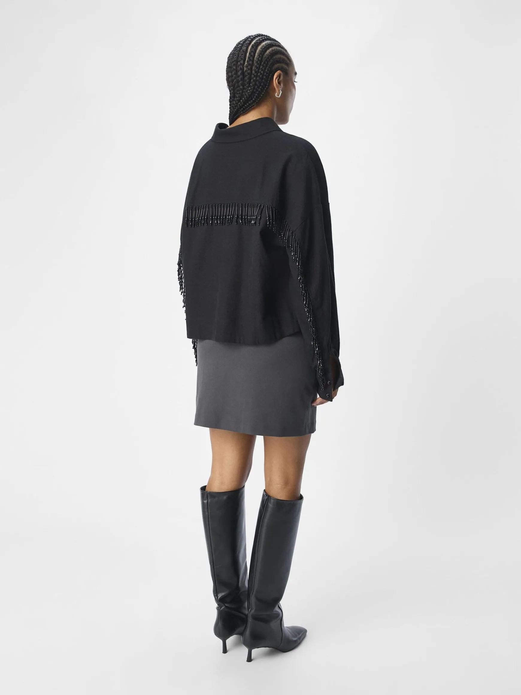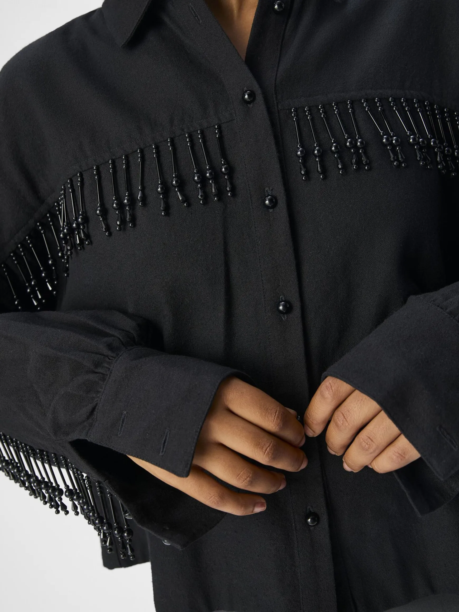 – Skjorte med perlebesat frynsedetalje- Almindelig krave- Lange ærmer med knappede ærmekanter- Knapper foran- Løs pasform