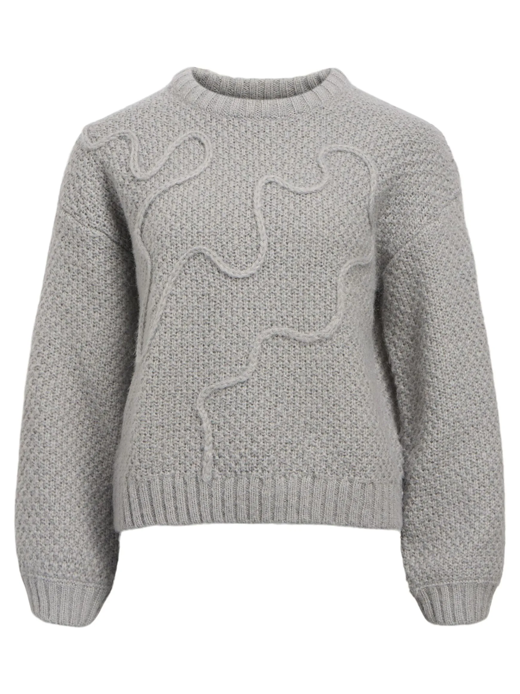 – Strikket trøje med chunky detalje- Rund halsudskæring- Sænkede skuldre- Lange ærmer- Tætsiddende ærmekanter- Rib…