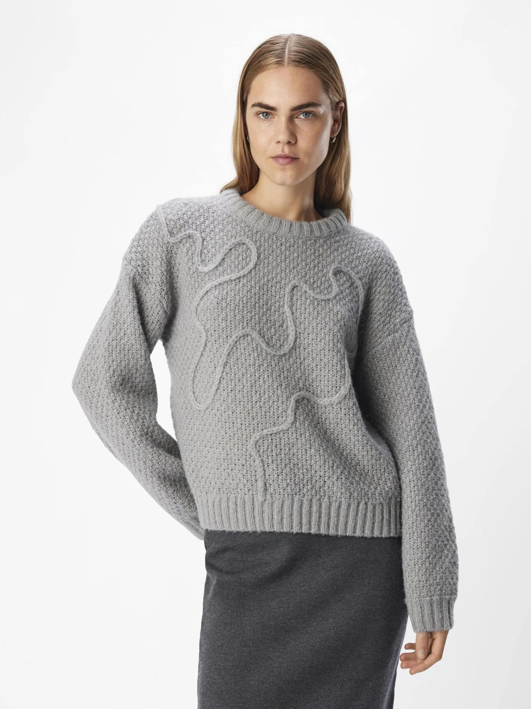 – Strikket trøje med chunky detalje- Rund halsudskæring- Sænkede skuldre- Lange ærmer- Tætsiddende ærmekanter- Ribbede kanter- Regular fit