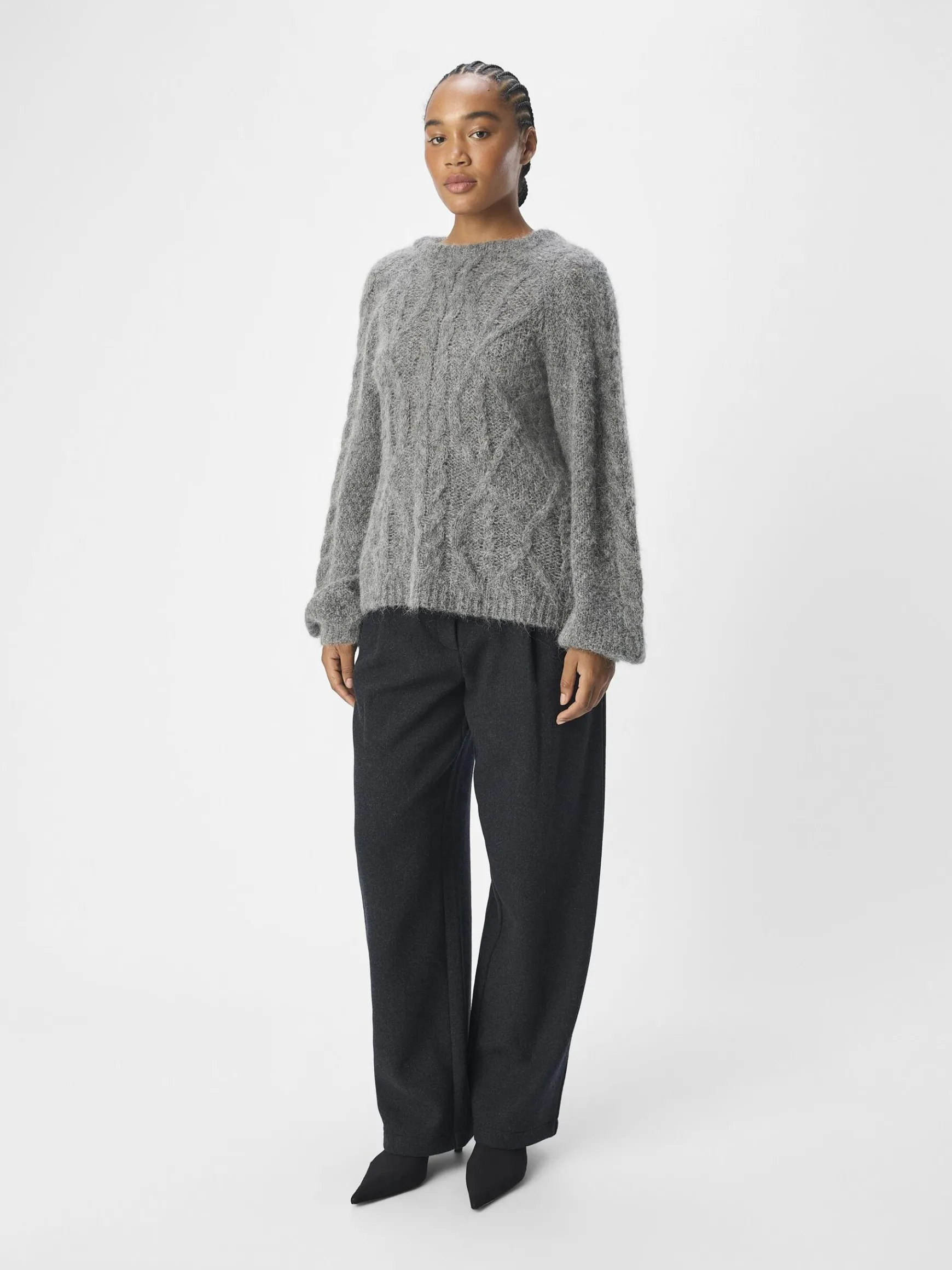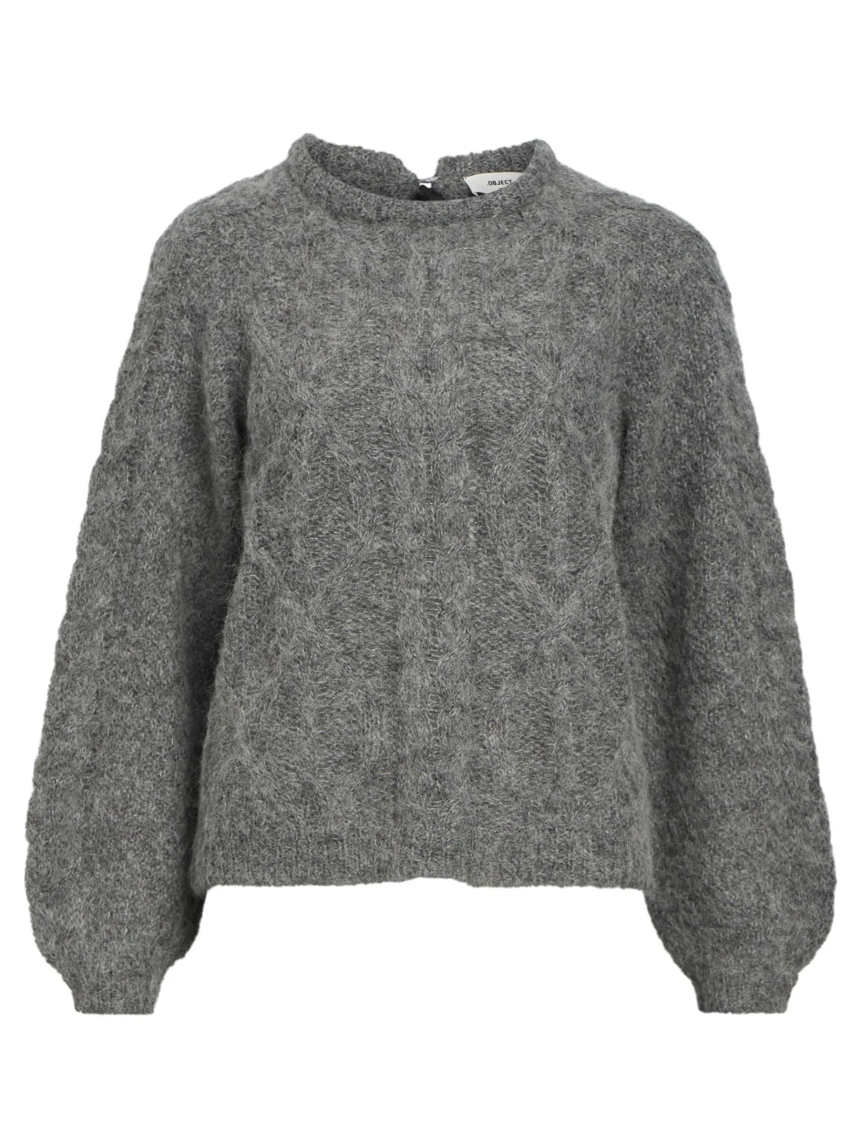 – Kabelstrikket trøje med åben ryg- Sløjfelukning- Rund halsudskæring- Lange voluminøse ærmer- Ribbede kanter- Almindelig pasform