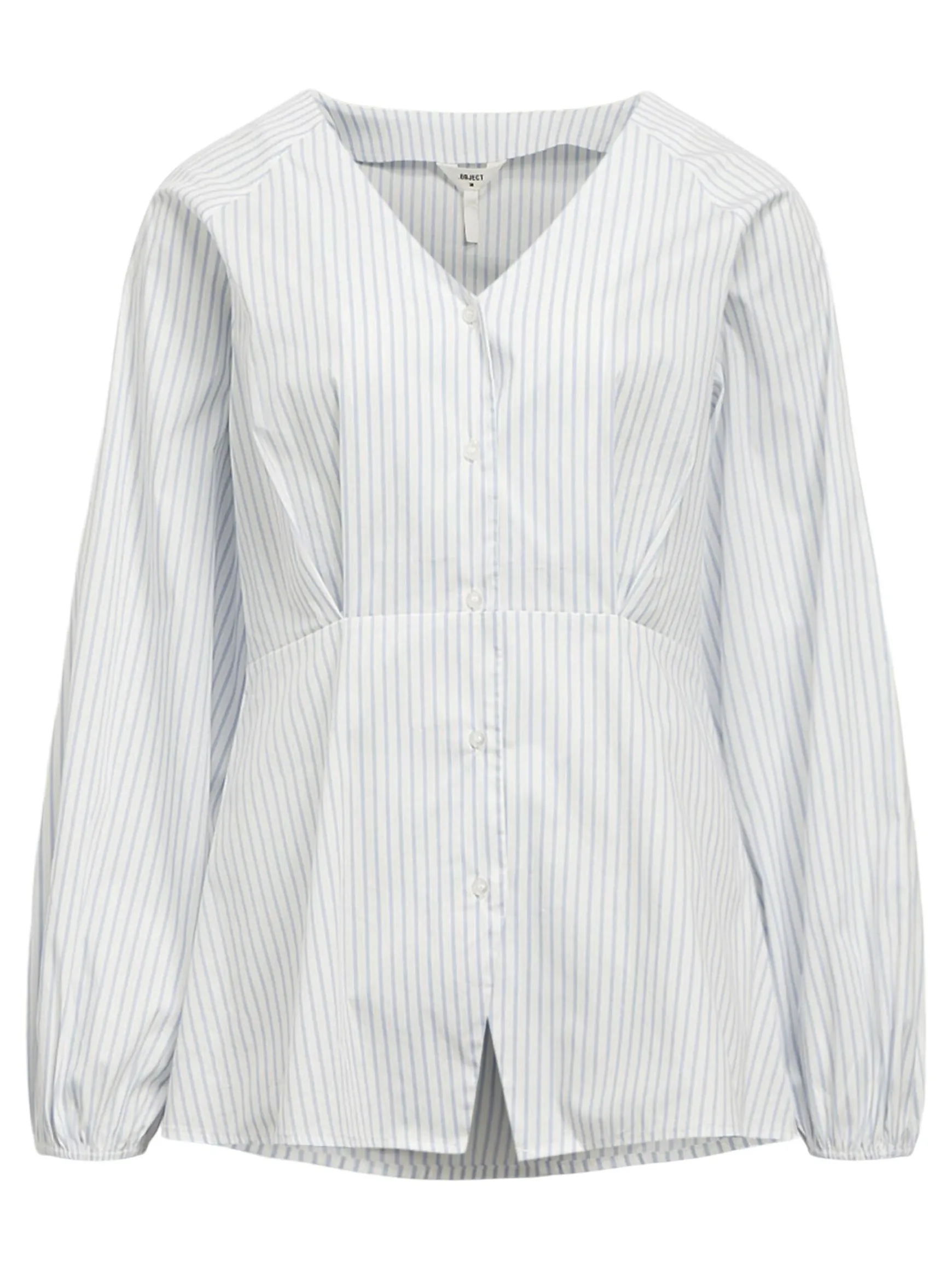 – Skræddersyet skjorte med V-hals- Elastik bagpå- Lange voluminøse ærmer- Elastiske manchetter- Knapper foran- Skulpteret fit- Modellen er iført størrelse 36