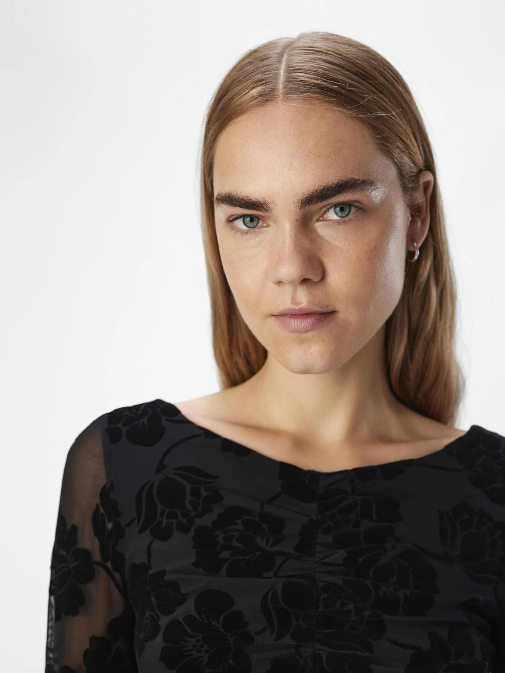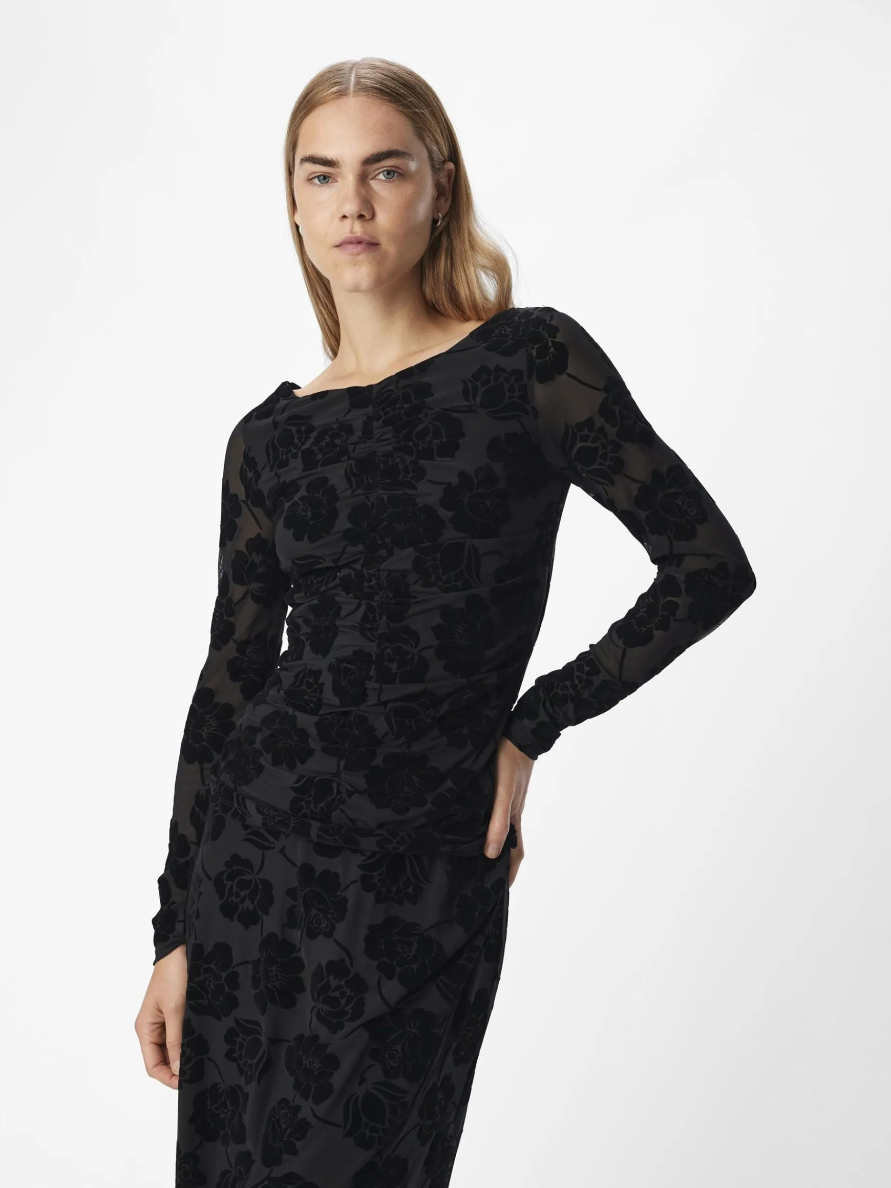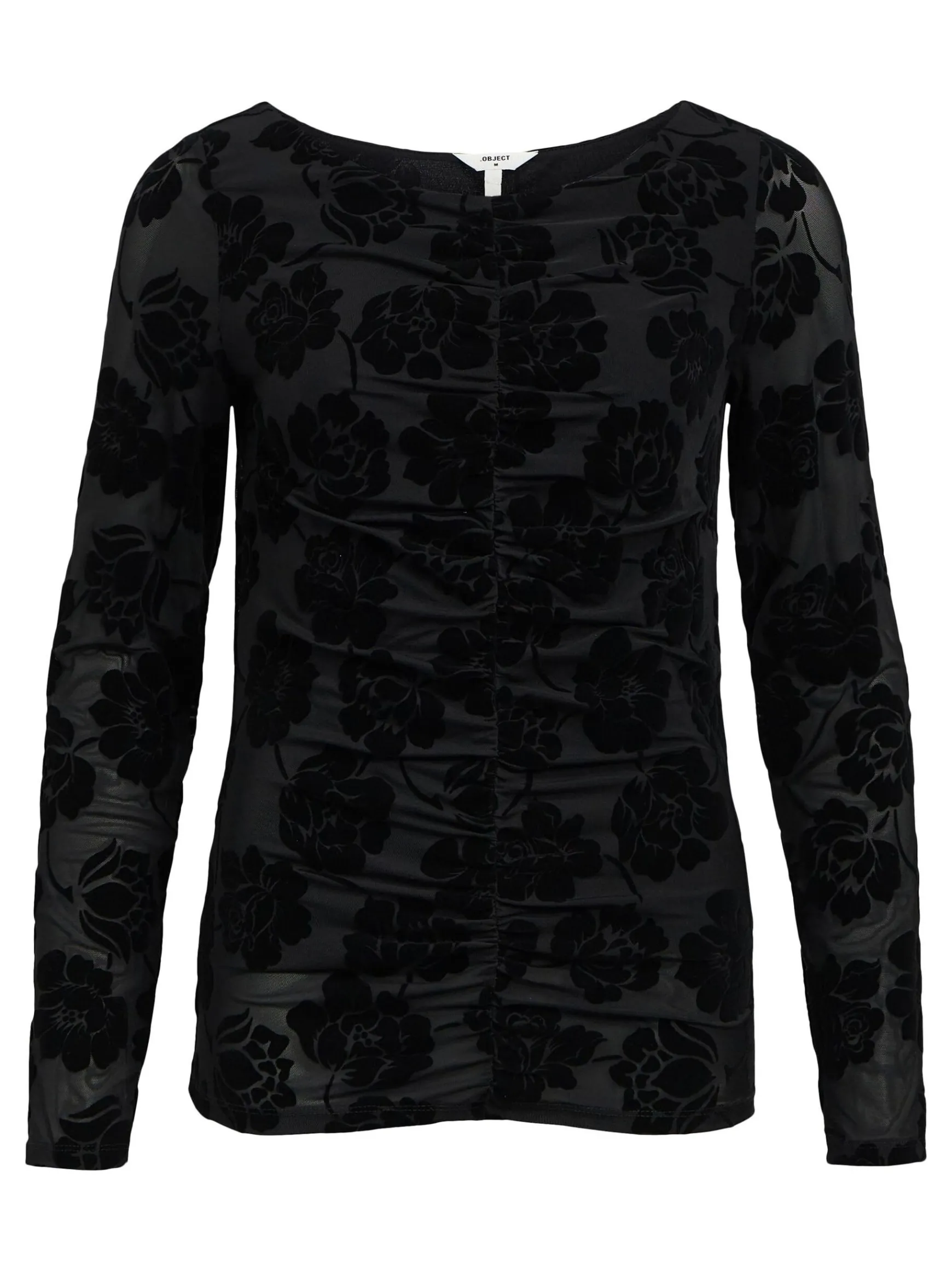 – Velourtop med bådudskæring- Blomstret jacquard-design- Lange ærmer- Stofsamlingseffekt- Slim fitStylenavn: OBJALMA