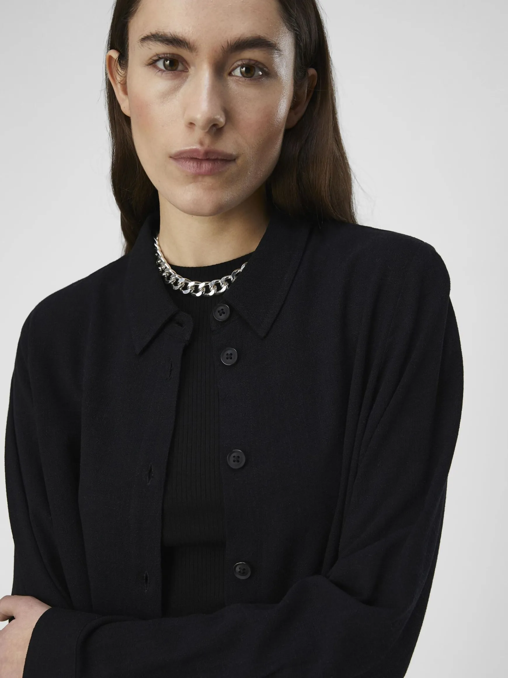 – Almindelig krave- Knapper foran- Sænkede skuldre- Lange ærmer- Manchetter med knap- Marmorknapper- Løs pasform- Fre…