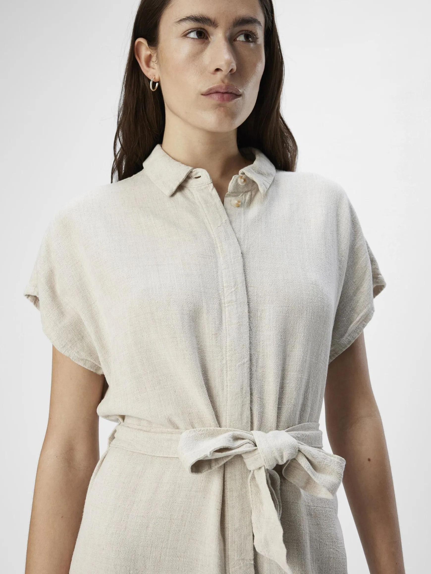 – Cut-away-krave- Sænkede skuldre- Korte ærmer-Knapper foran skjult af stolpe- Bindebælte i taljen- Baseball-sømkant- Midi-længde- Regular fit- Fremstillet med mere ansvarligt stof- Modellen er iført størrelse 36- Modelsens højde er 173 cm
