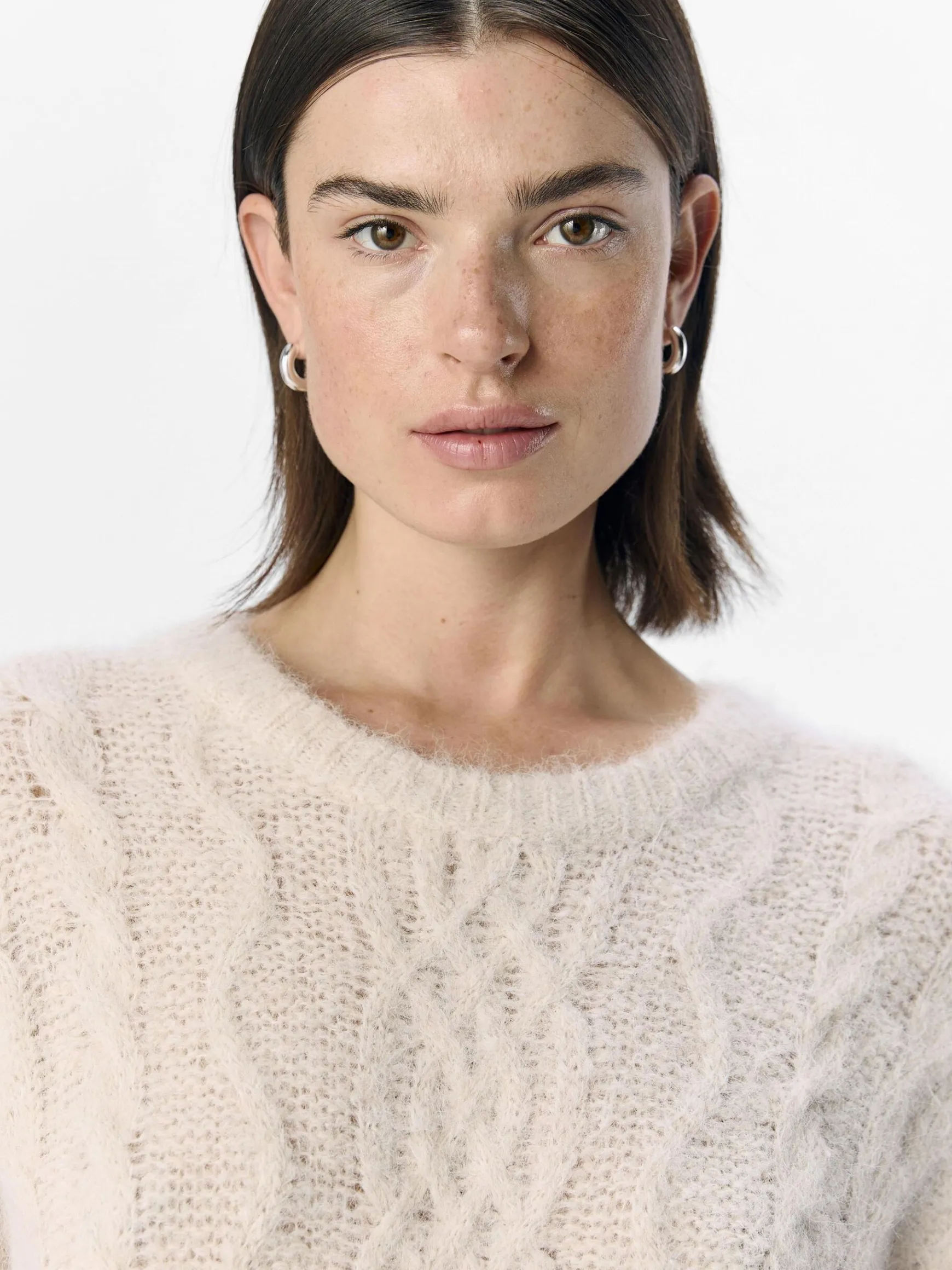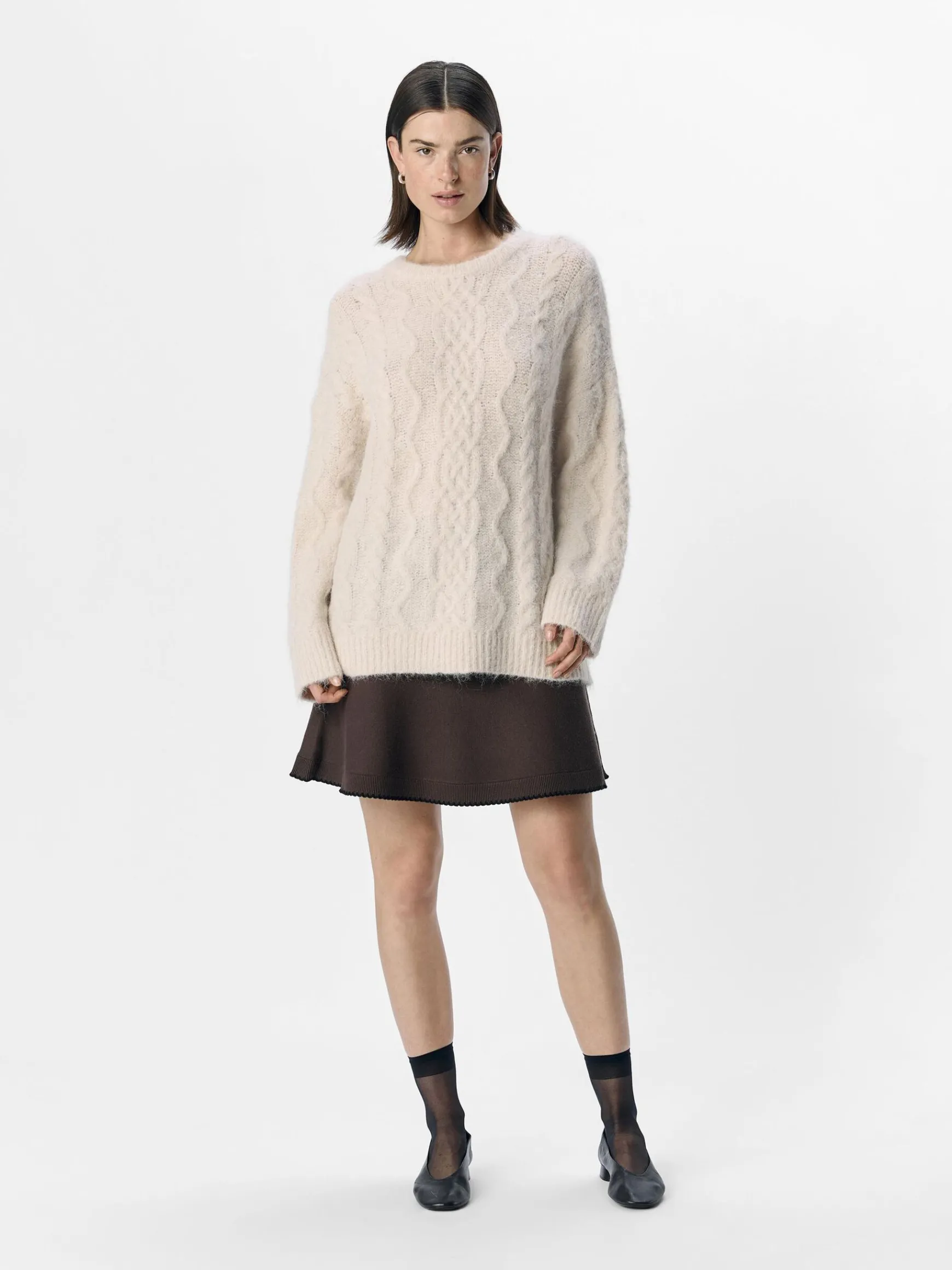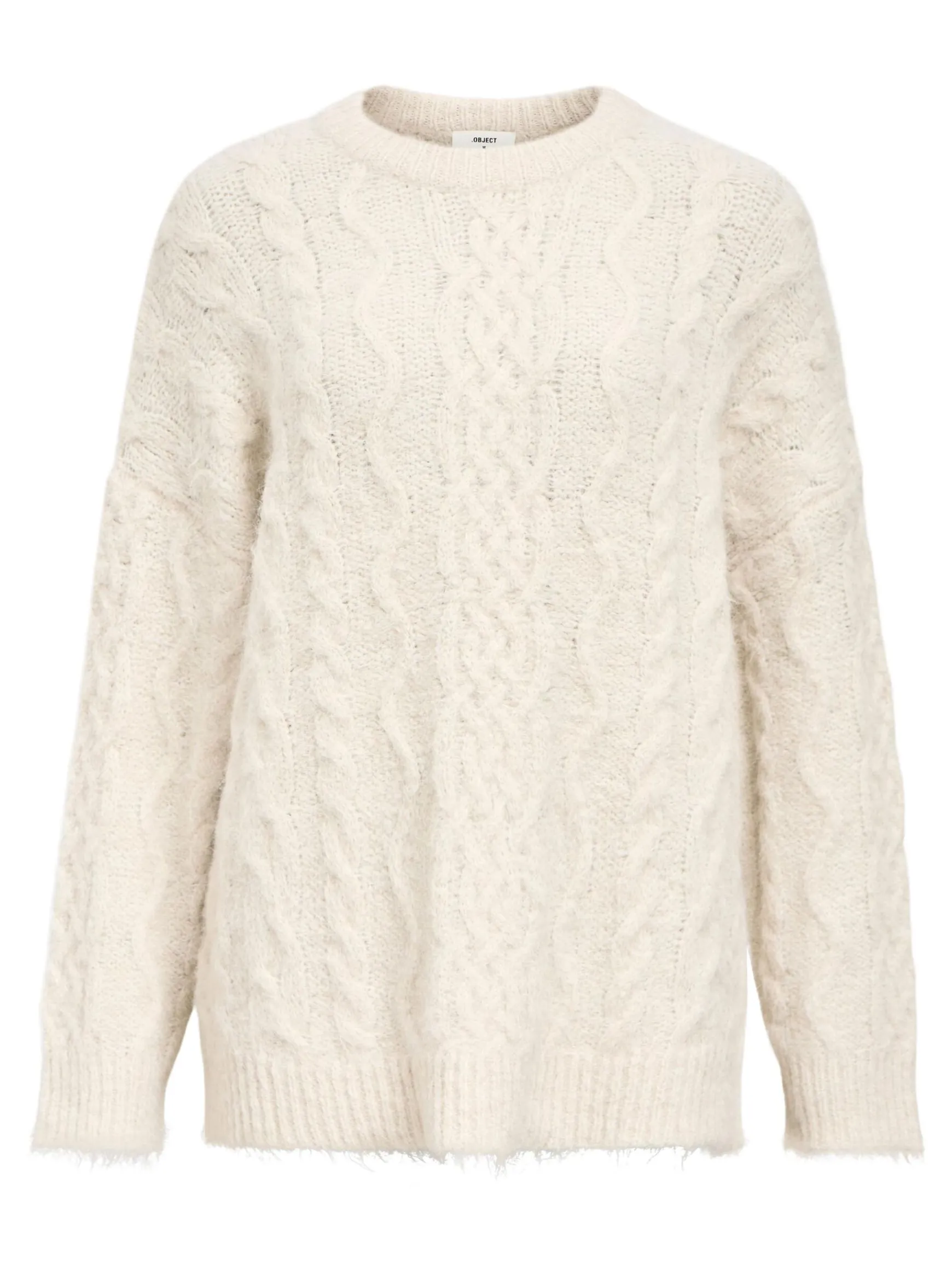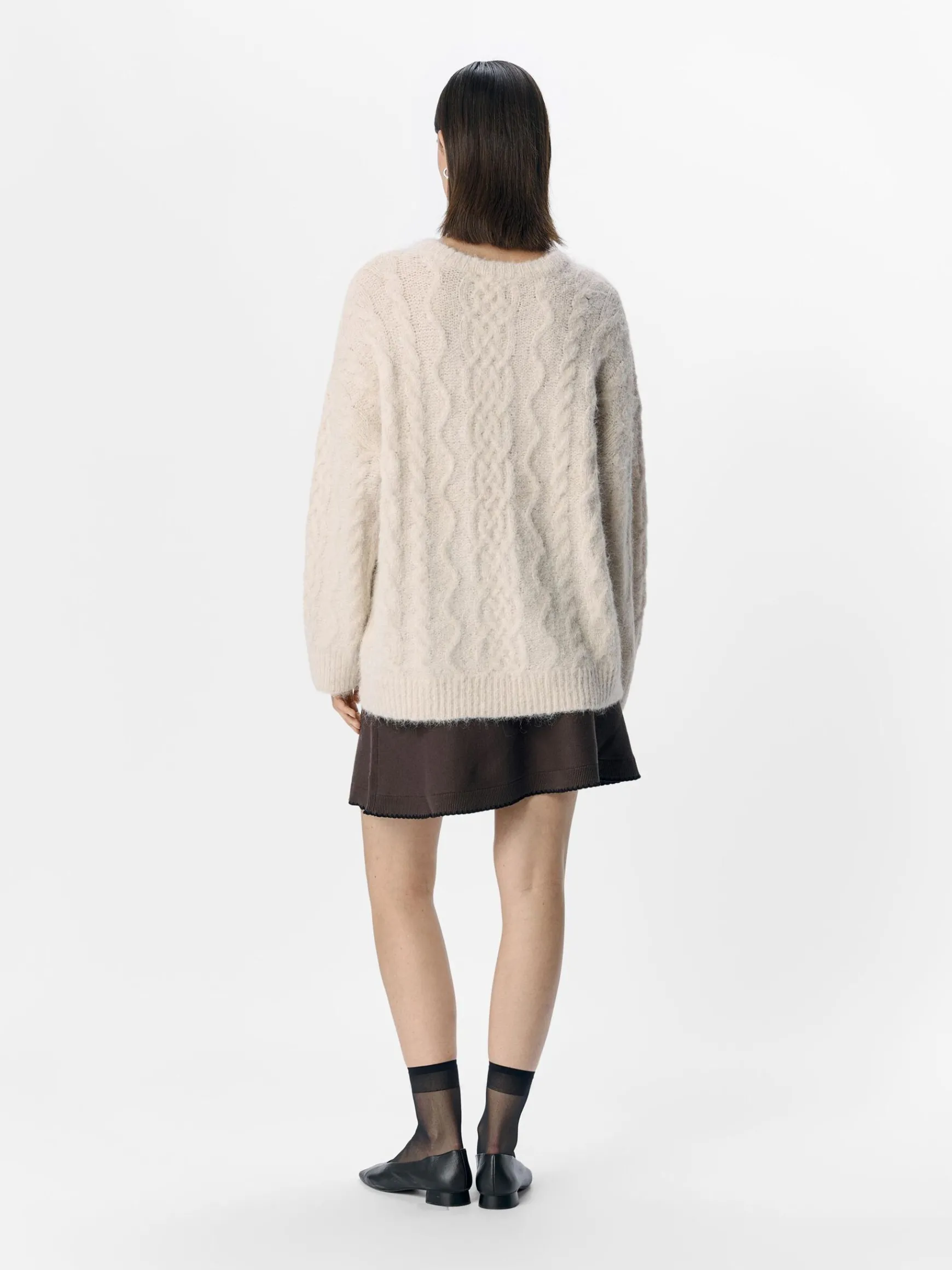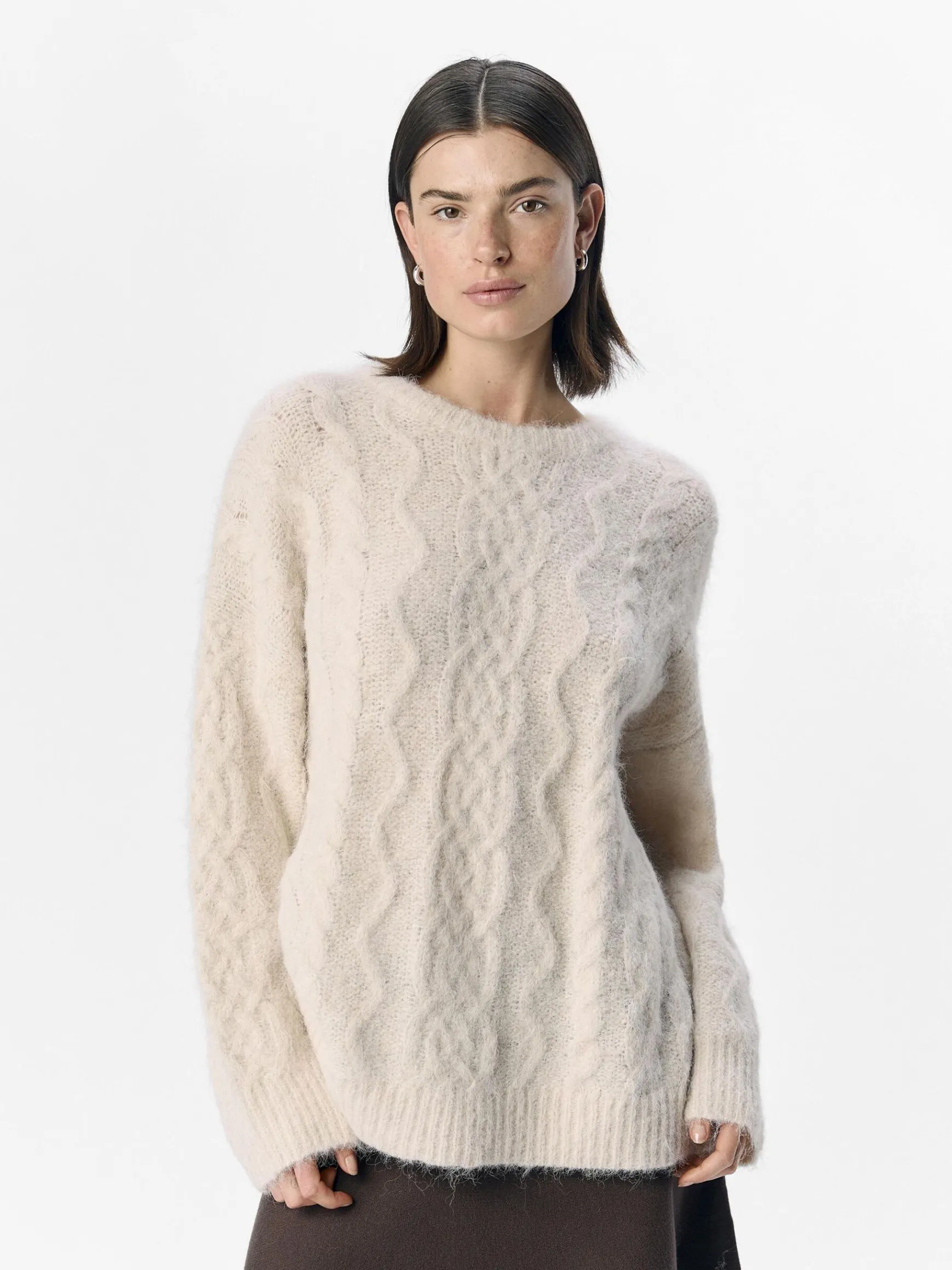 – Langærmet kabelstrikket trøje- Rund halsudskæring- Sænkede skuldre- Ribstrikket kant- Flosset kant- Oversized fit