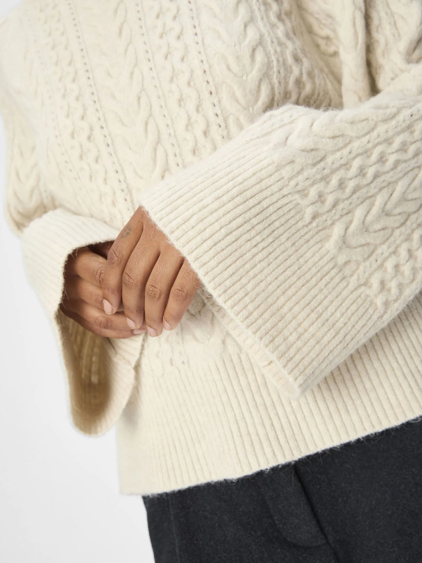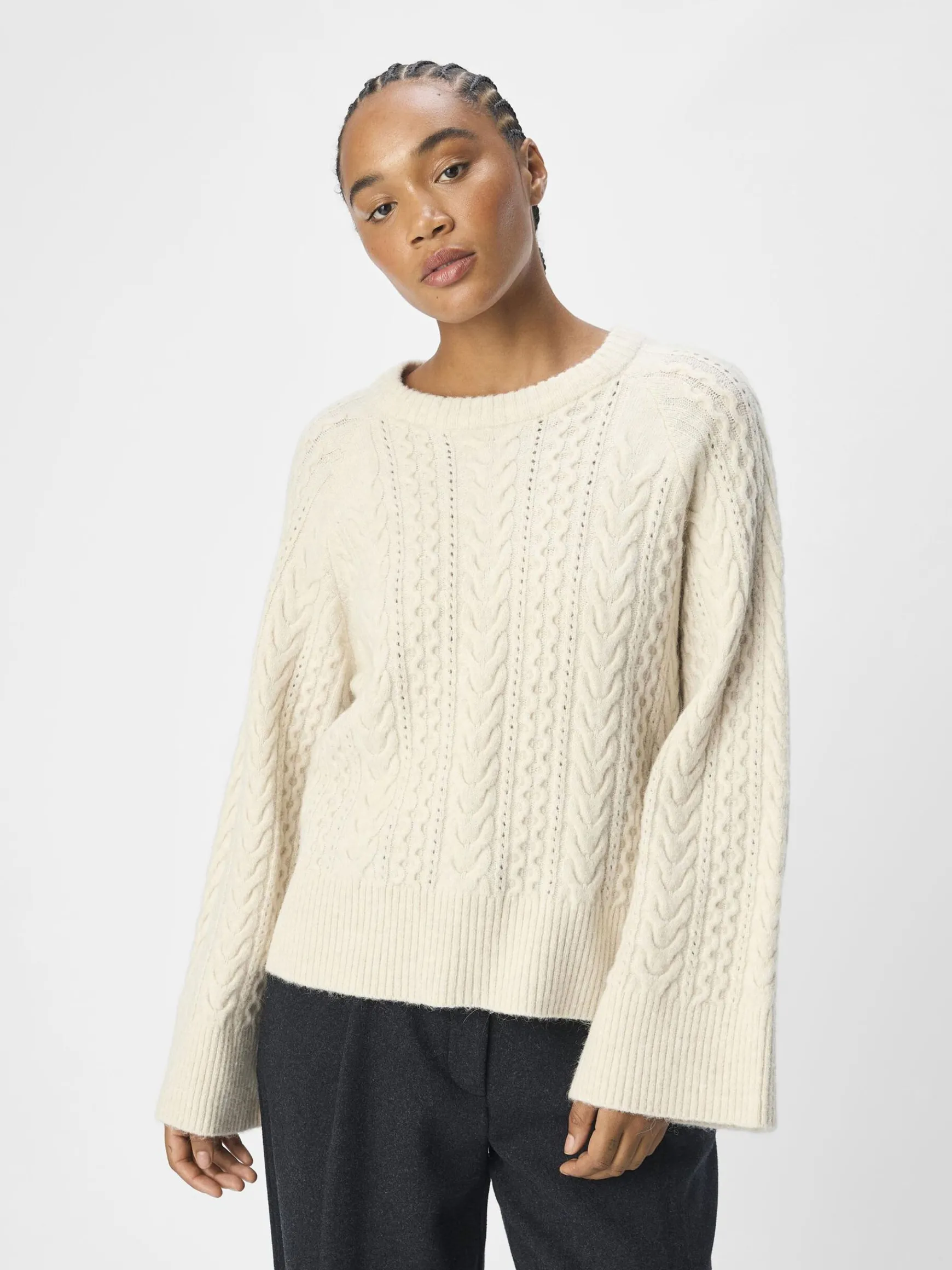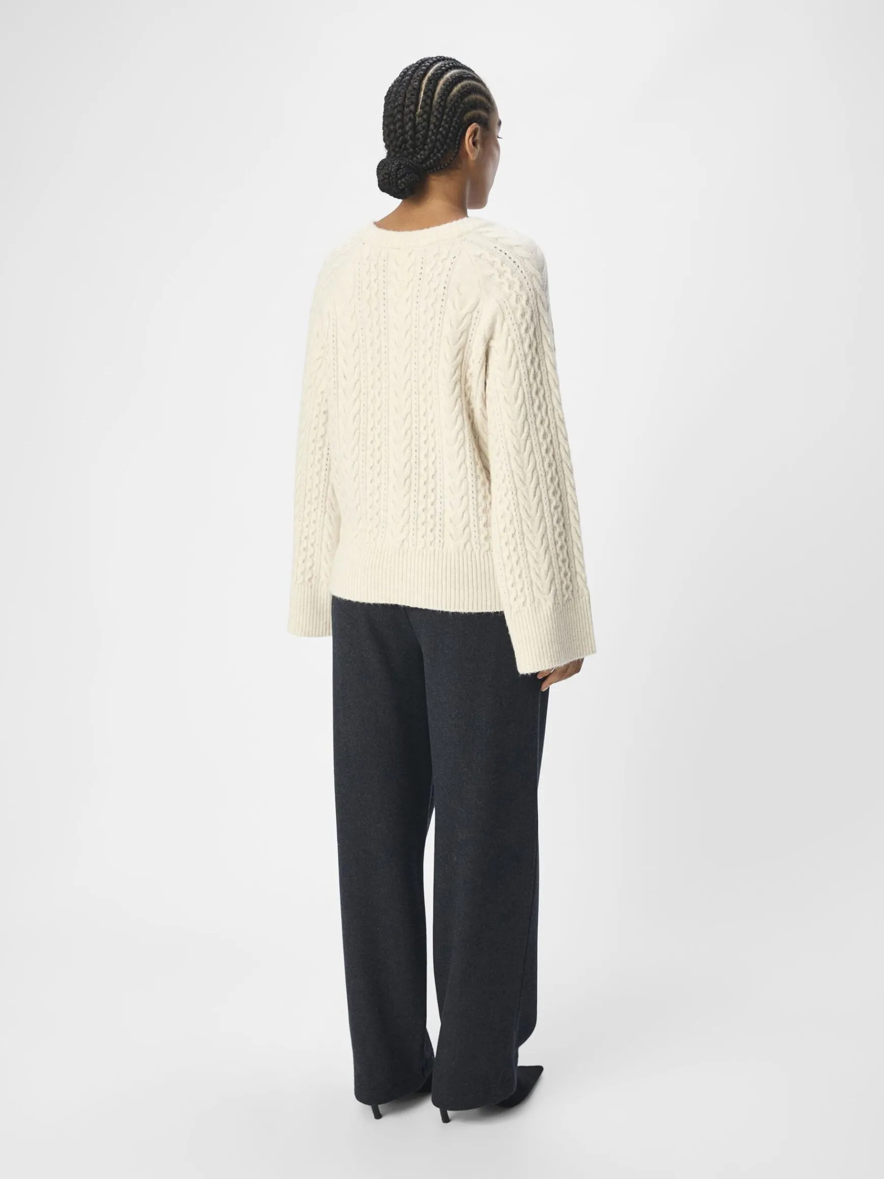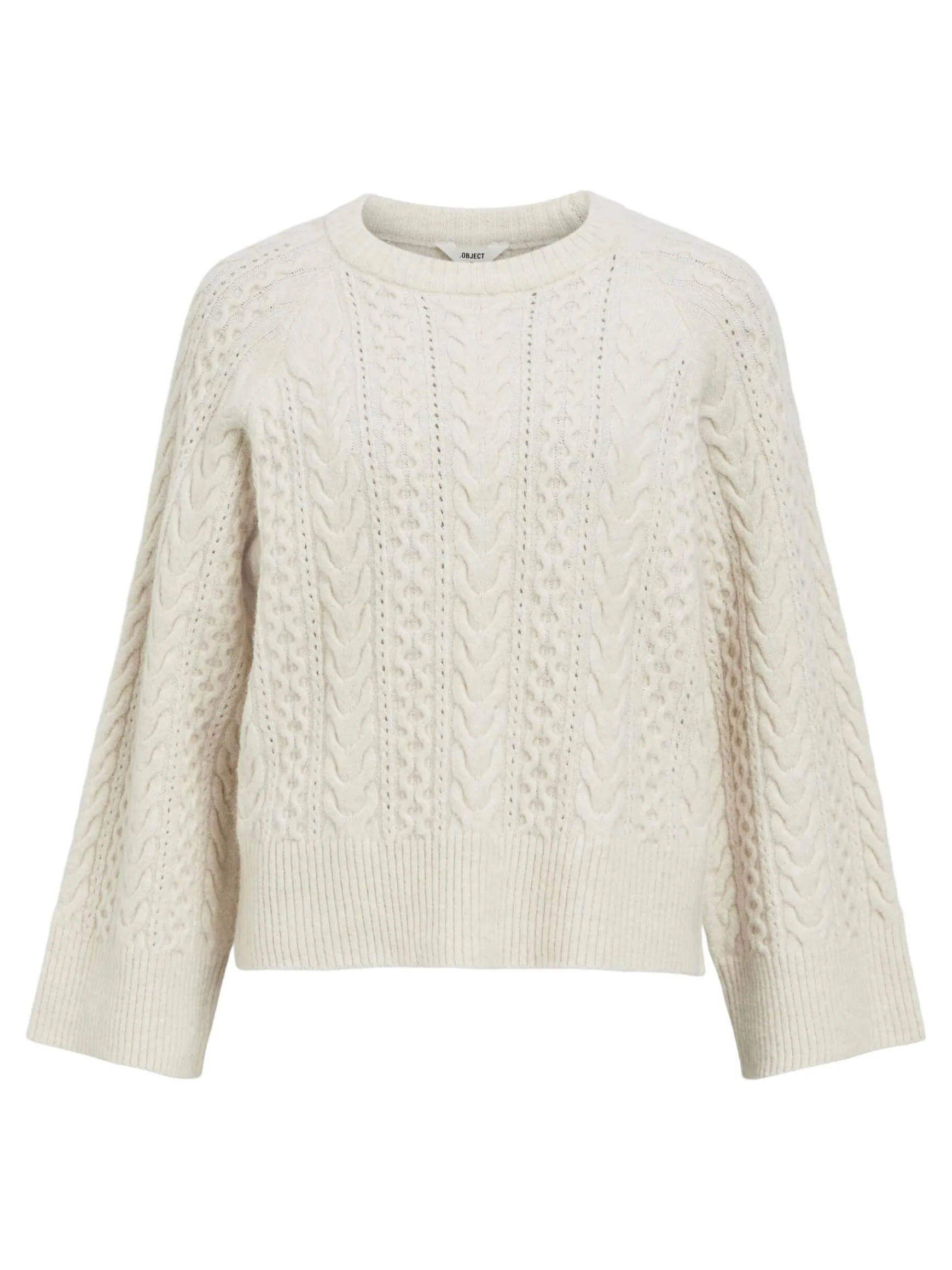 – Trøje i kabelstrik- Rund halsudskæring- Raglan-skuldre- Lange ærmer- Ribbede kanter- Almindelig pasform
