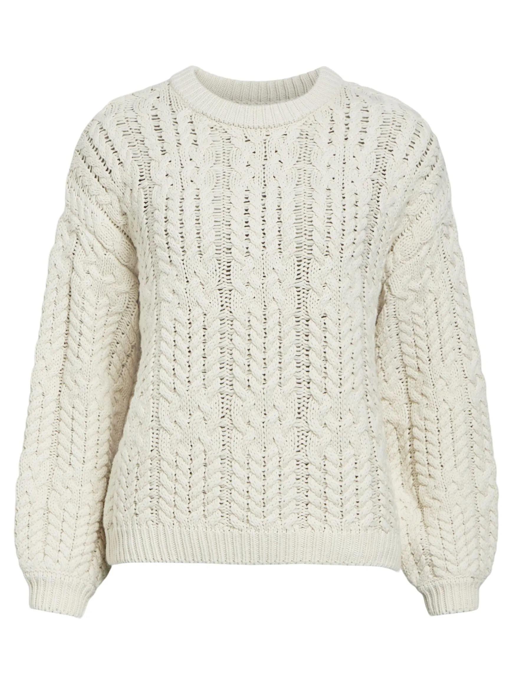 – Trøje i kabelstrik- Rund halsudskæring- Sænkede skuldre- Voluminøse ærmer- Ribstrikket kant- Løs pasform- Modellen er iført størrelse 36