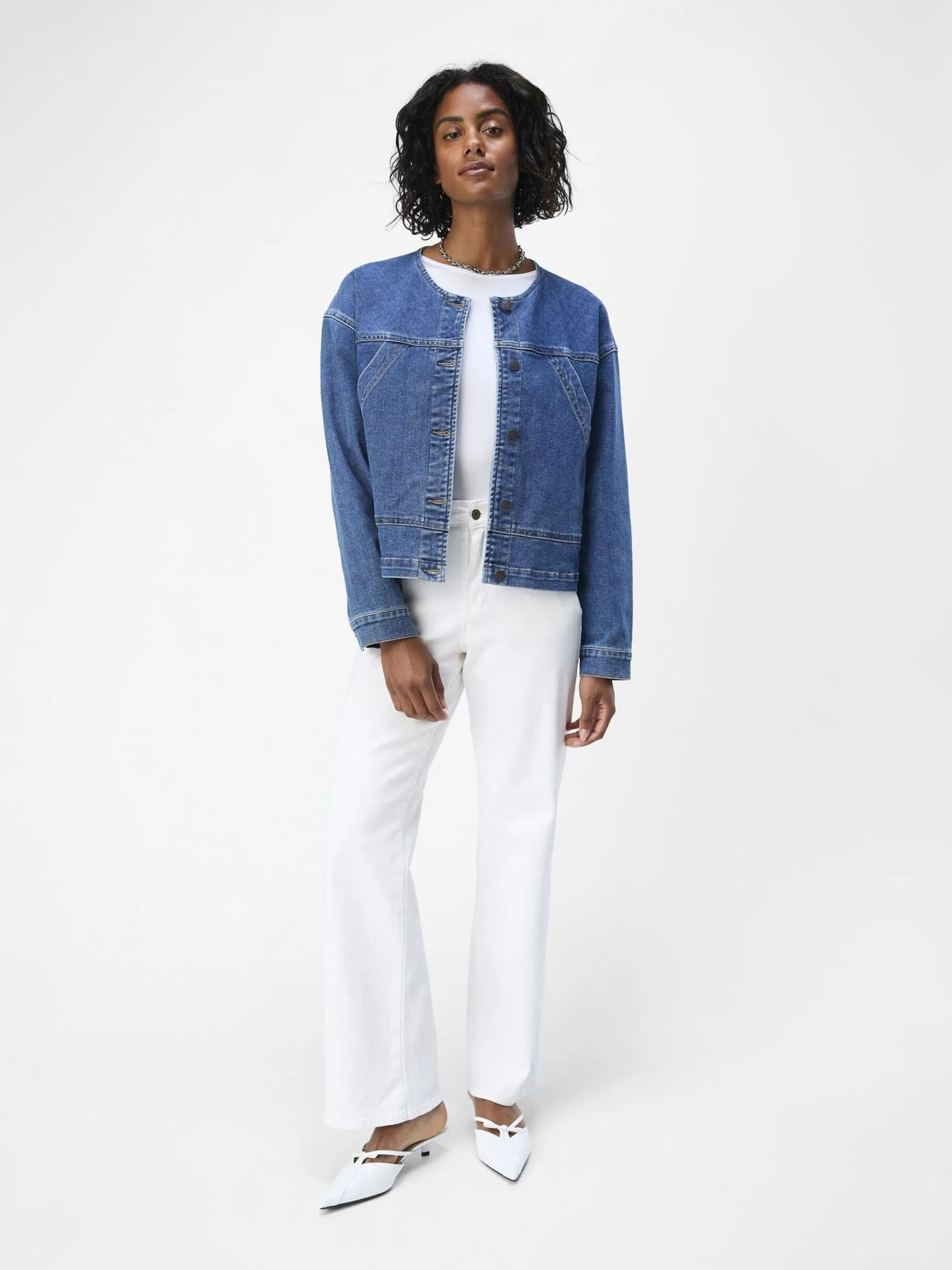 – Kort denimjakke- Rund halsudskæring- Sænkede skuldre- Lange ærmer med nitteknapper i ærmekanter- Brystlommer- Knapper foran- Regular fit- Modellen er iført størrelse 36