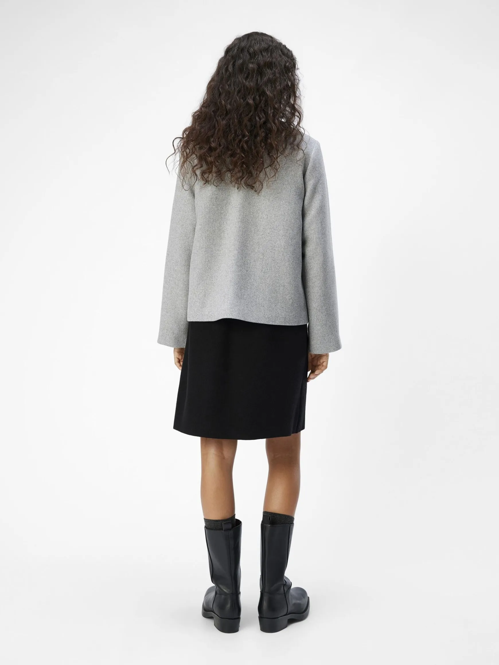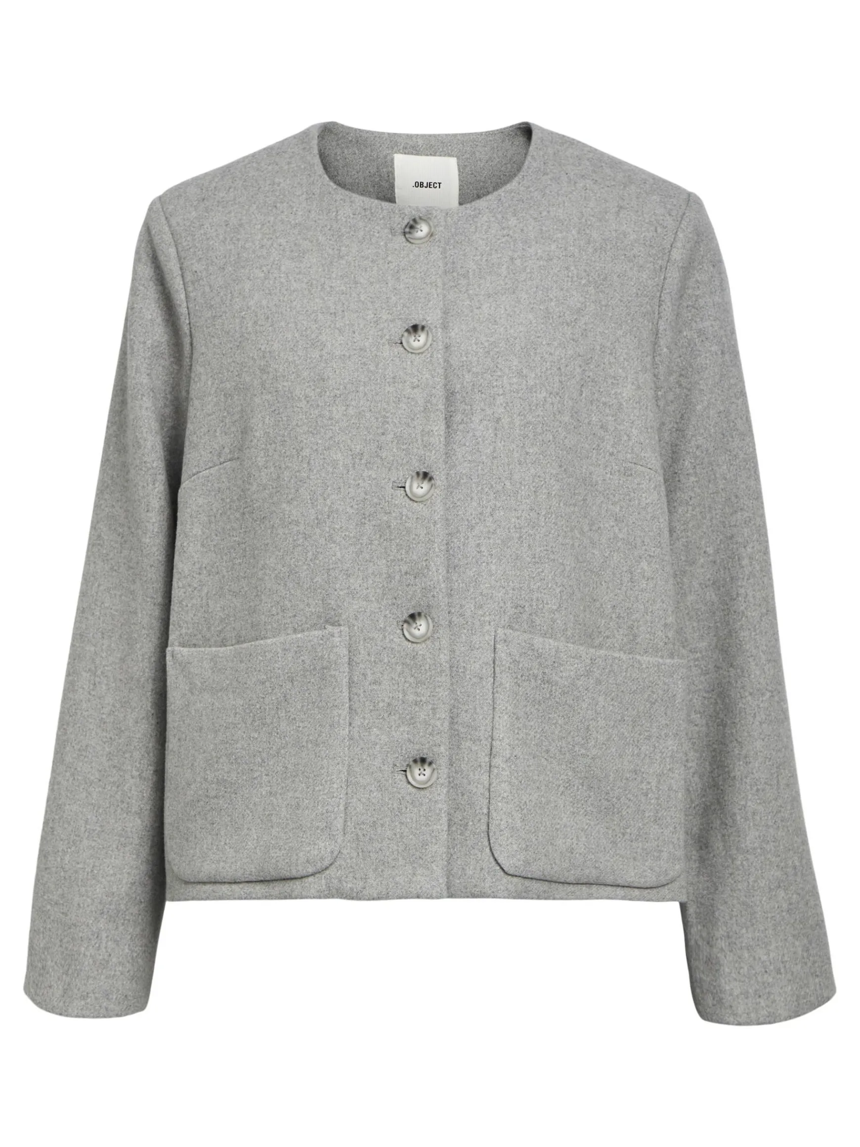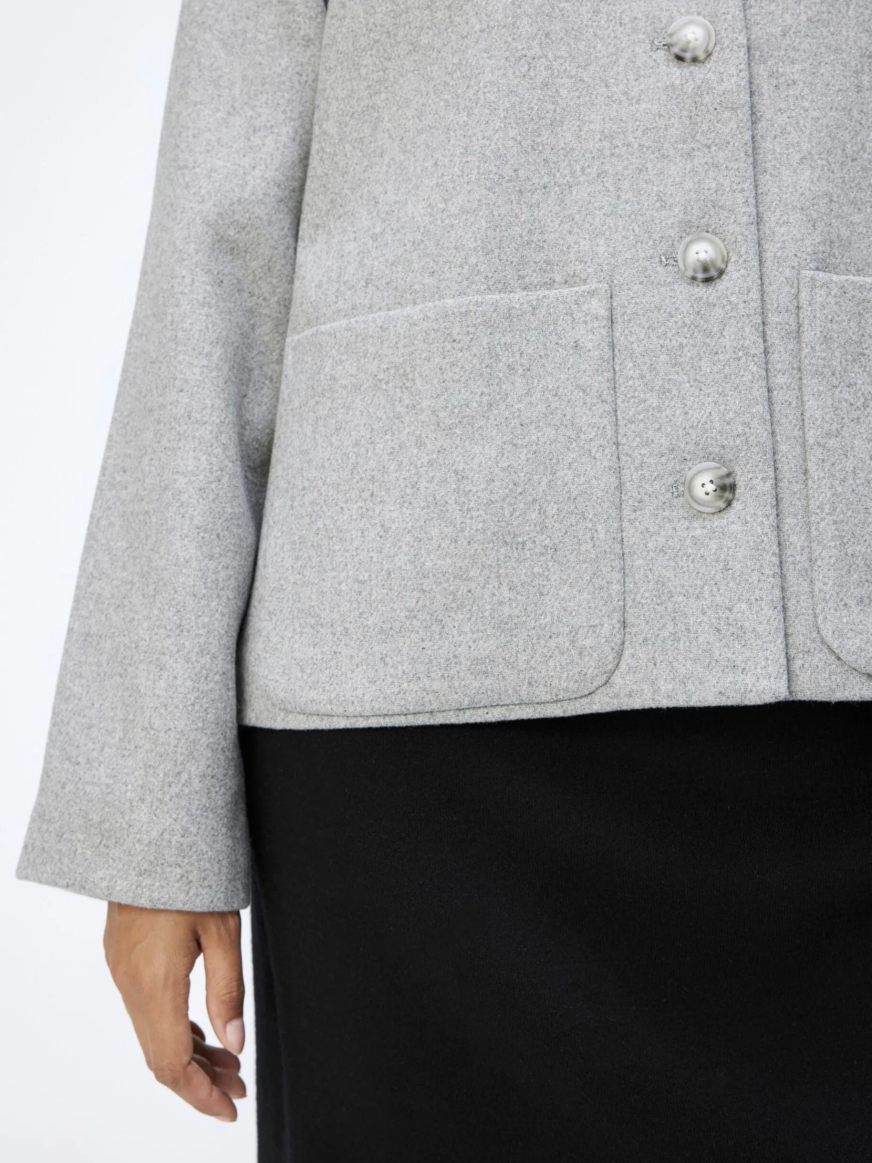 – Kort jakke i uldblanding- Rund halsudskæring- Sænkede skuldre- Lange ærmer- Patch-lommer foran- Knapper foran- Relaxed fit- Modellen er iført størrelse 36