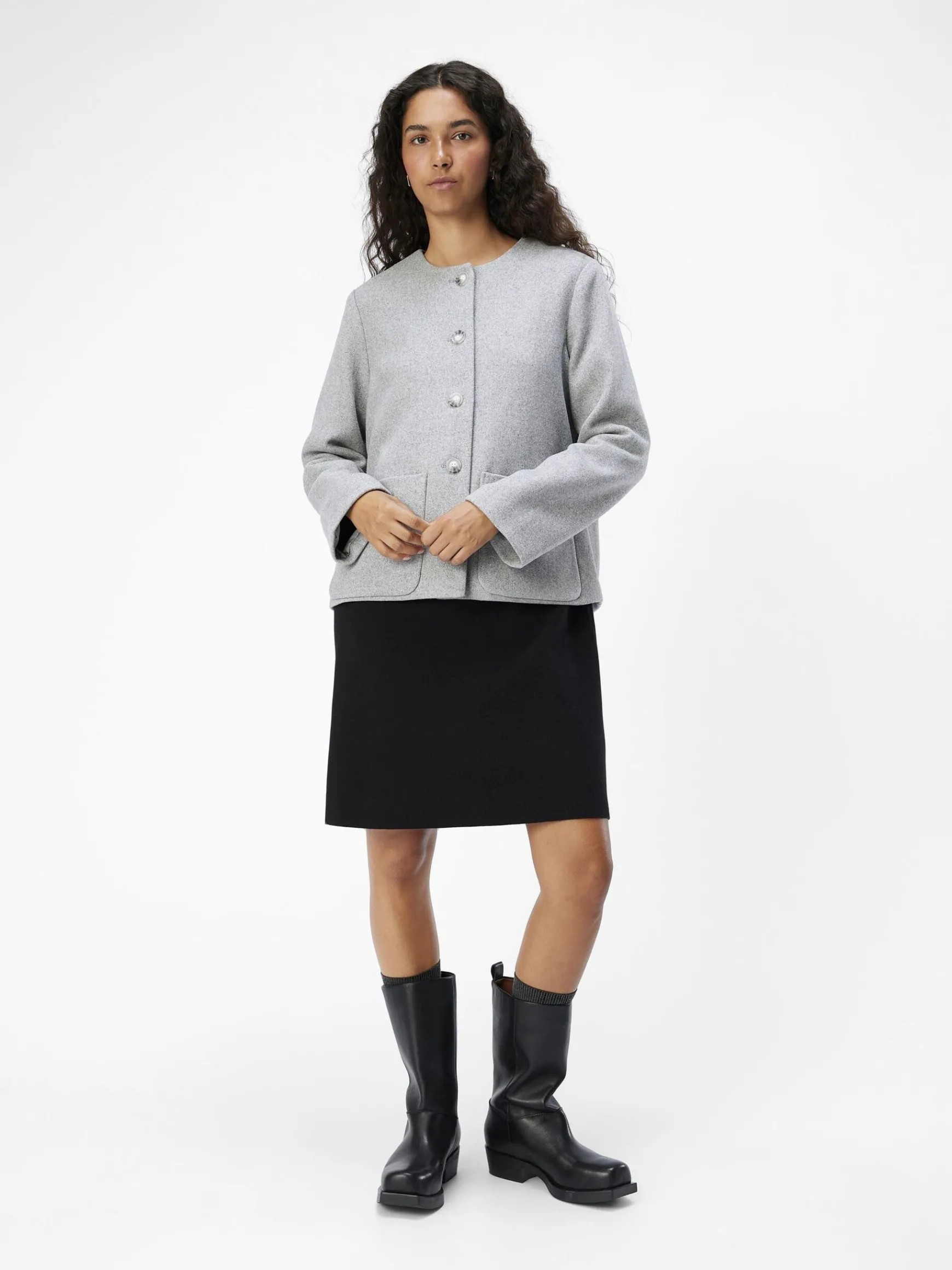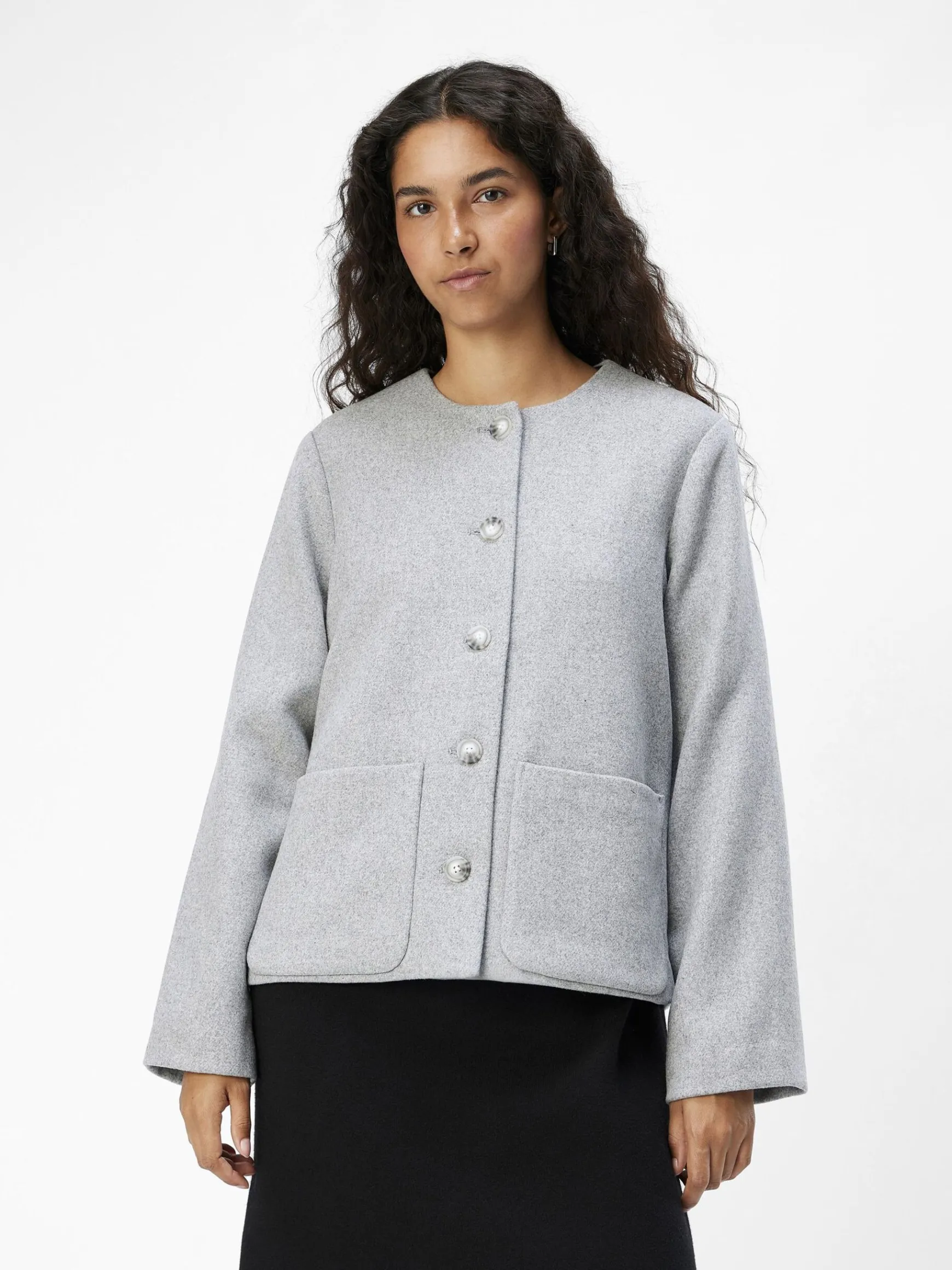 – Kort jakke i uldblanding- Rund halsudskæring- Sænkede skuldre- Lange ærmer- Patch-lommer foran- Knapper foran- Rela…