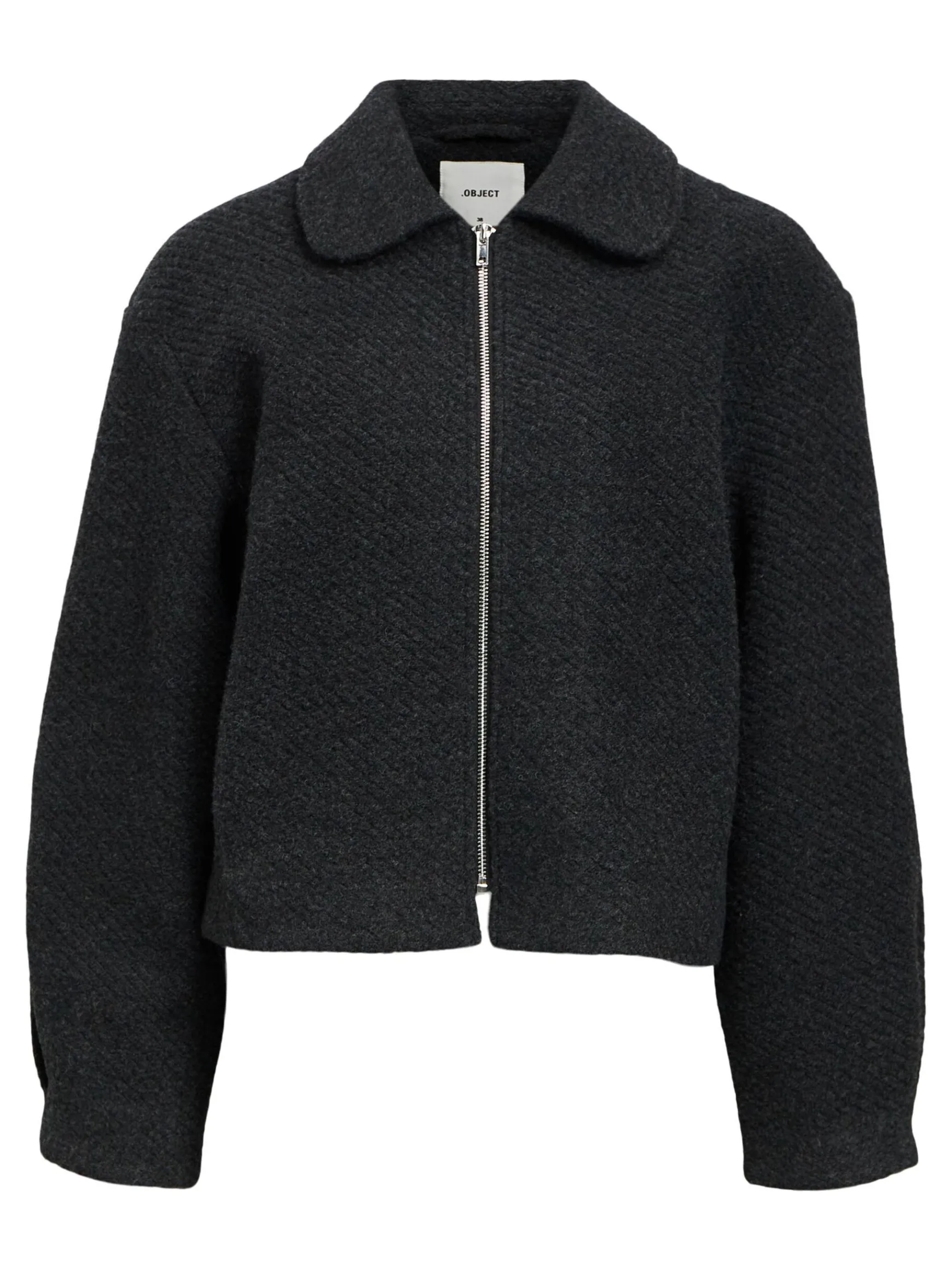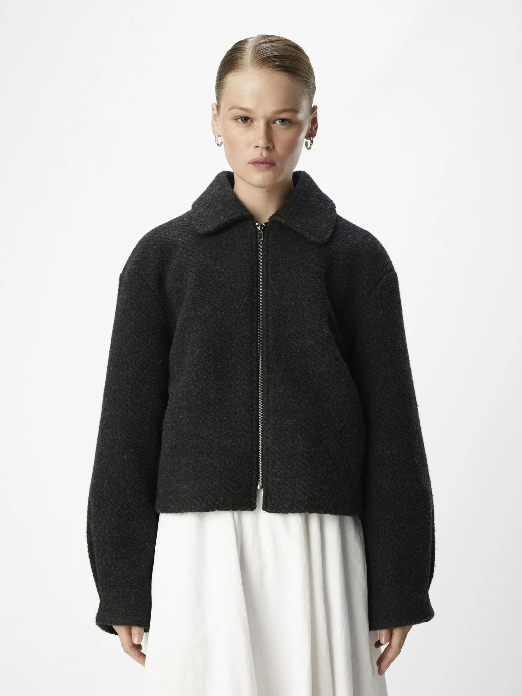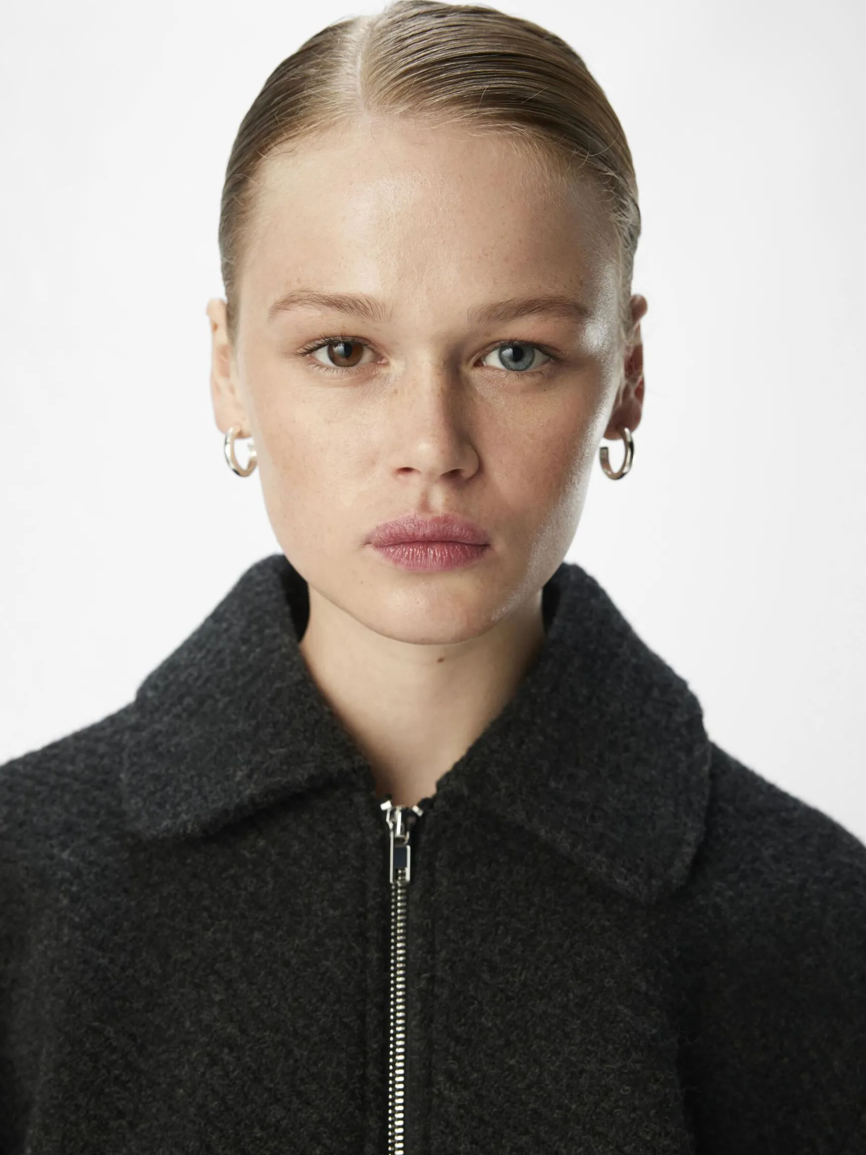 – Kort jakke i uldblanding- Rund krave- Lange ærmer- 2-vejs lynlås foran- Foret- Almindelig pasform