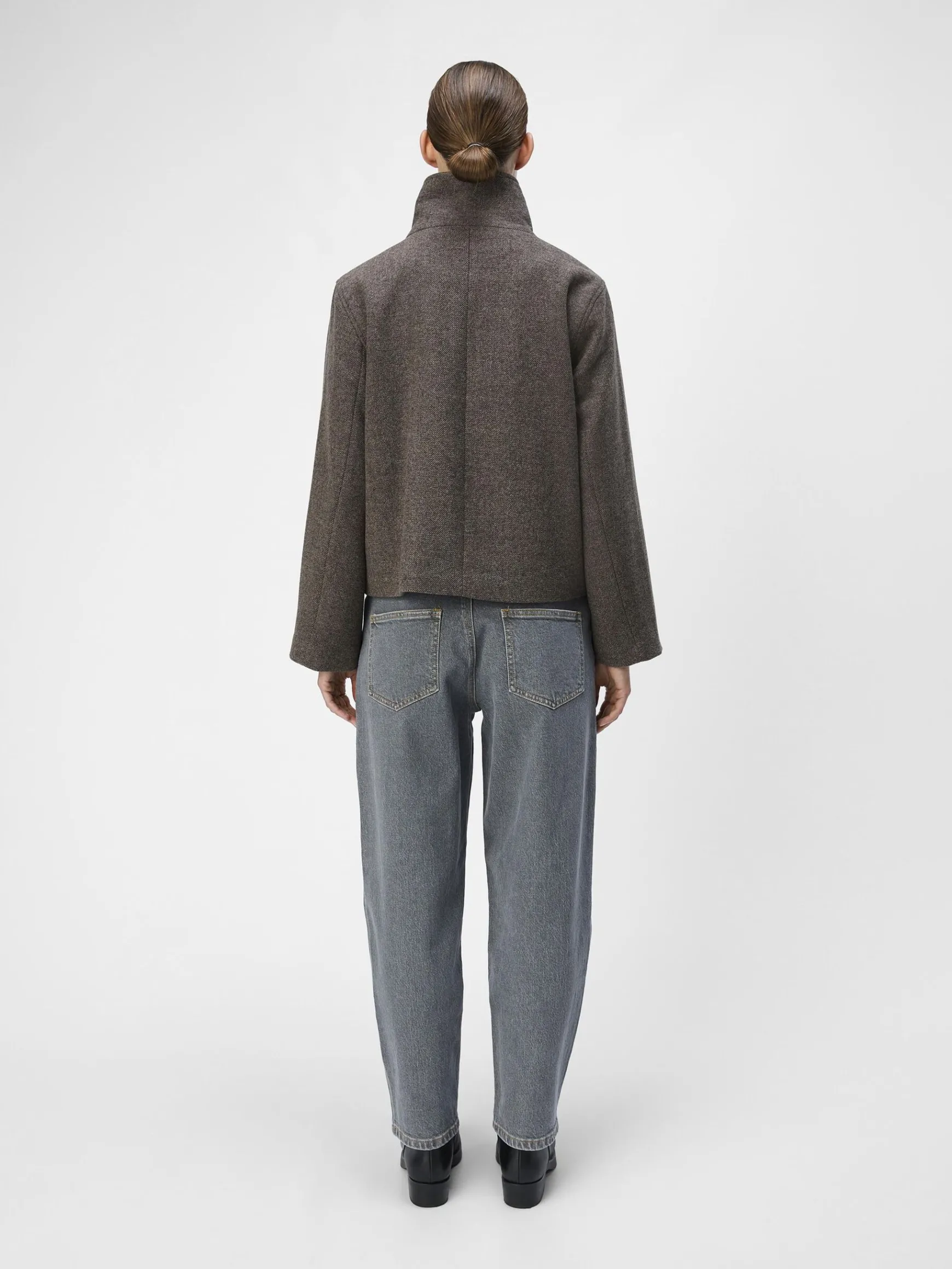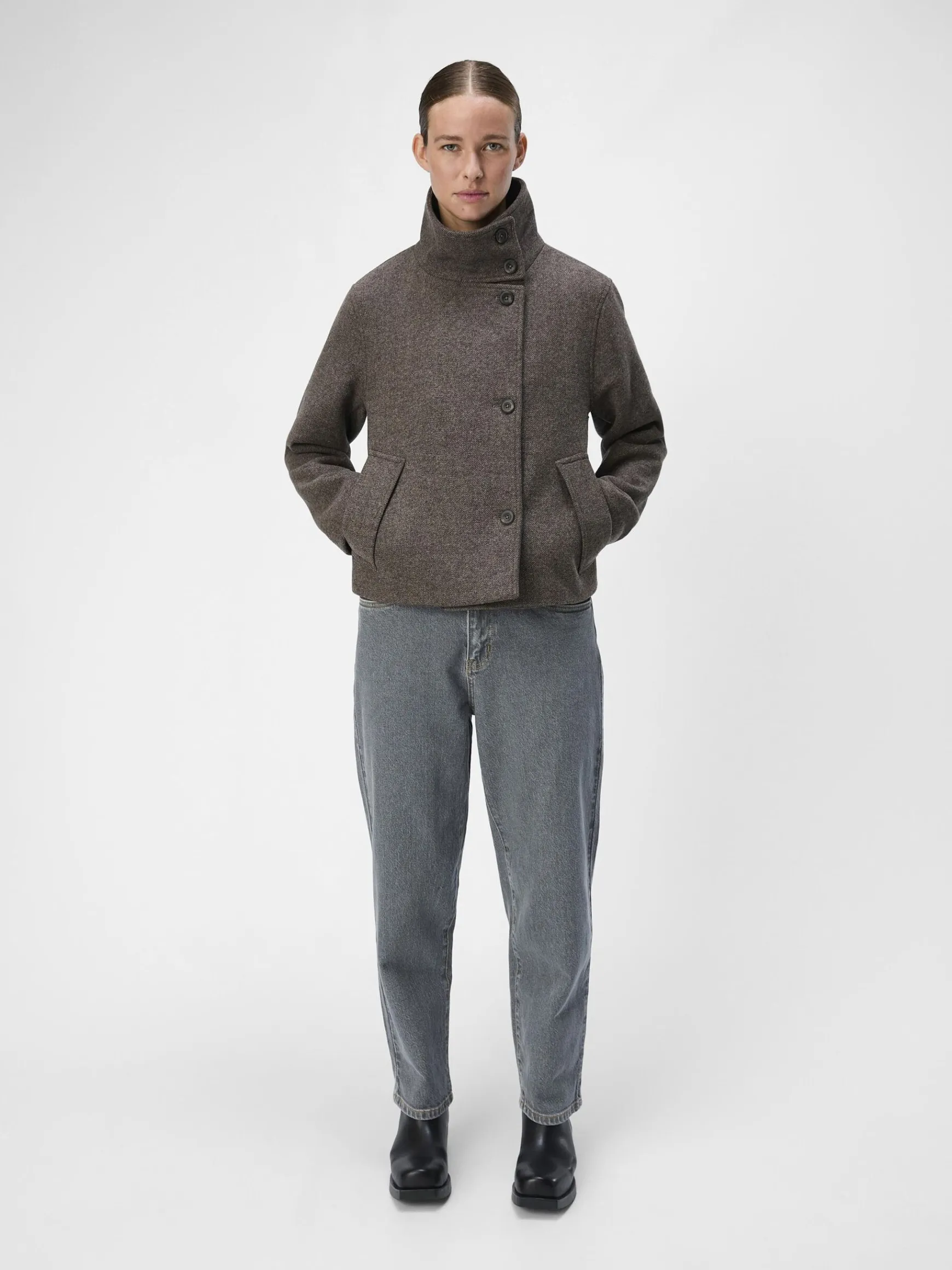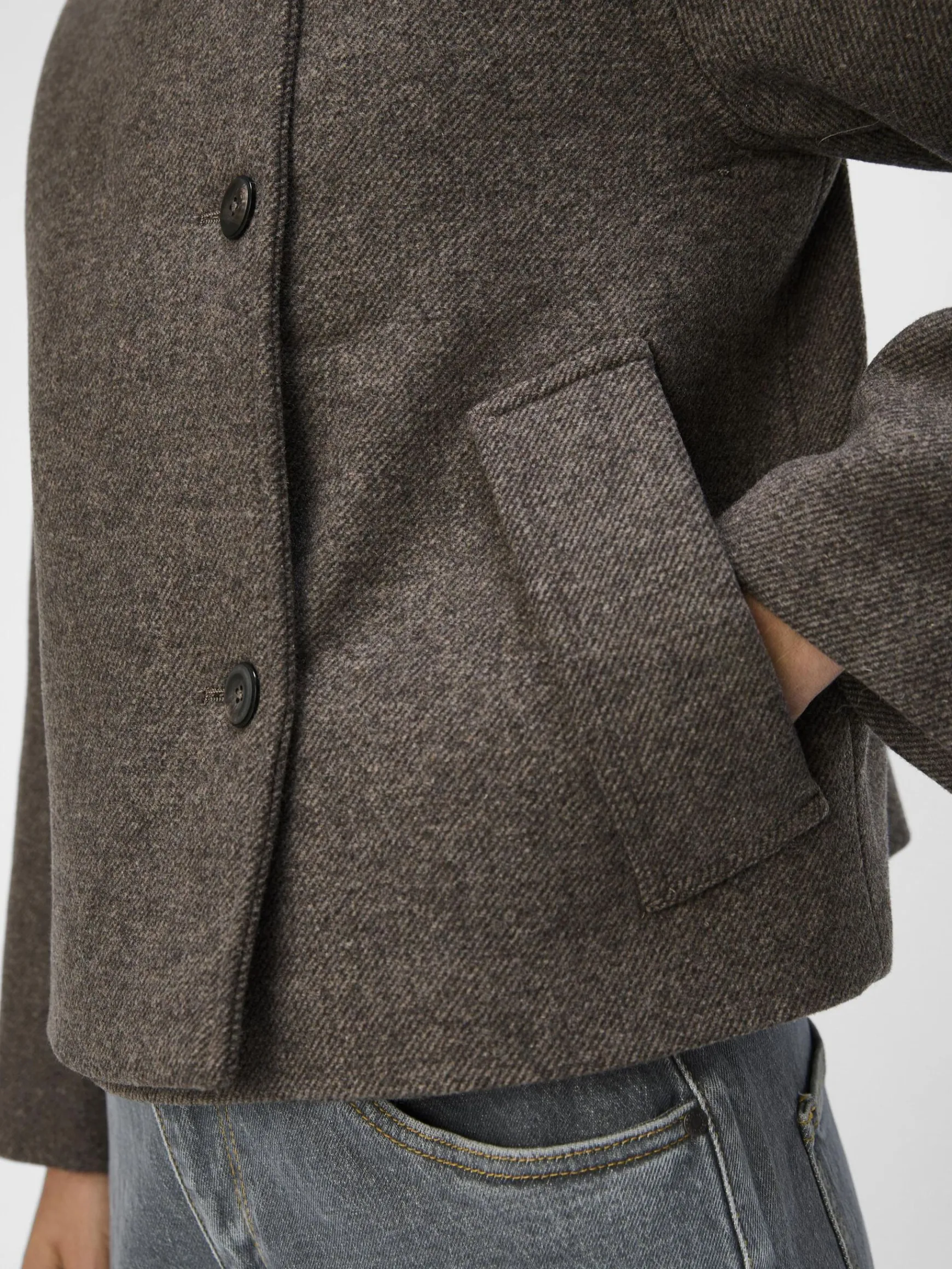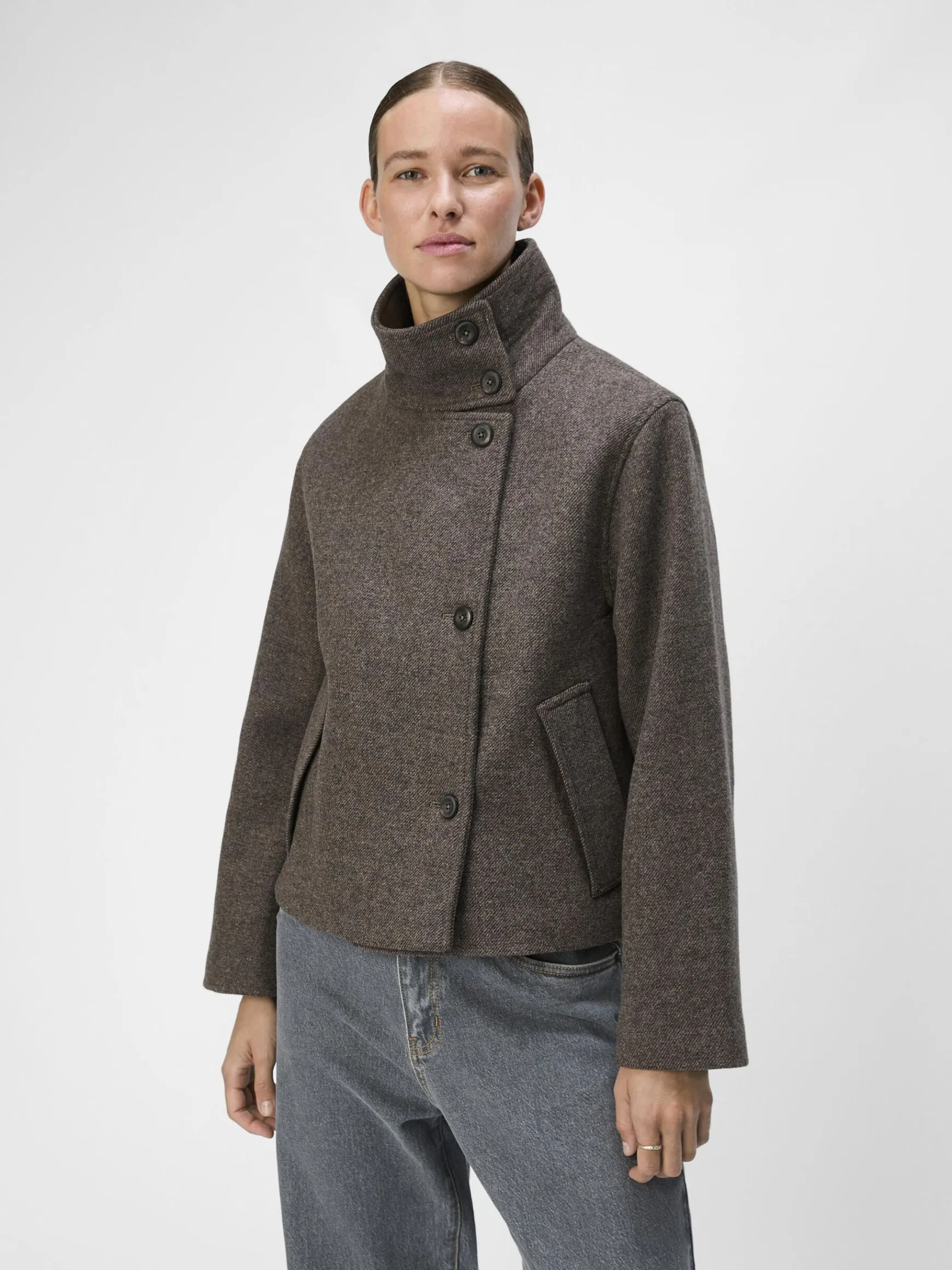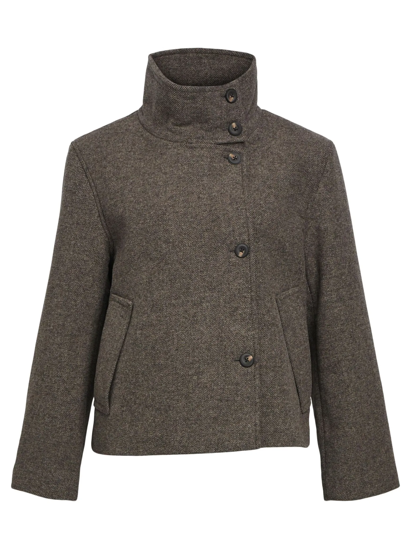 – Kort jakke med høj hals- Off-center knaplukning foran- Lange ærmer- Paspolerede lommer foran- Uldblanding- Fuldt for…