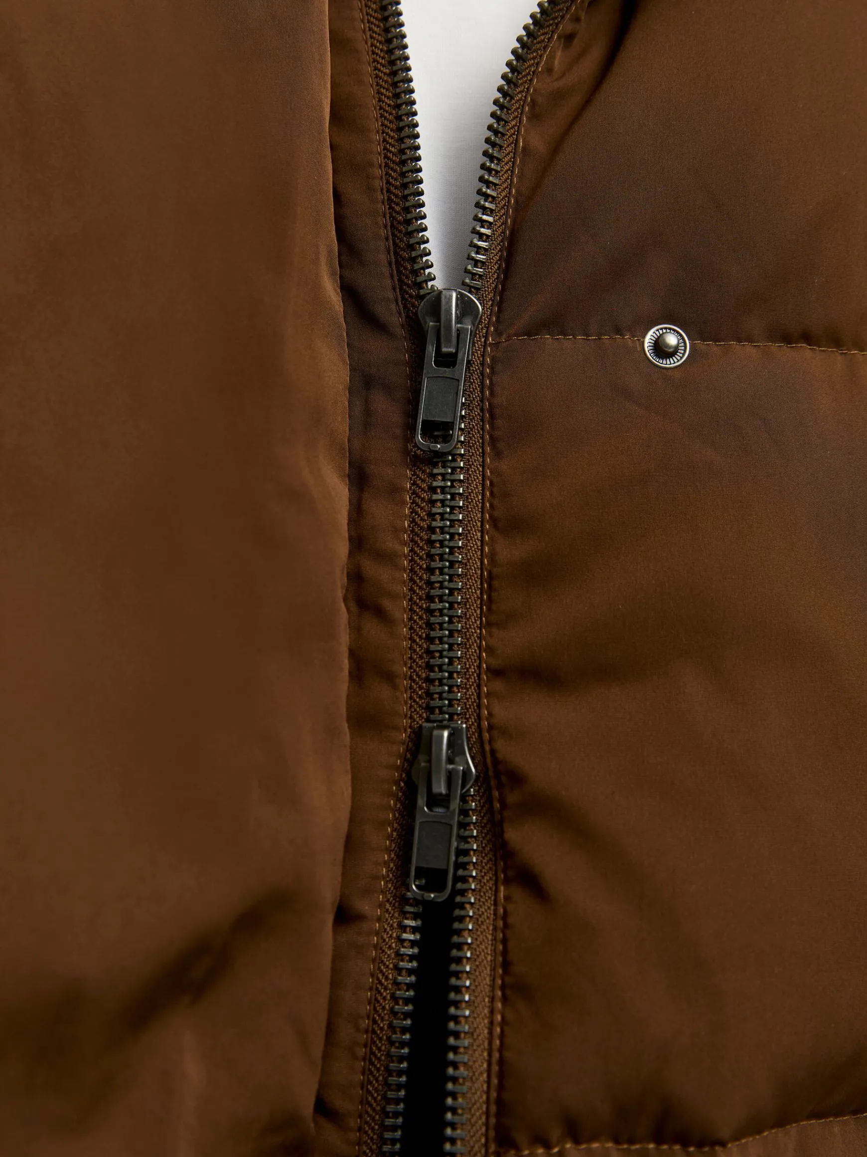 – Lang dunfrakke med hætte- To lommer- Vinter frakke- Kombineret lynlås- og knaplukning- Længde: 108 cm i str. 38- Æ…