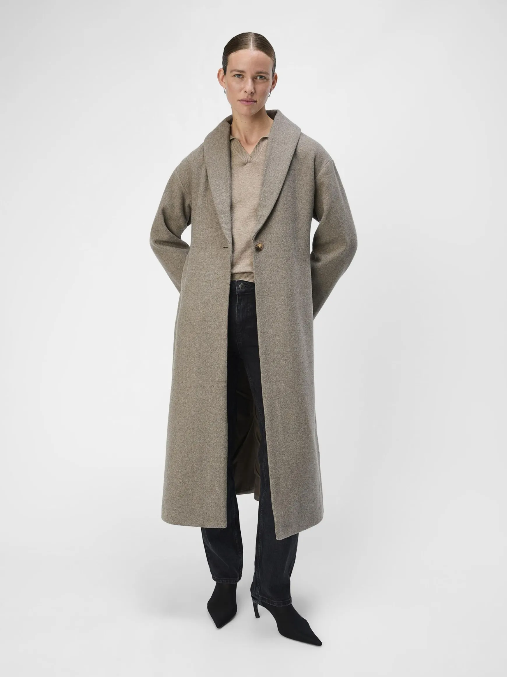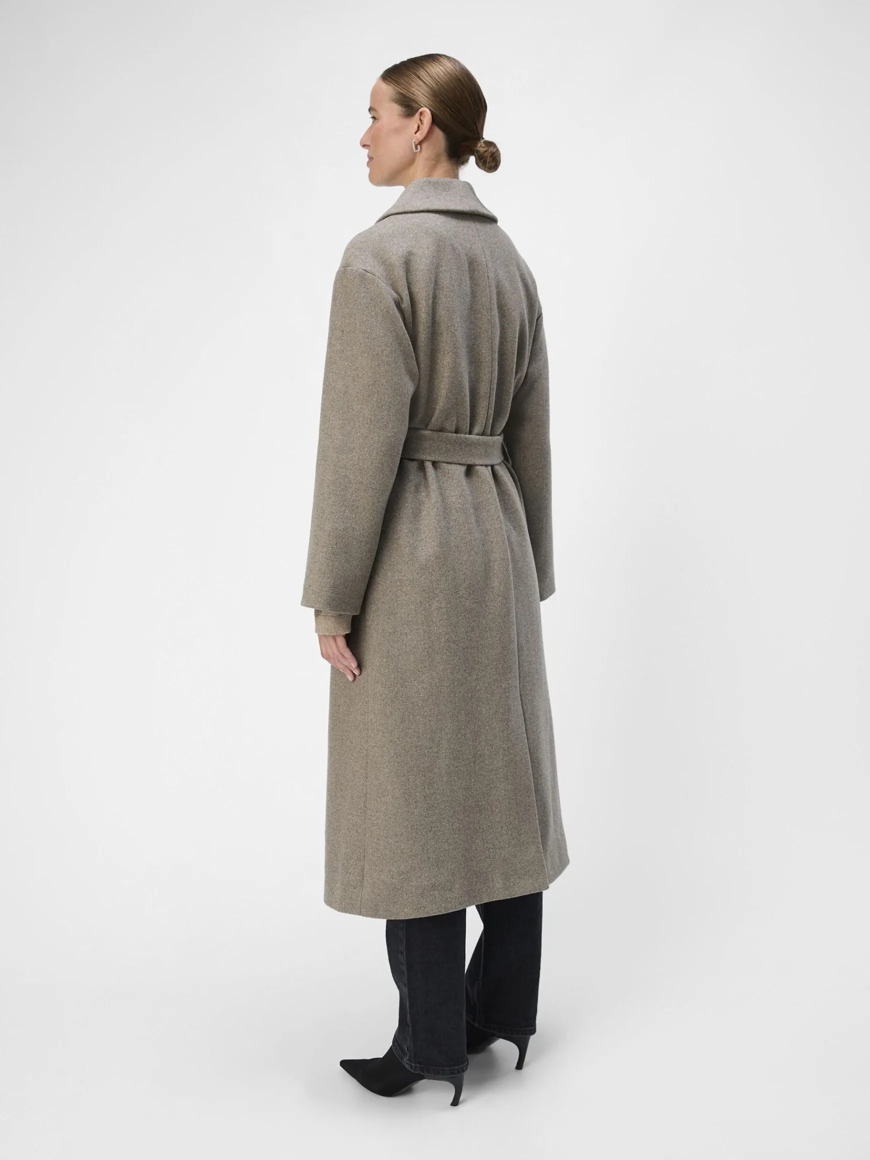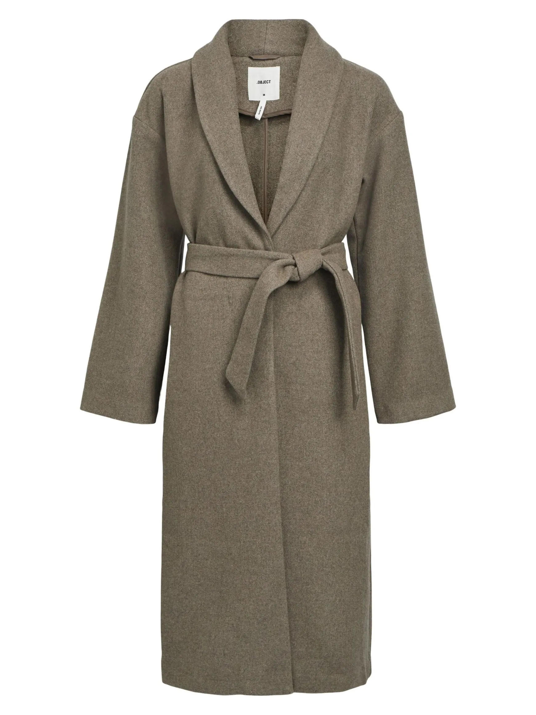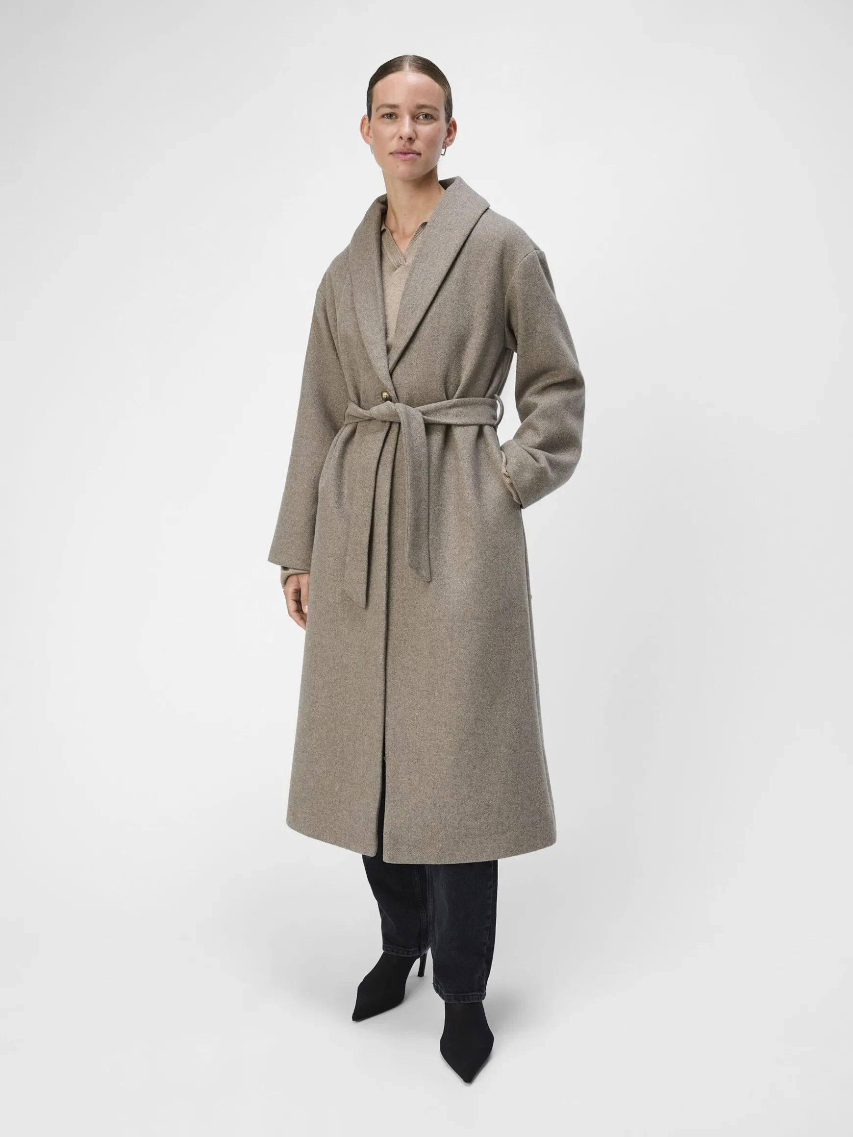 – Lang frakke i uldblanding- Sjal lapel- Knapper foran- Lange ærmer- Bindebælte i taljen- Foret- Almindelig pasform- Modellen er iført størrelse 36