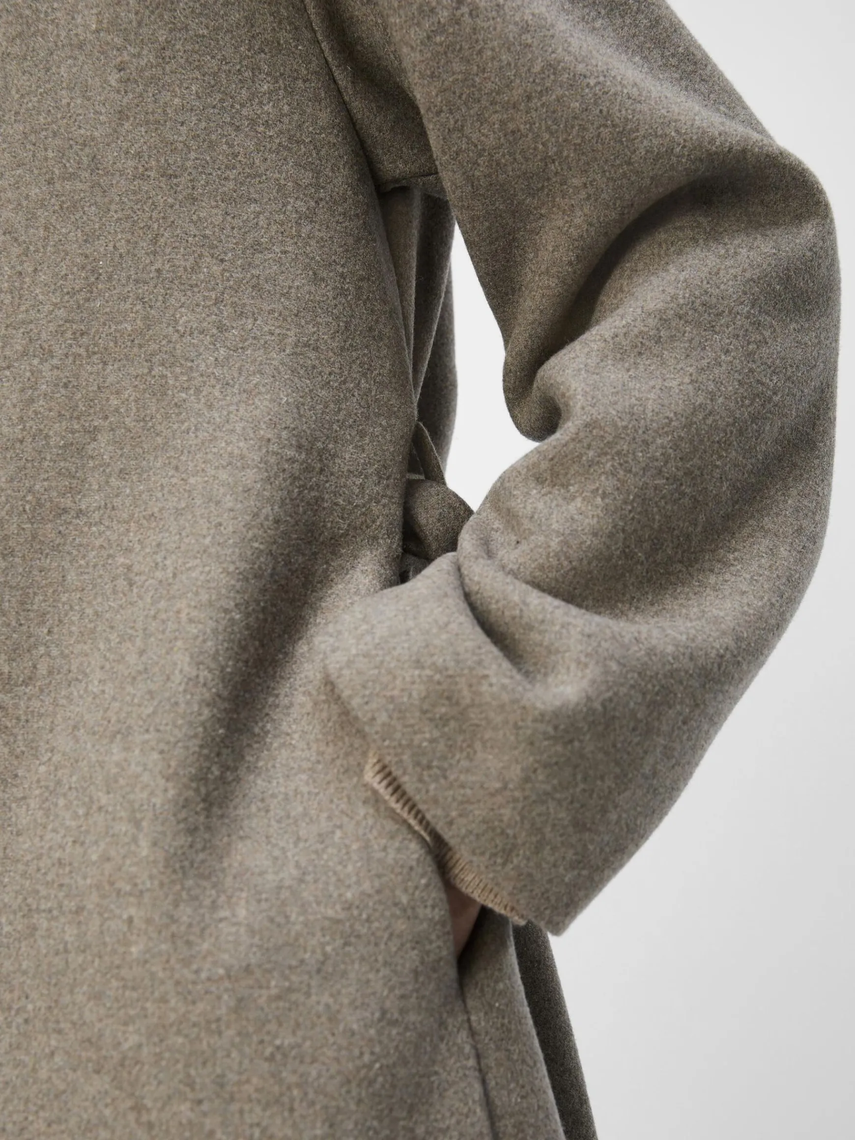 – Lang frakke i uldblanding- Sjal lapel- Knapper foran- Lange ærmer- Bindebælte i taljen- Foret- Almindelig pasform- M…