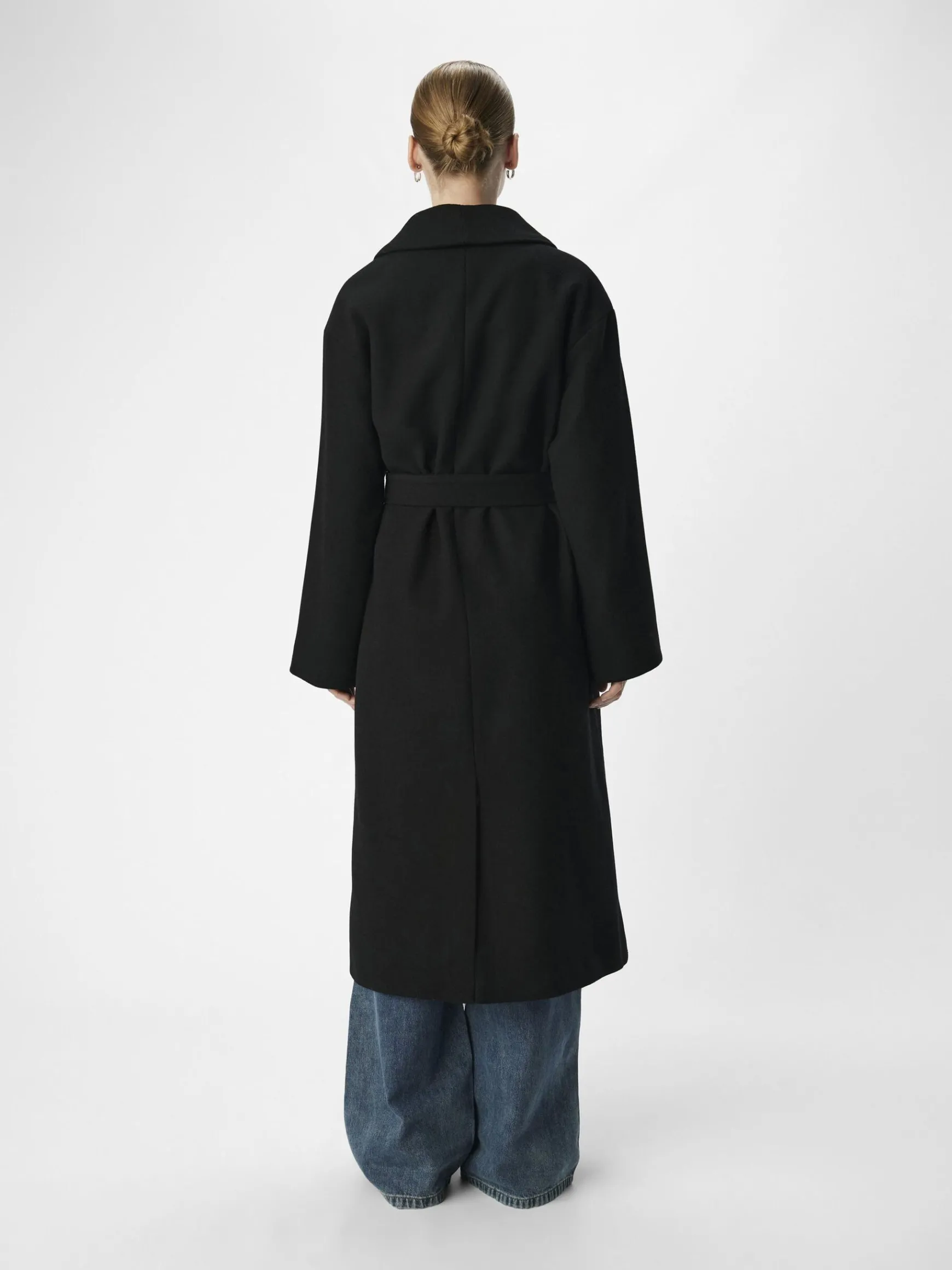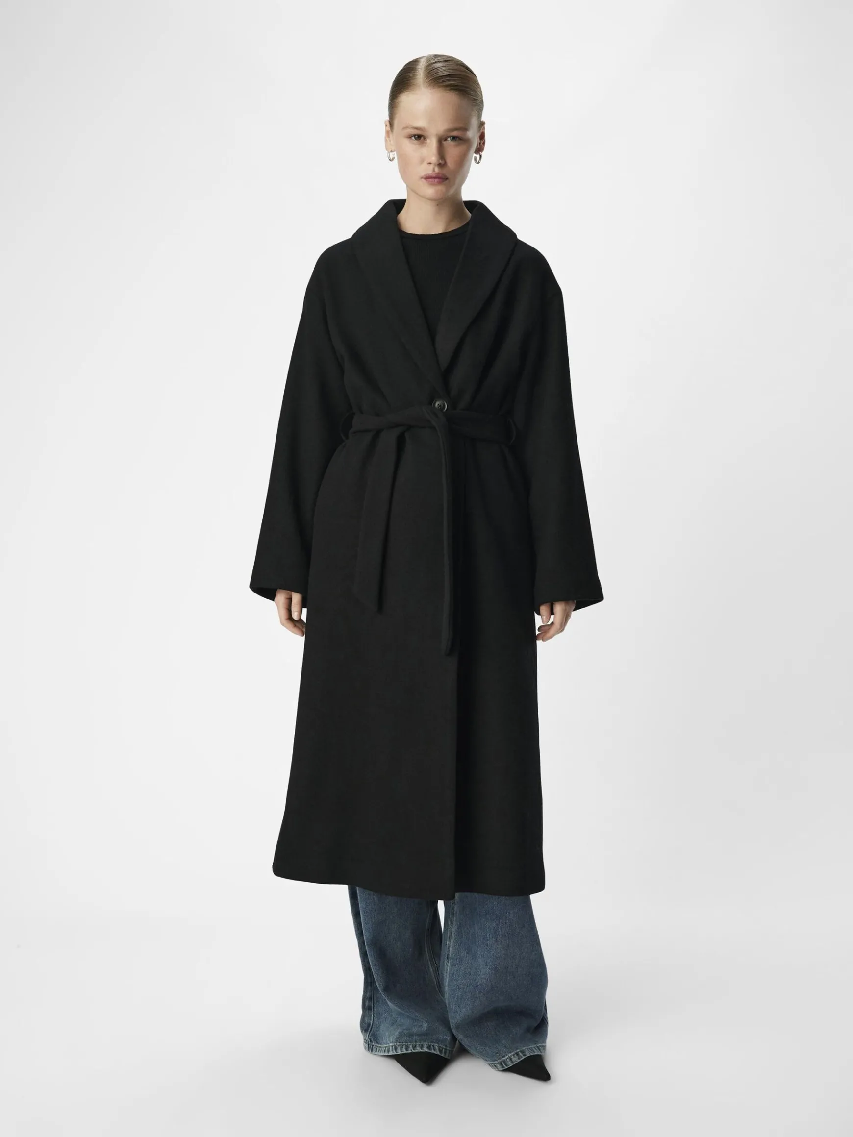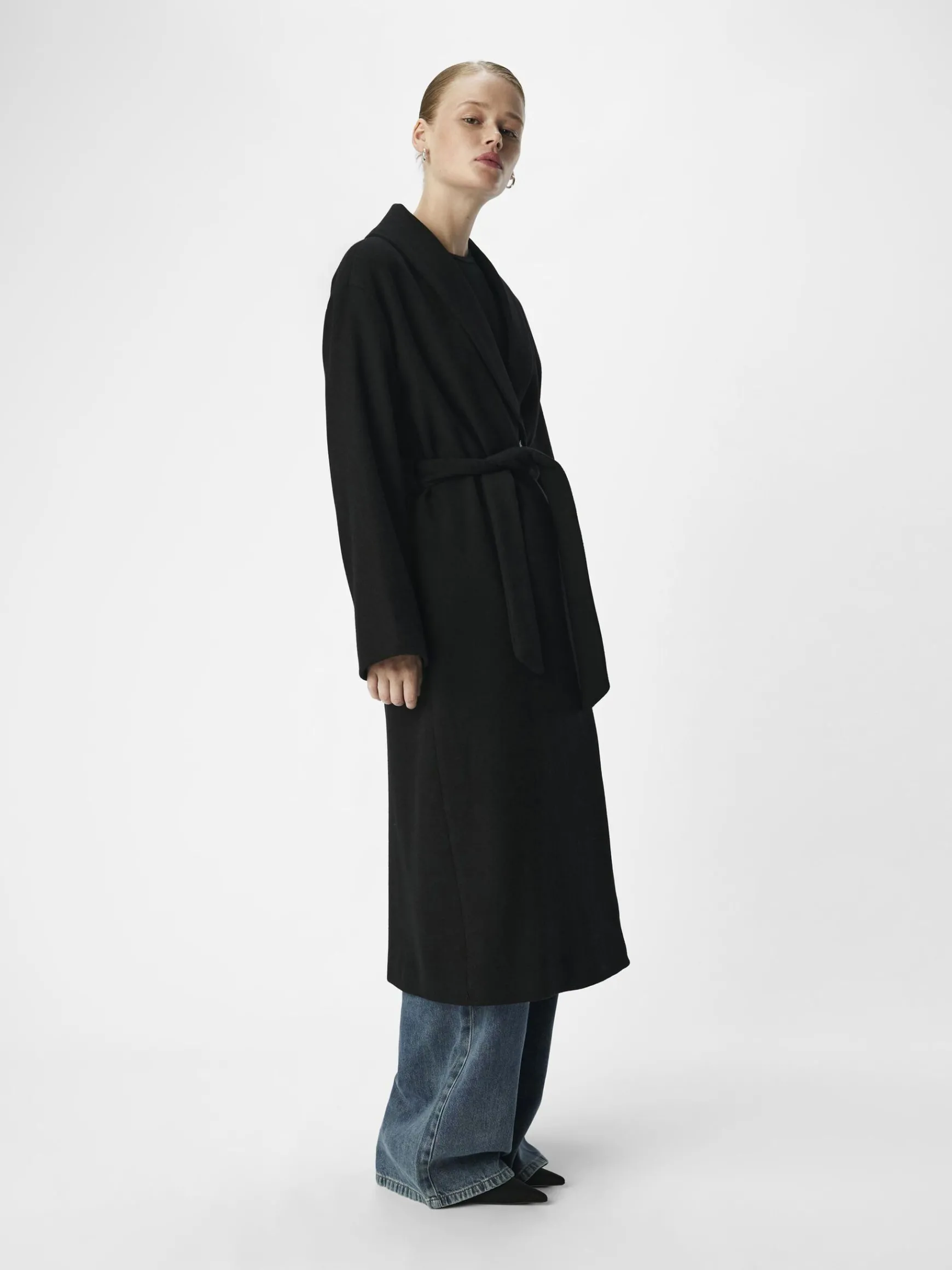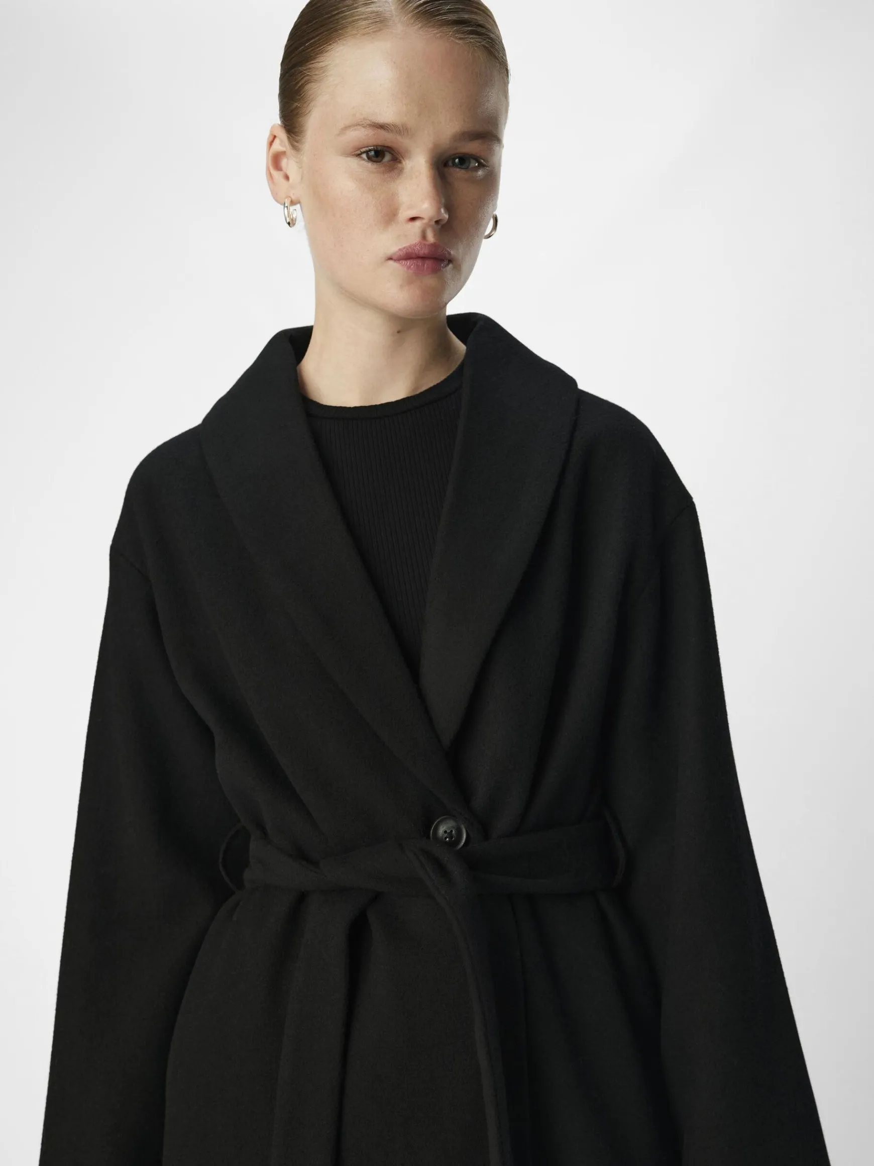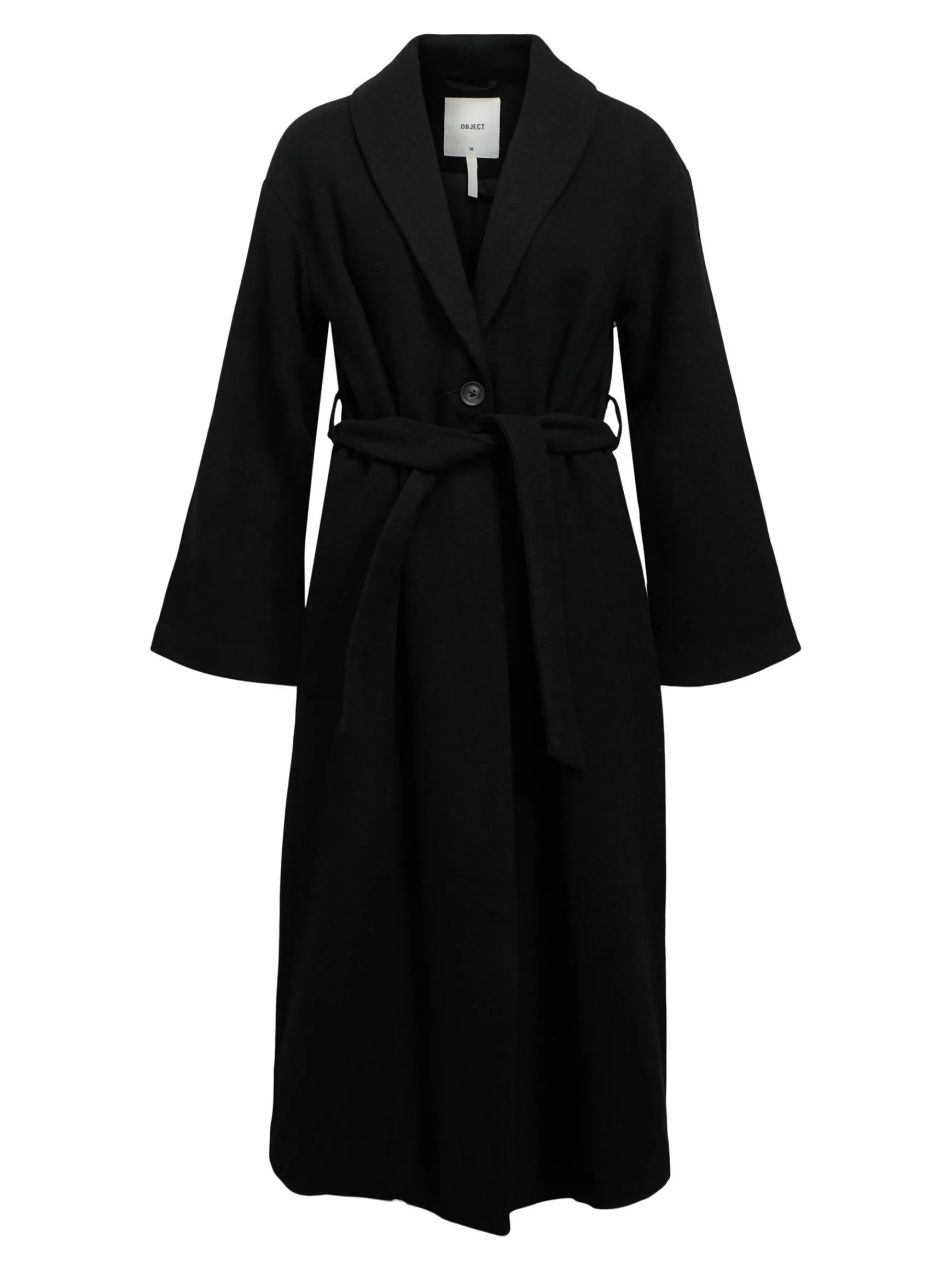 – Lang frakke i uldblanding- Sjal lapel- Knapper foran- Lange ærmer- Bindebælte i taljen- Foret- Almindelig pasform- Modellen er iført størrelse 36