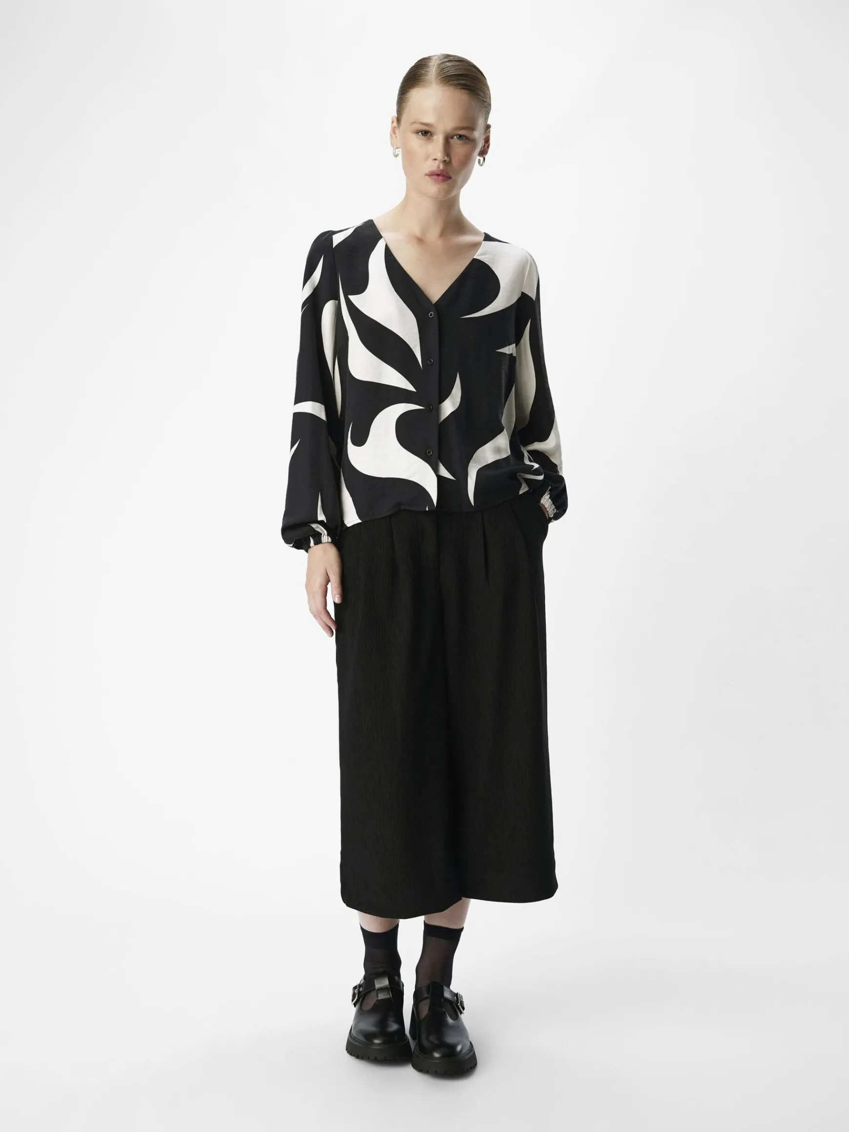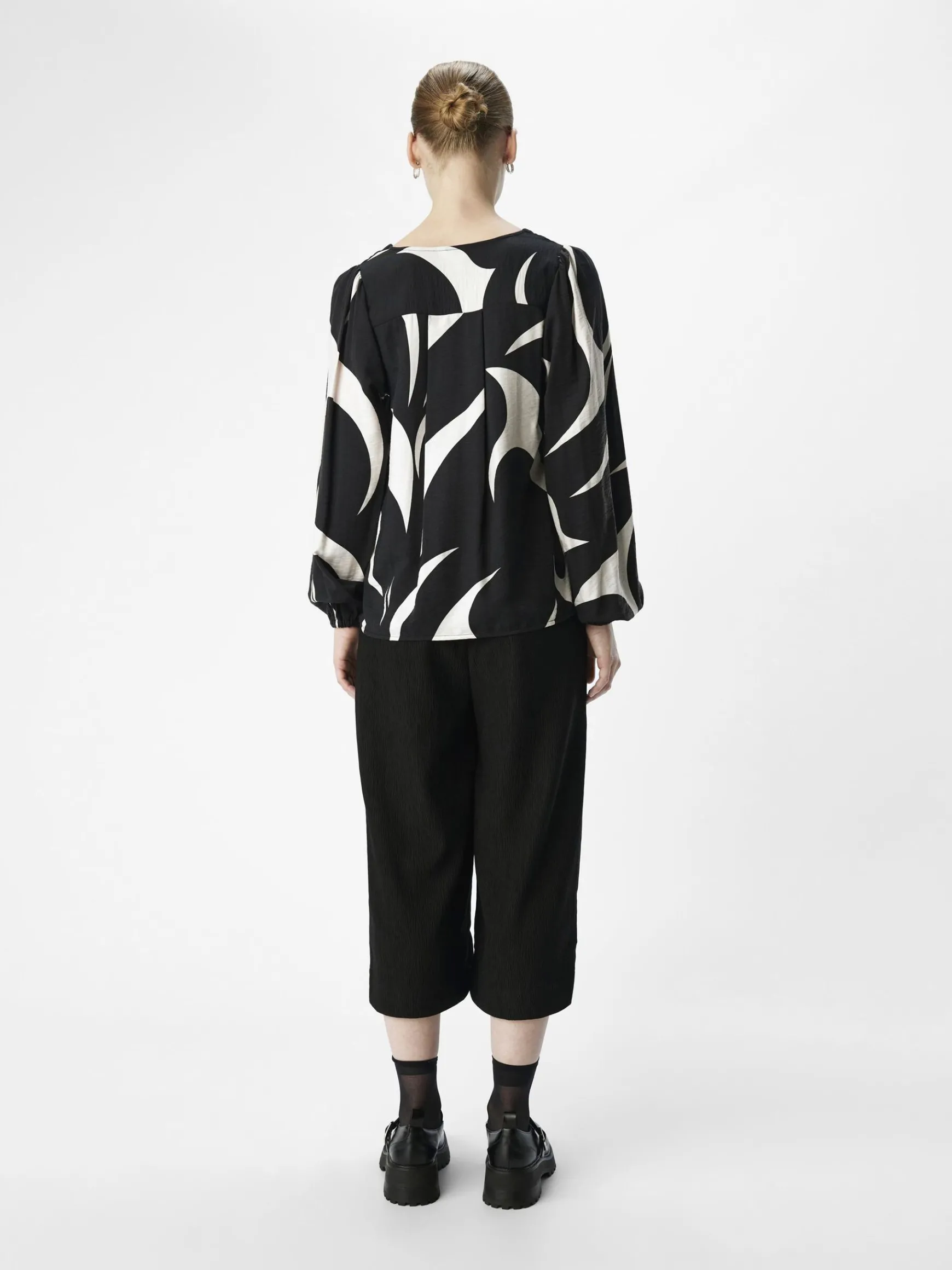 – Langærmet mønstret bluse – V-hals- Elastiske manchetter- Buet kant- Almindelig pasform