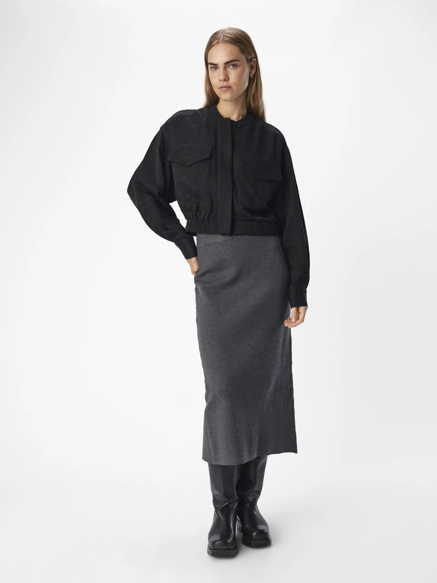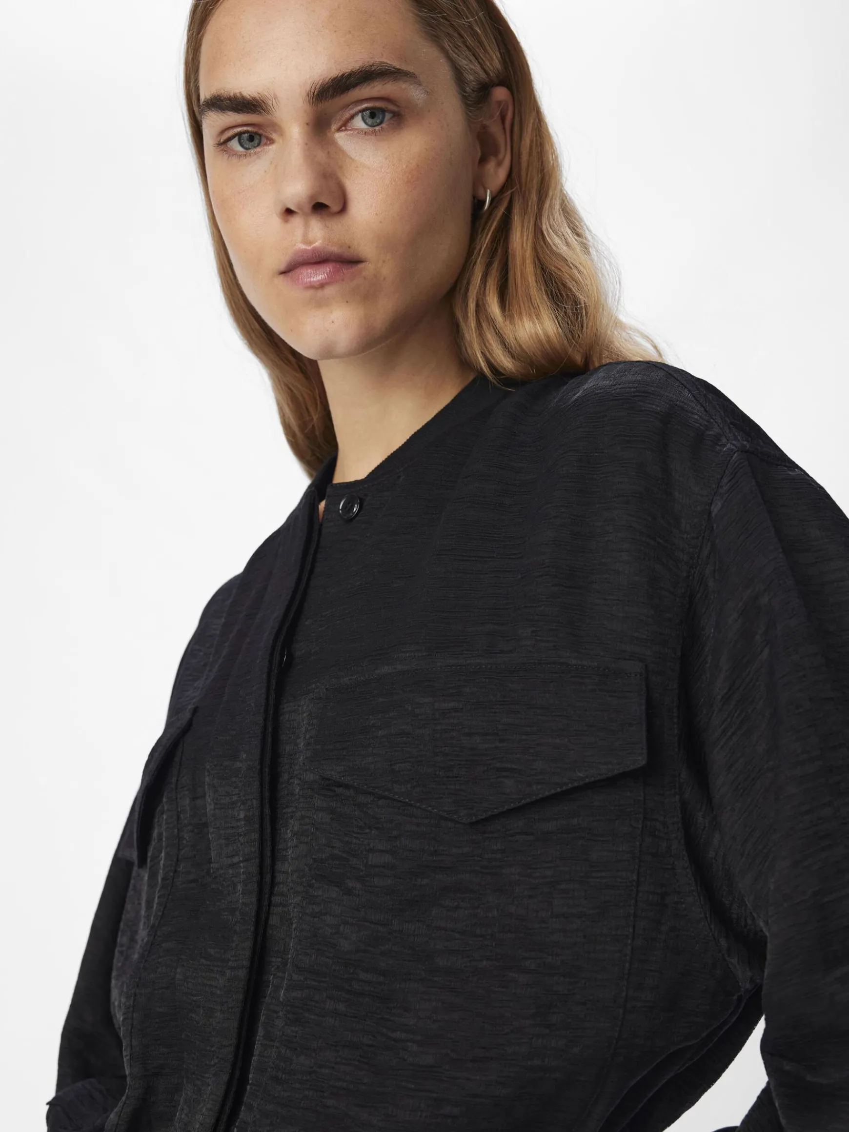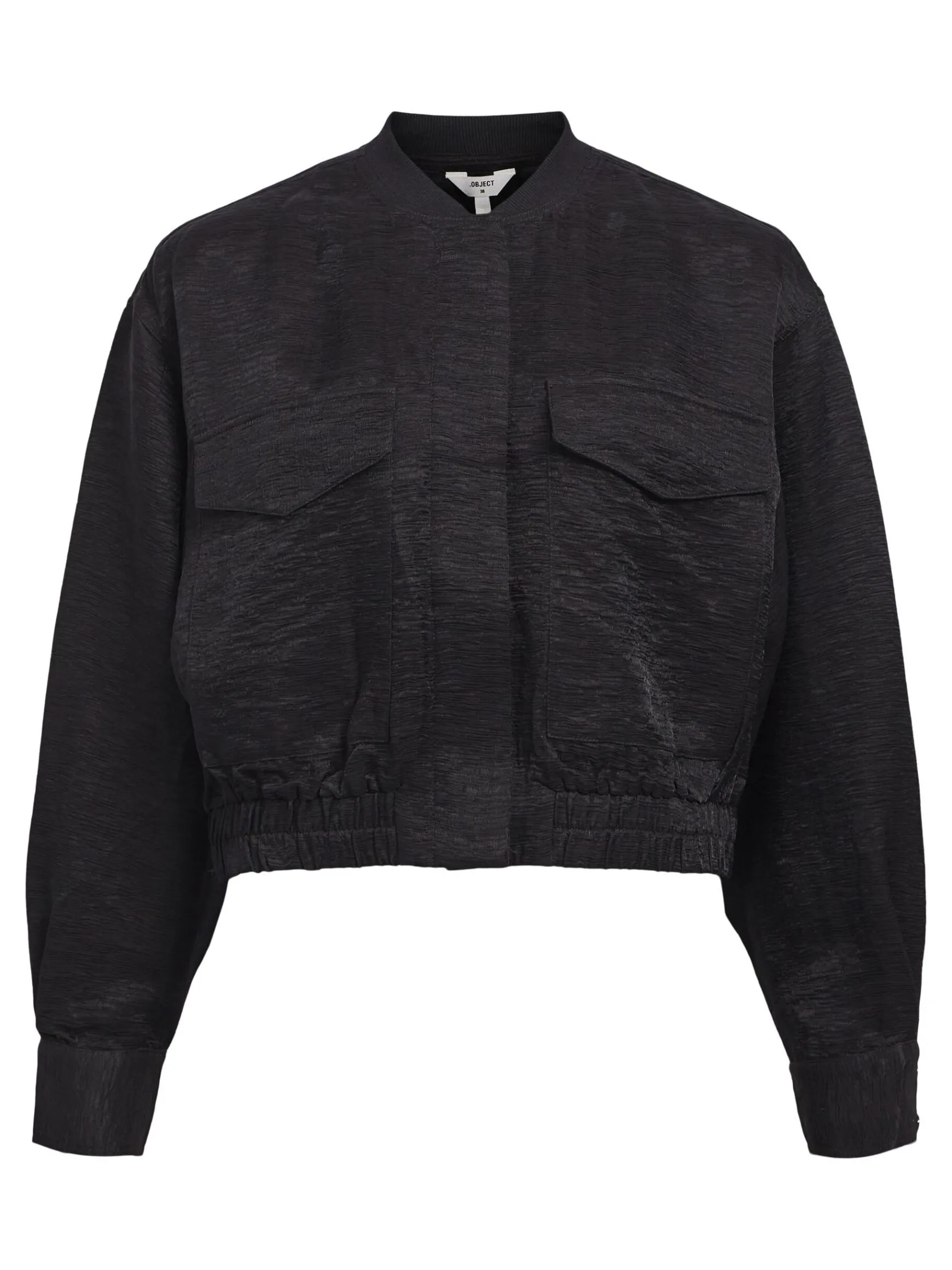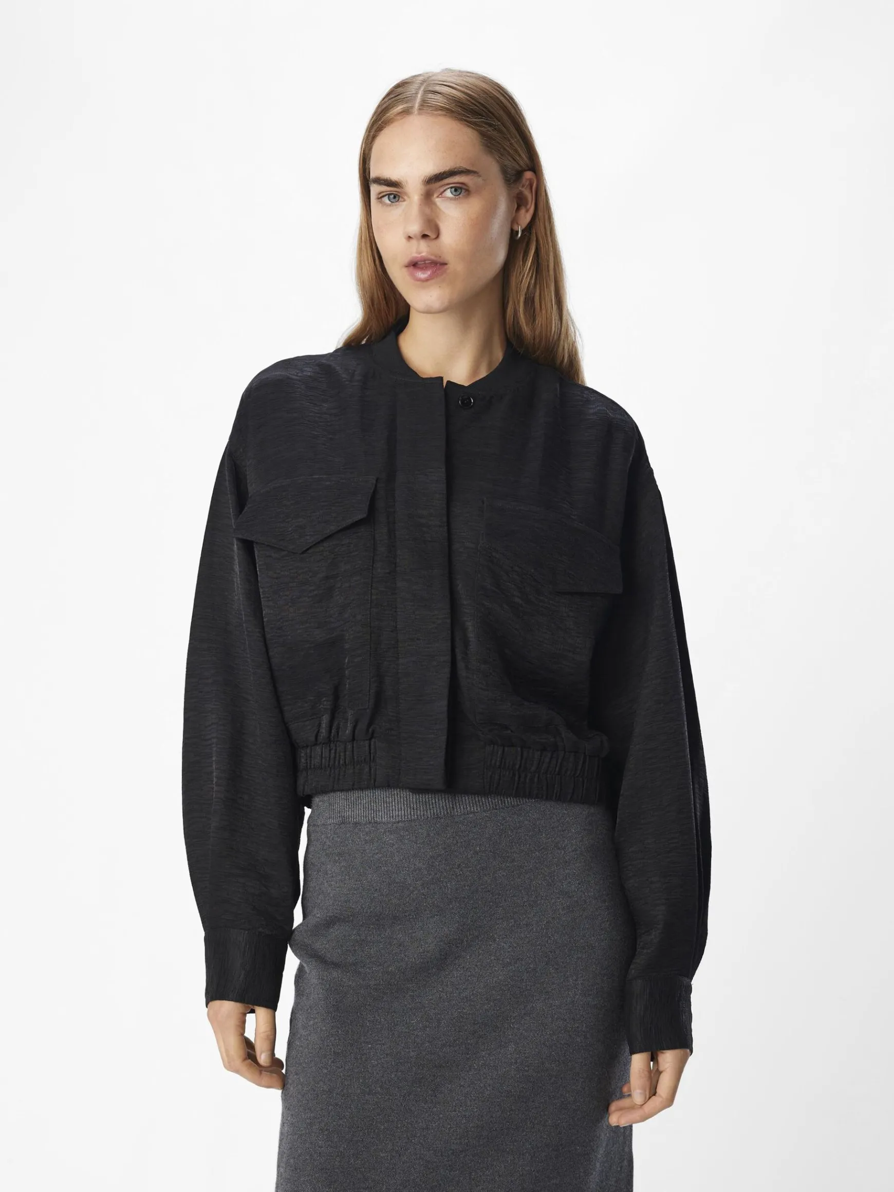 – Let bomberjakke- Baseball-krave- Lange ærmer- Knapper foran skjult af stolpe- Brystlommer- Kant med elastik- Almindel…