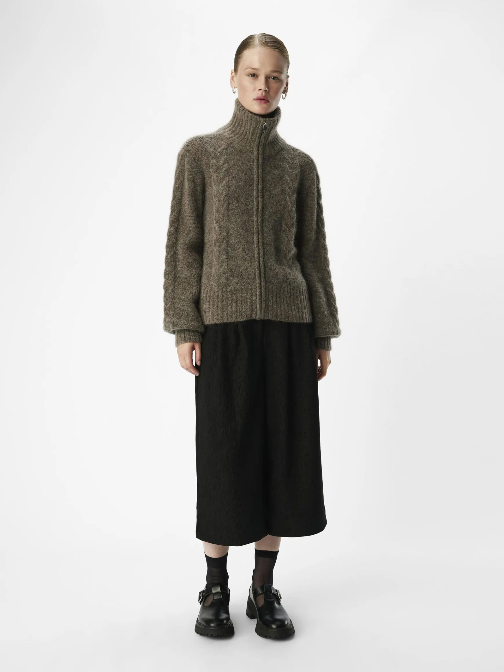 – Kabelstrikket cardigan med lynlås- Høj hals- Sænkede skuldre- Lange ærmer- Ribstrikket kant- Relaxed fit- Modellen…
