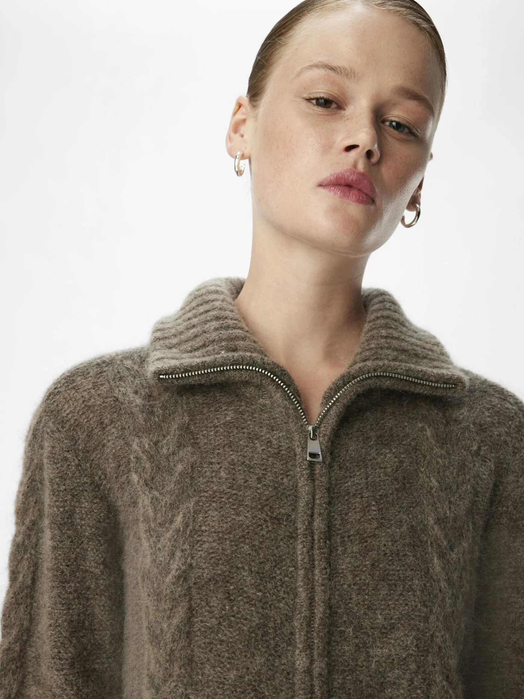 – Kabelstrikket cardigan med lynlås- Høj hals- Sænkede skuldre- Lange ærmer- Ribstrikket kant- Relaxed fit- Modellen er iført størrelse 36