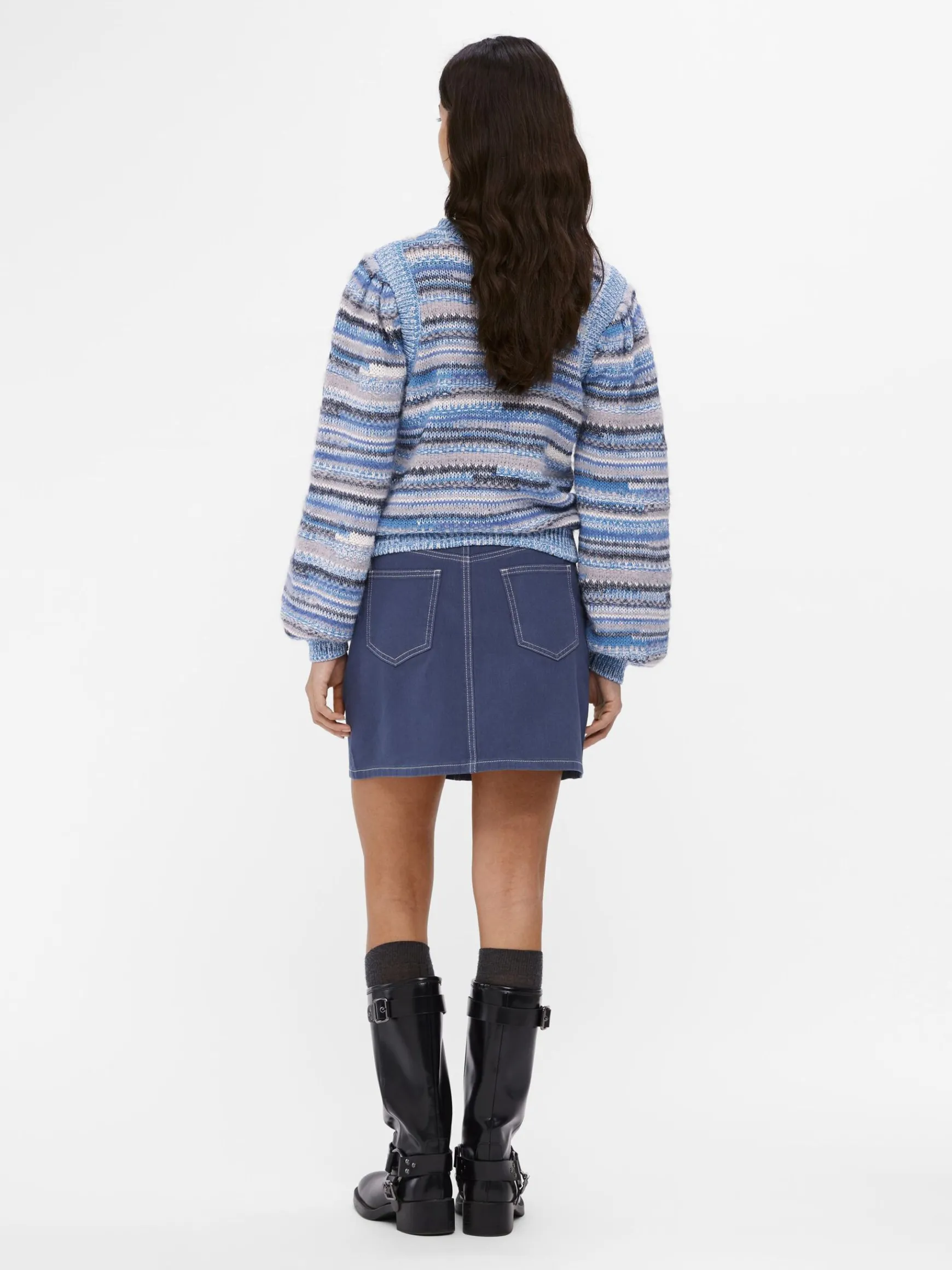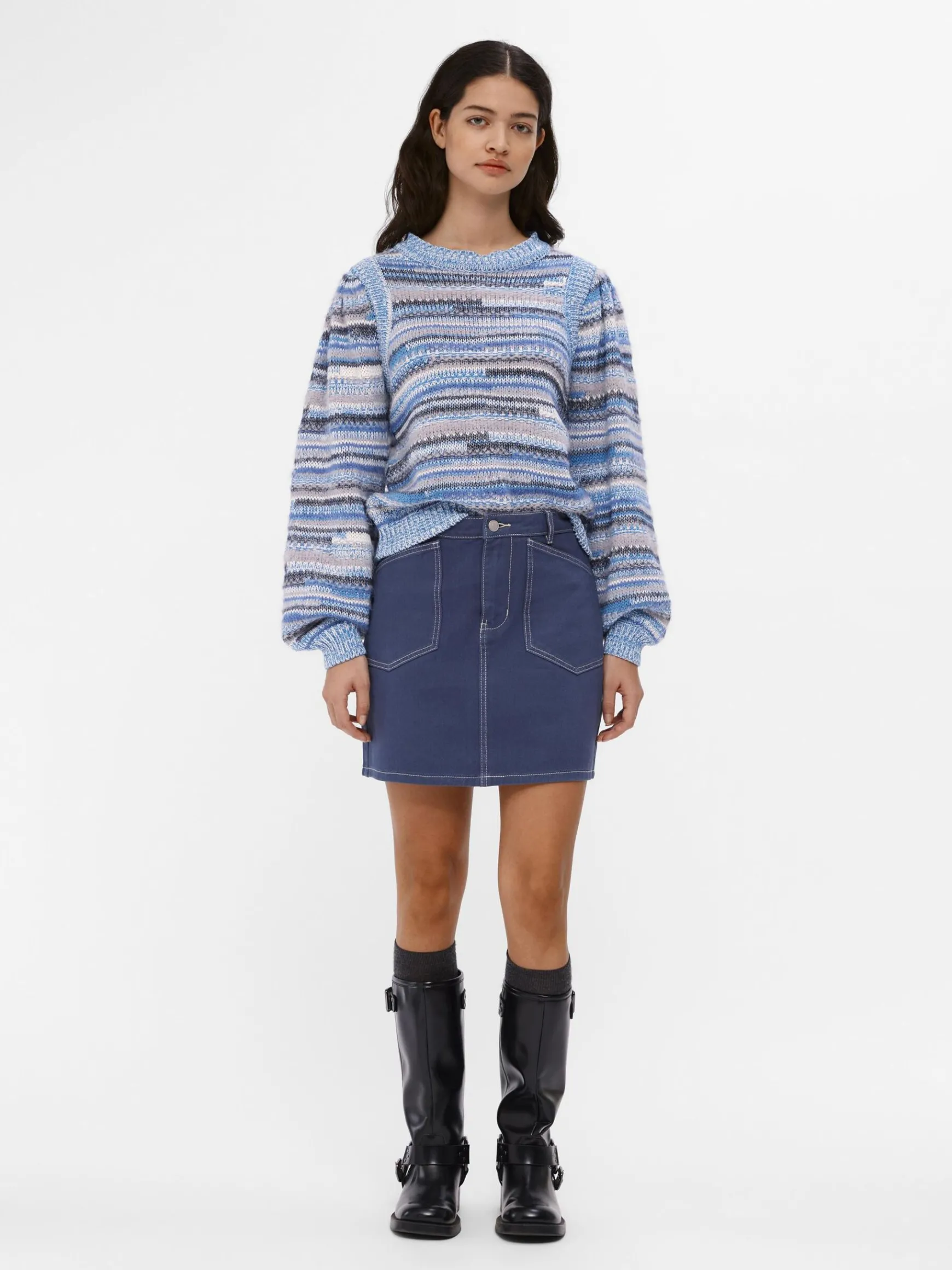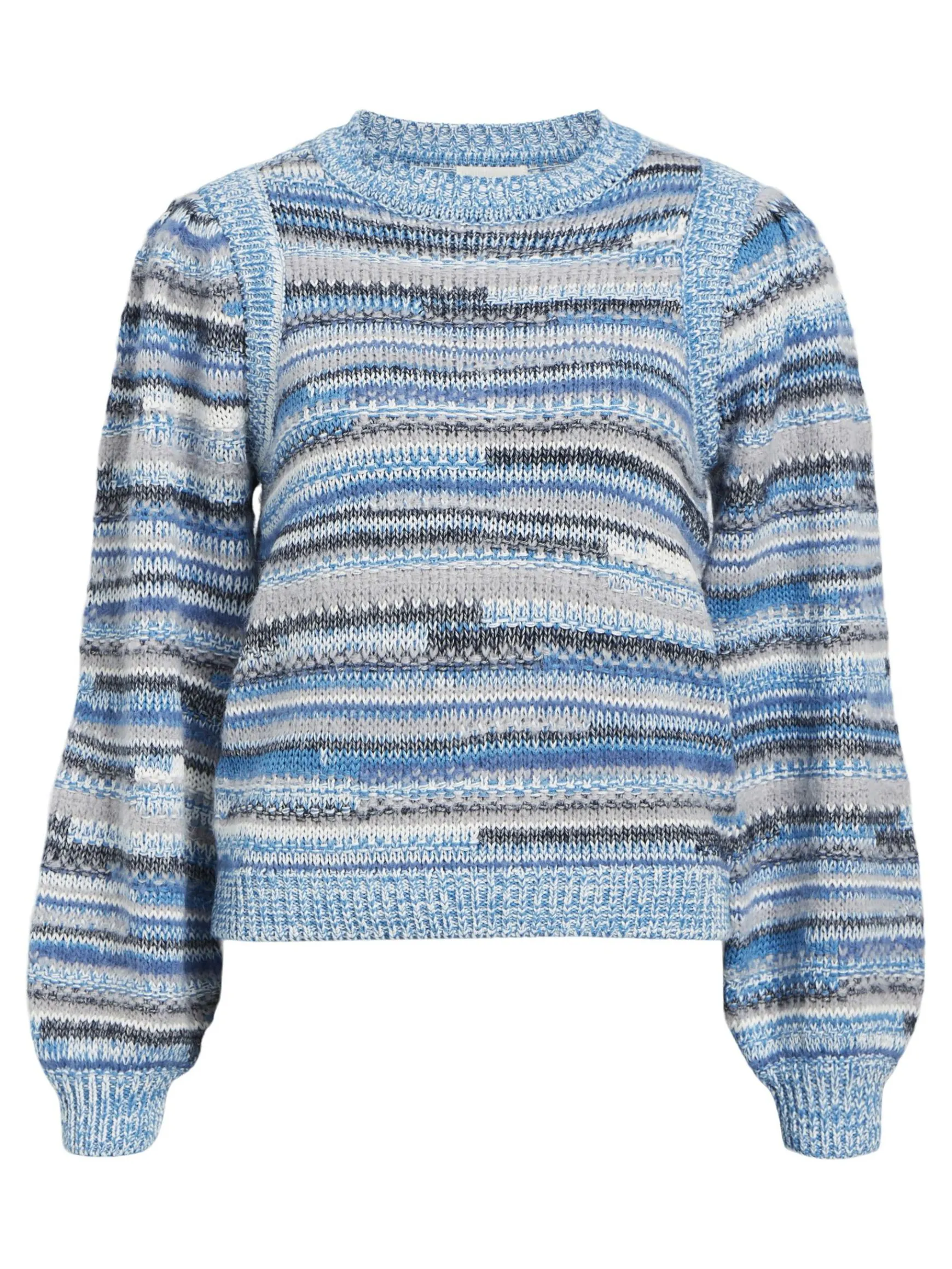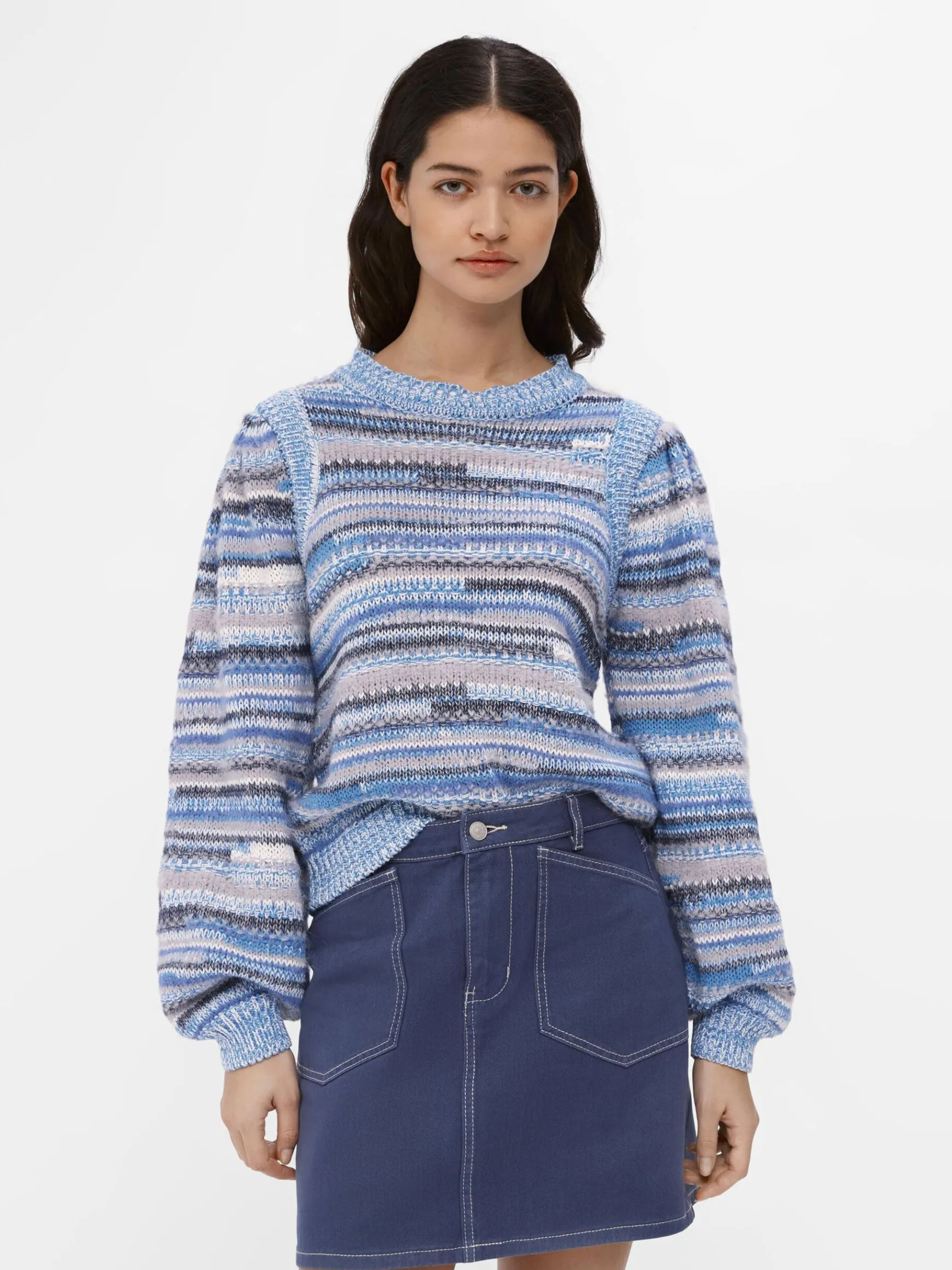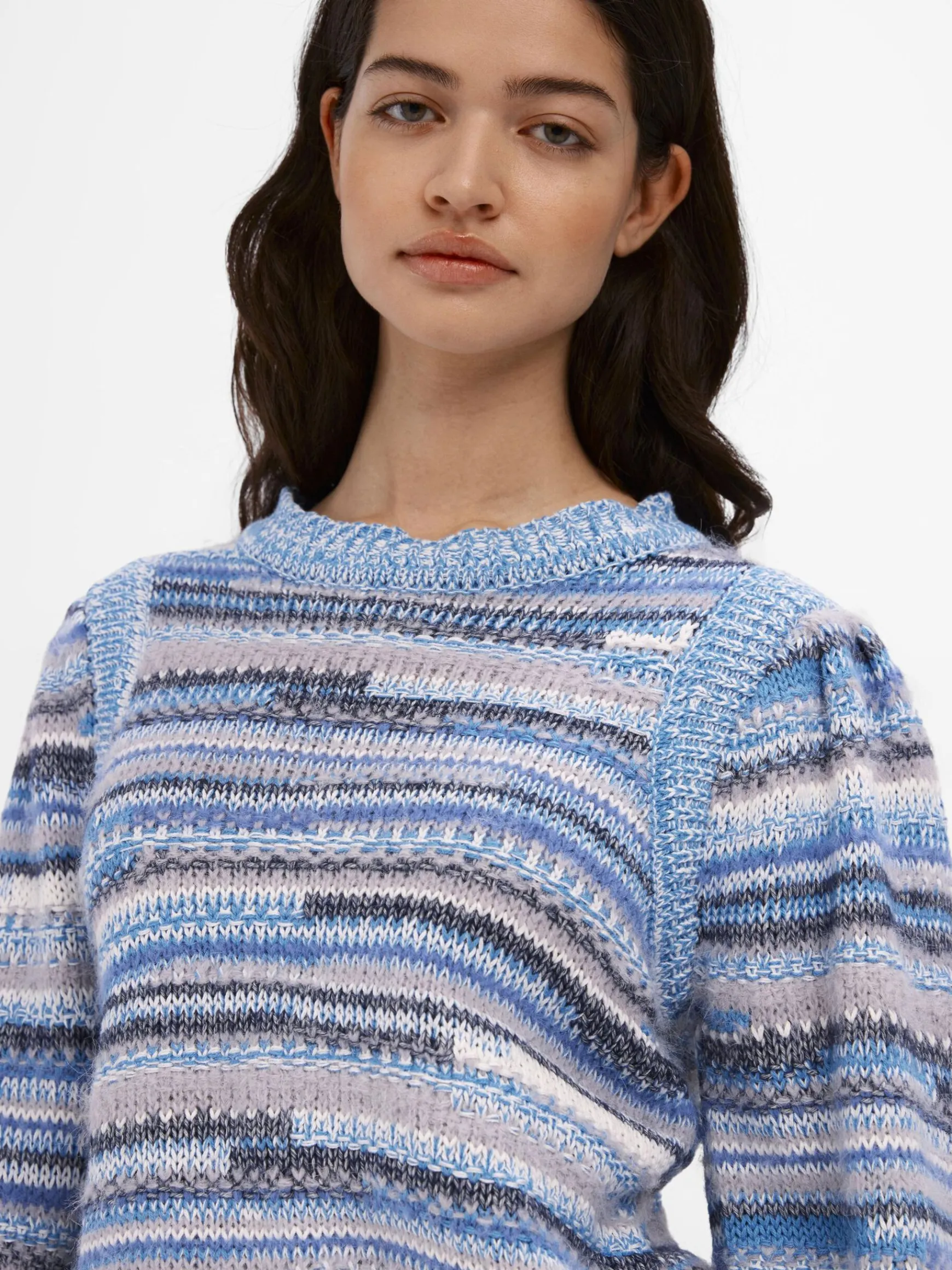 – Strikket meleret trøje- Rund halsudskæring- Lange voluminøse ærmer- Ribbede kanter i kontrast- Almindelig pasform