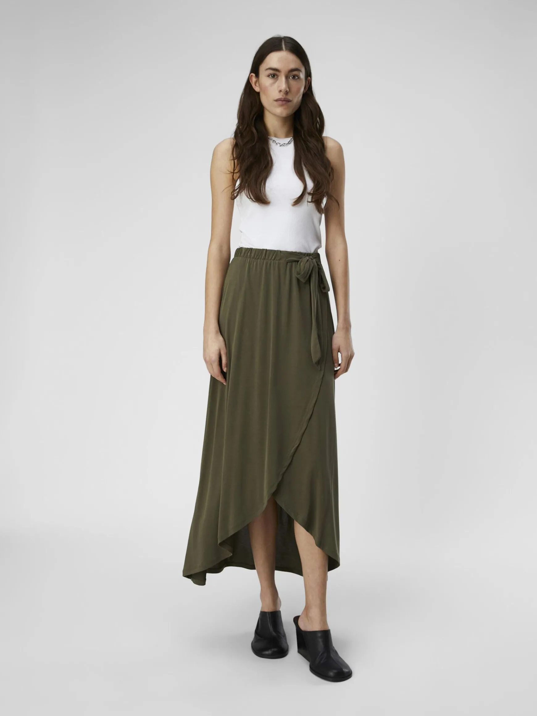 – Midi nederdel med bindebånd- Falsk slå-om effekt- Let, strækbart materiale- Elastik i taljen- Længde foran: 62 cm …