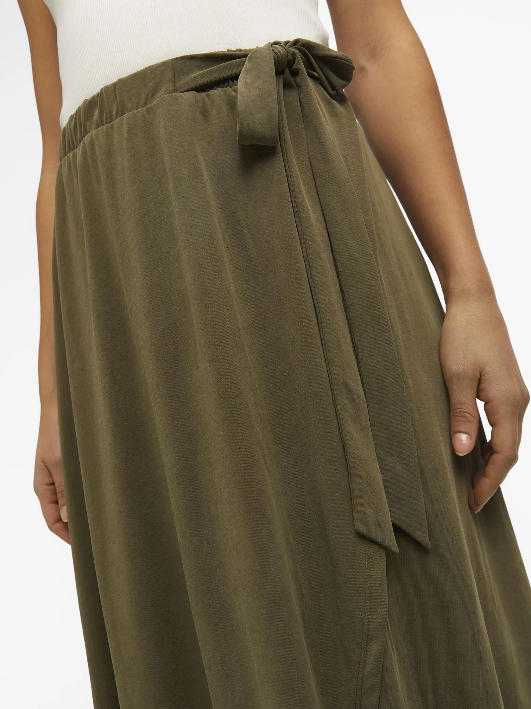 – Midi nederdel med bindebånd- Falsk slå-om effekt- Let, strækbart materiale- Elastik i taljen- Længde foran: 62 cm i str. 38- Længde bagpå: 94 cm i str. 38- Vores model er 178 cm høj og er iført str. 38