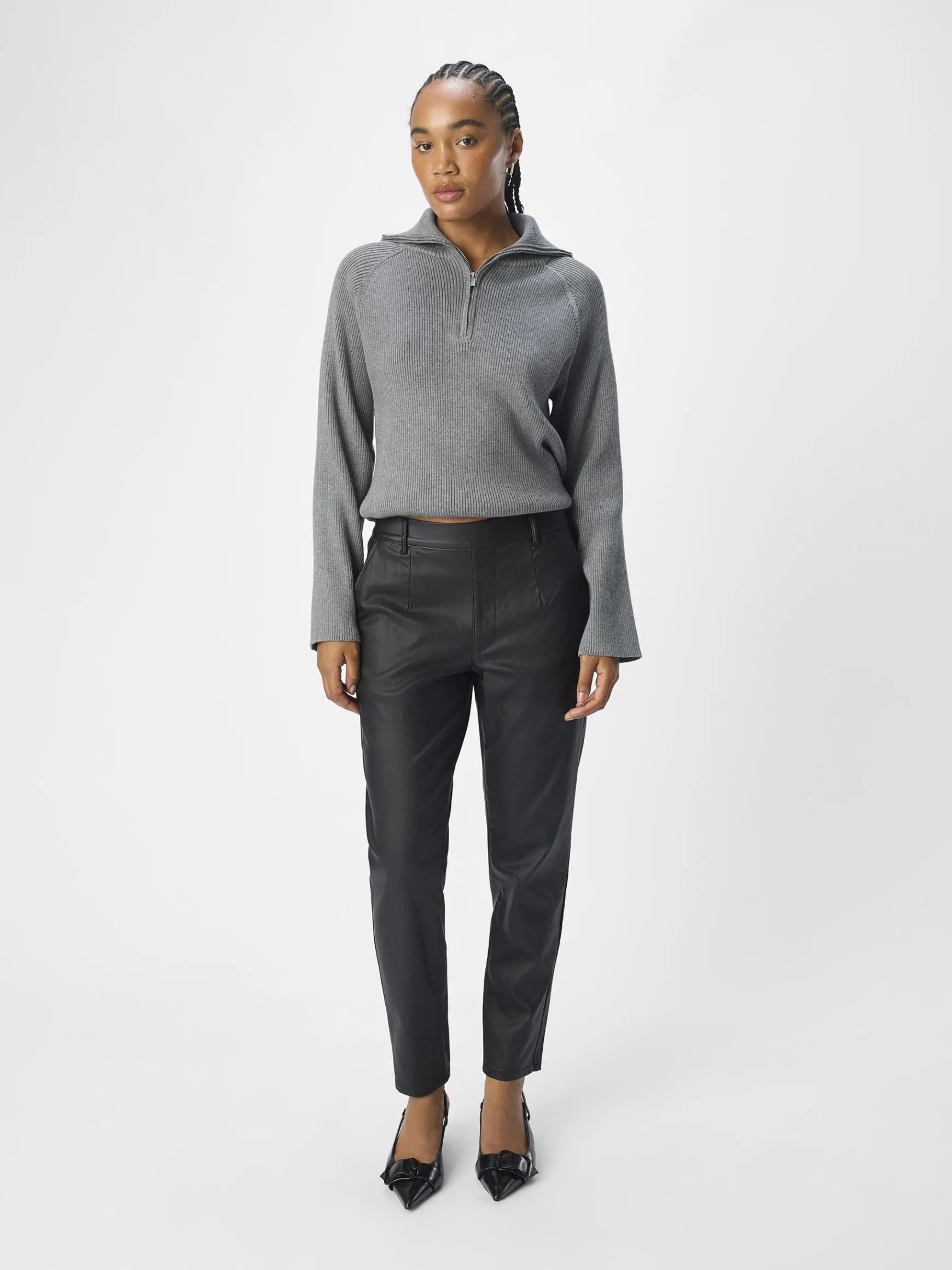 – Coated bukser- Straight fit- Elastik bagpå- To lommer- To falske lommer bagpå- Indvendig benlængde: 72 cm i str. 38- Skridtsøm: 26,5 cm i str. 38- Vores model er 178 cm høj og er iført str. 38