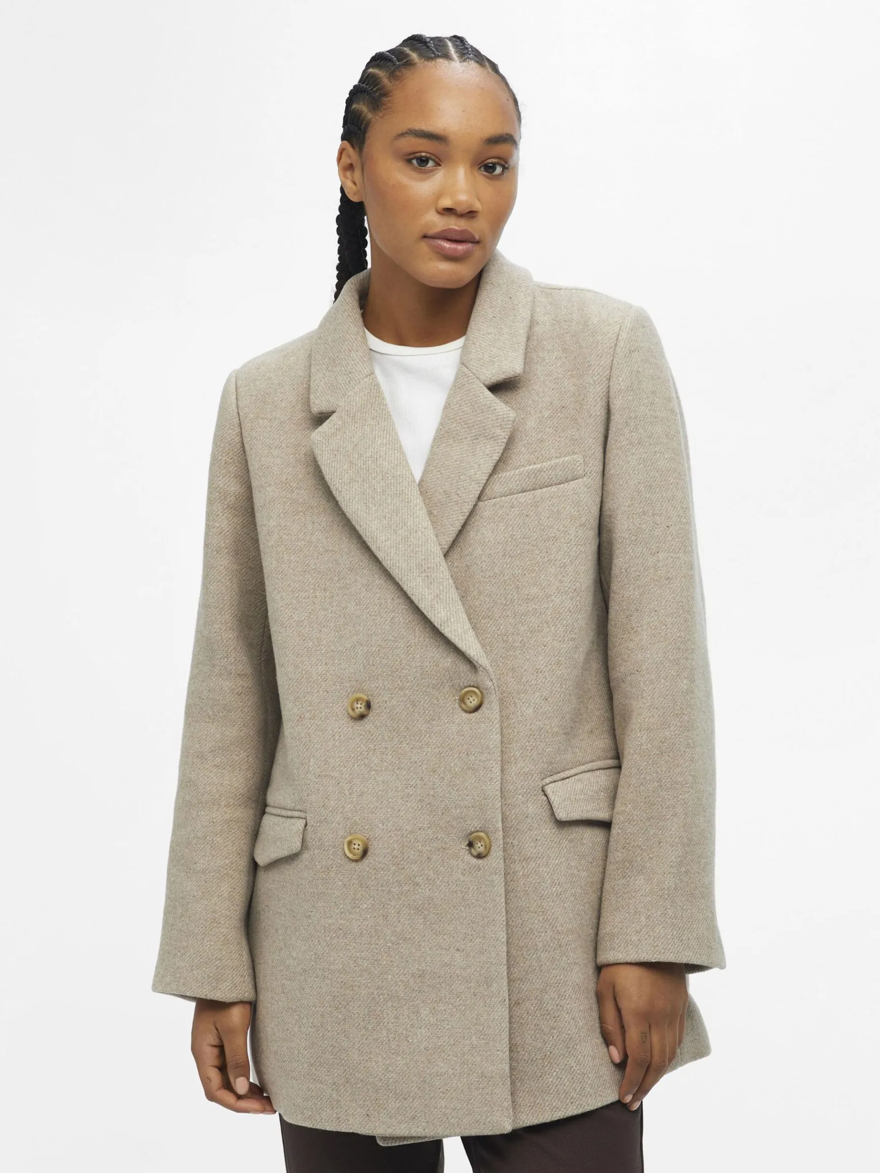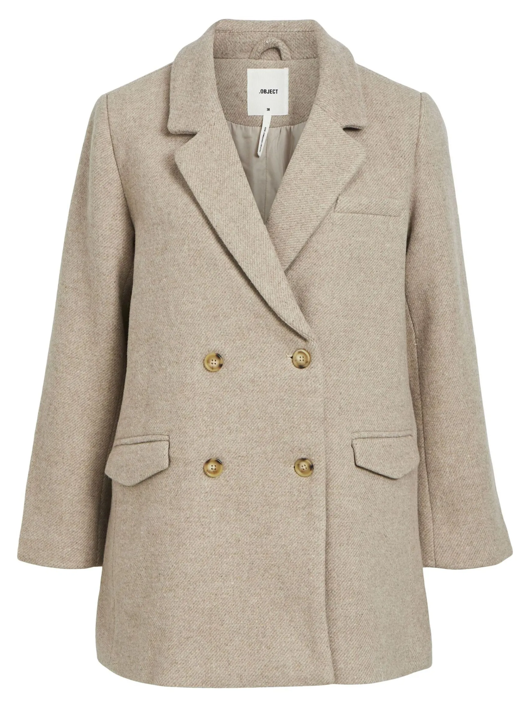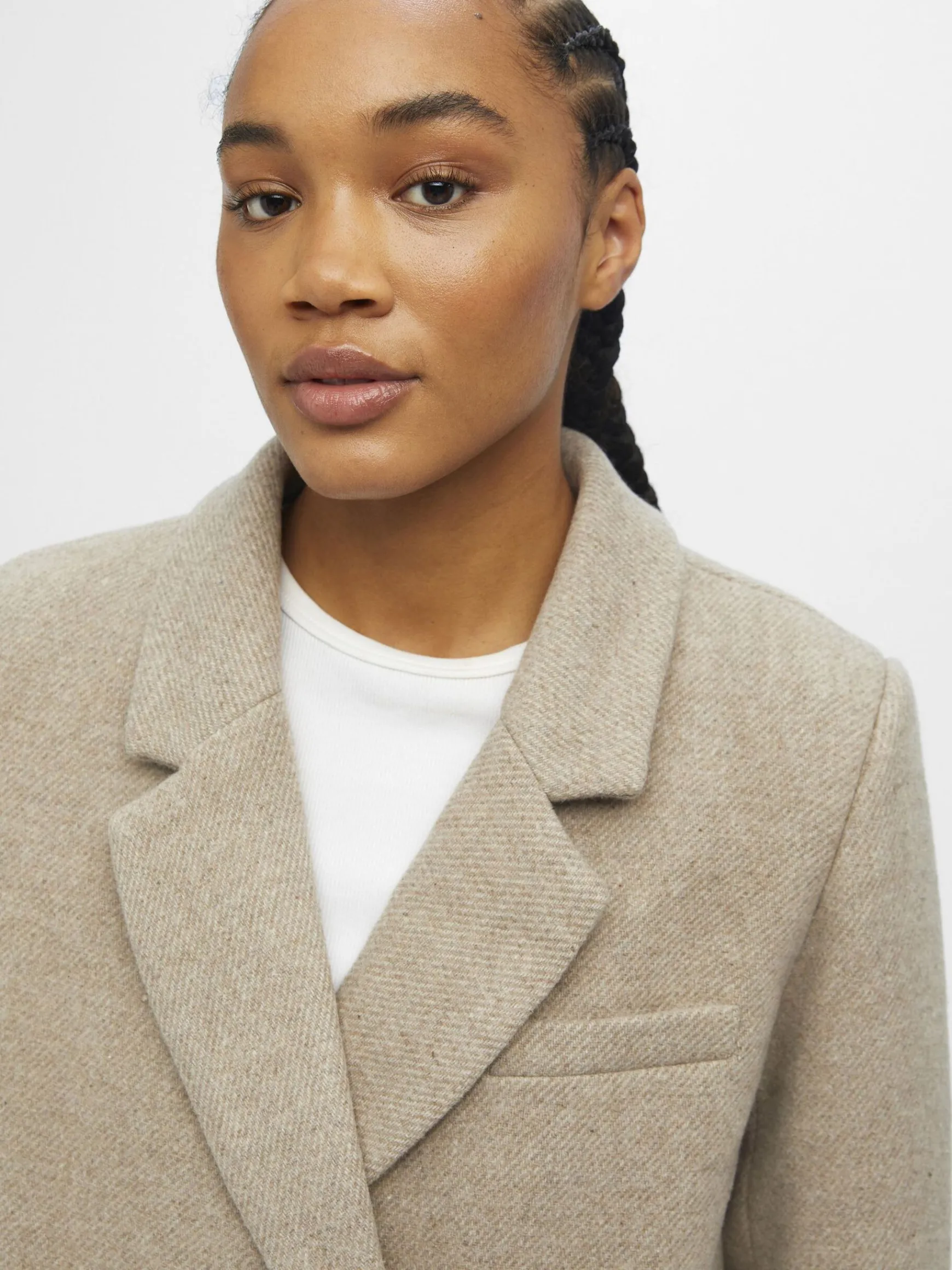 – Dobbeltradet- Hakket revers- Lange ærmer- Paspoleret brystlomme- Lukkes med knapper med skildpaddemønster- Stolpelommer foran med flapper- Firkantet pasform- Modellen er iført størrelse 36- Denne models højde er 173 cm