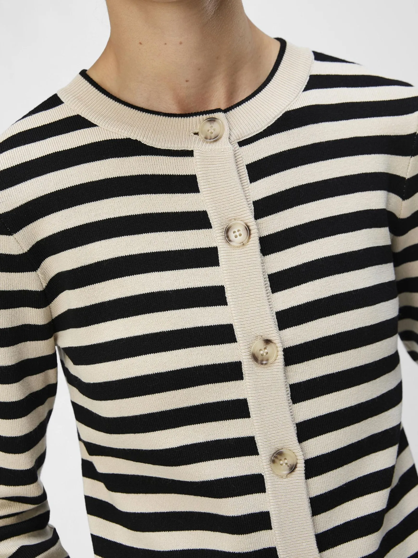 – Slim fit strikket cardigan- Rund hals- Lange ærmer- Knapper foran- Ribbede kanter- Modellen er iført størrelse 36
