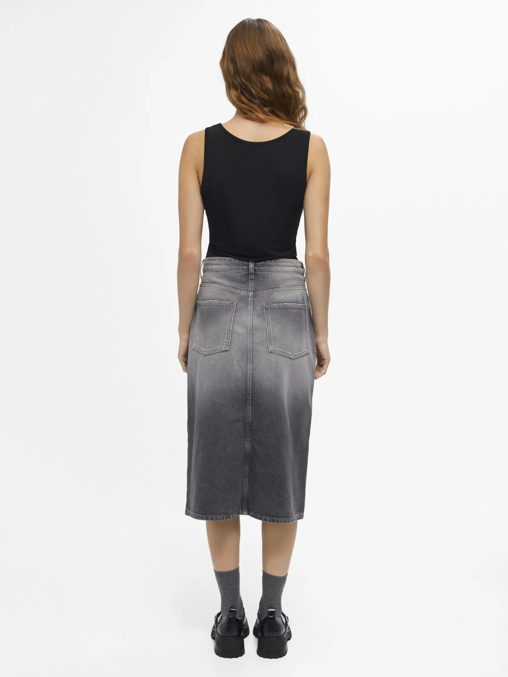– Højtaljet denim-midinederdel- Lyseblå vask med falmede detaljer- Design med 5 lommer- Slidsdetalje foran- Lynlås i …