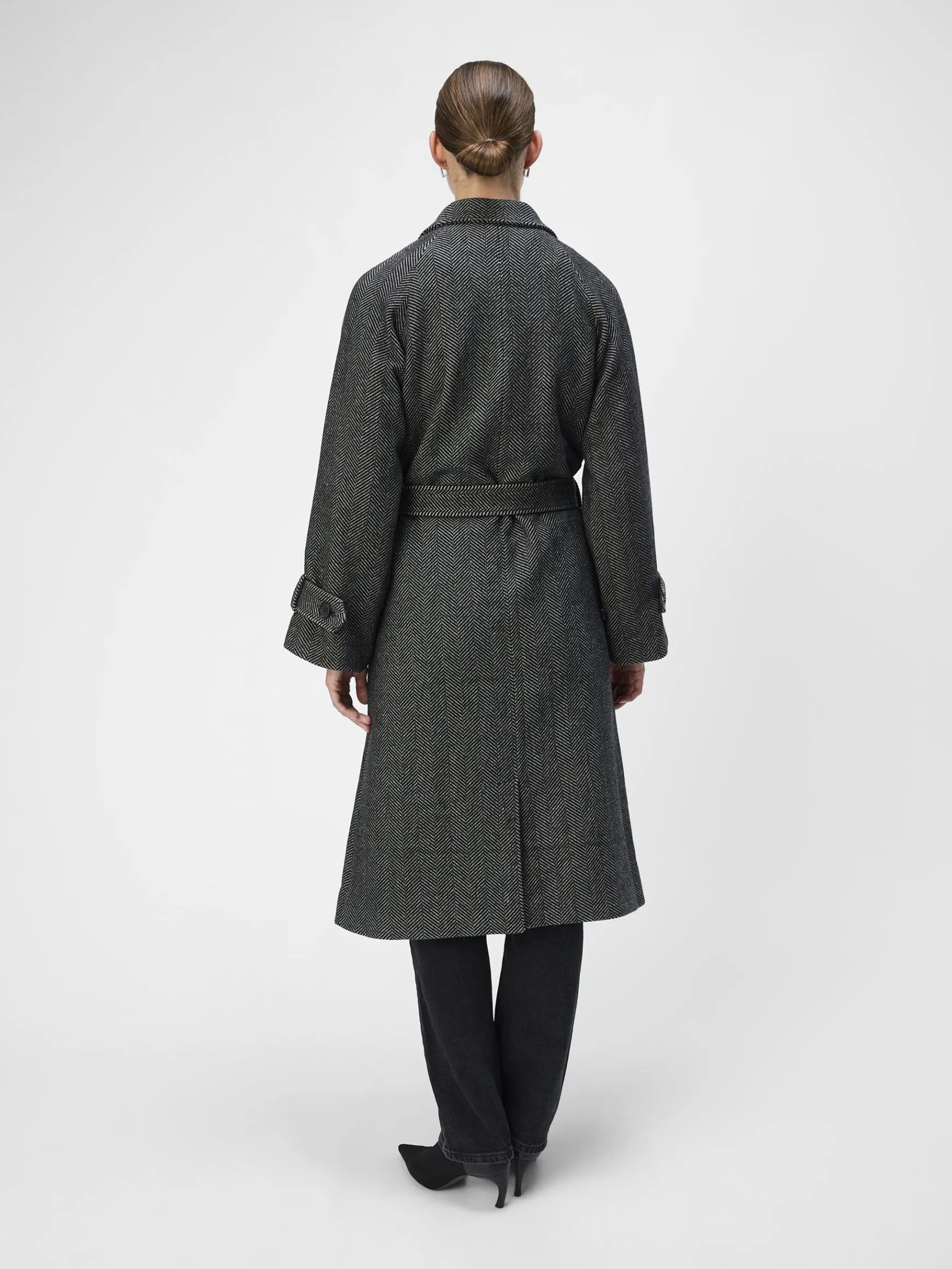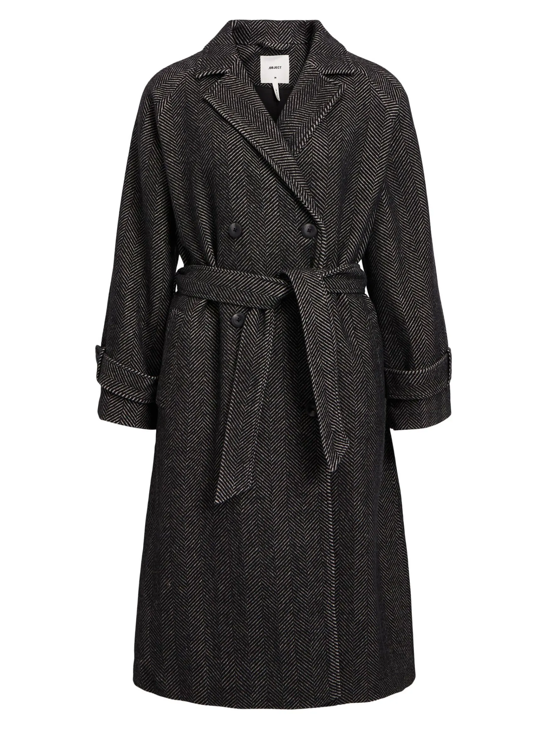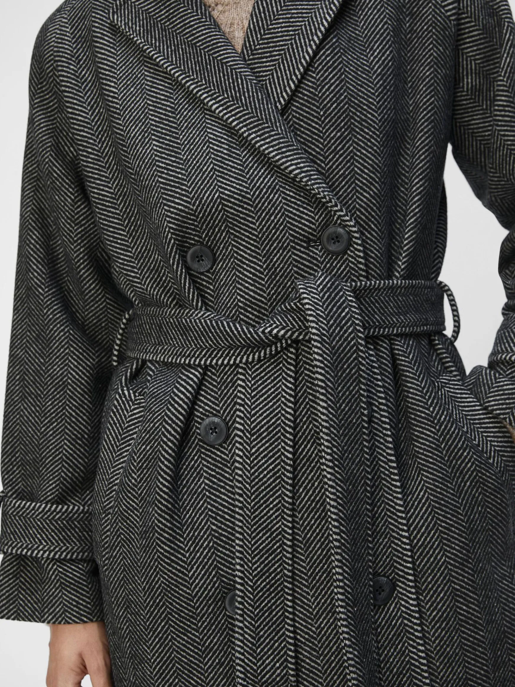 – Revers med hak- Dobbeltradet stil- Bindebælte- Tragtærmer- Fastspændte manchetter- Skrå sidelommer- Straight fitIN…
