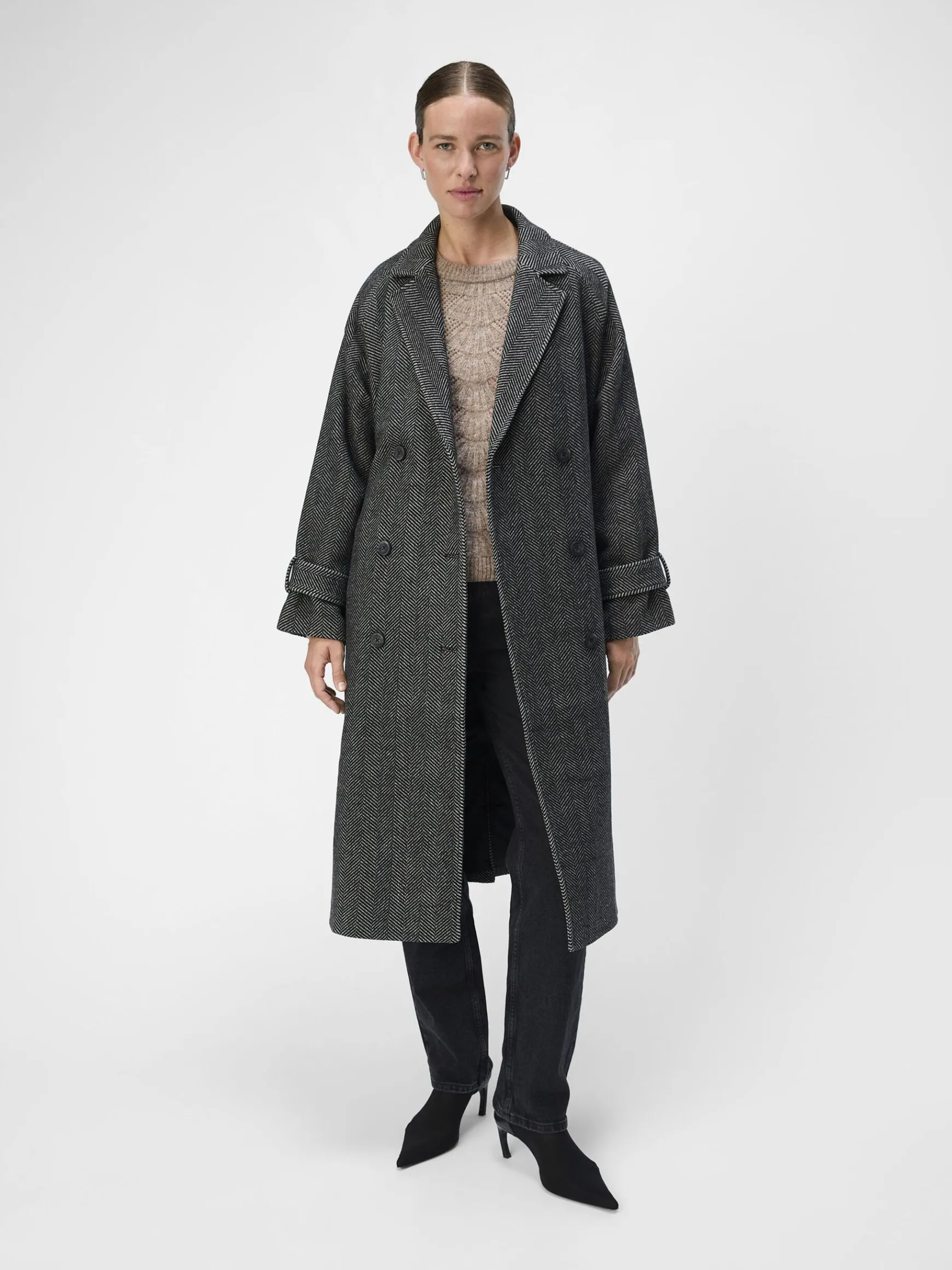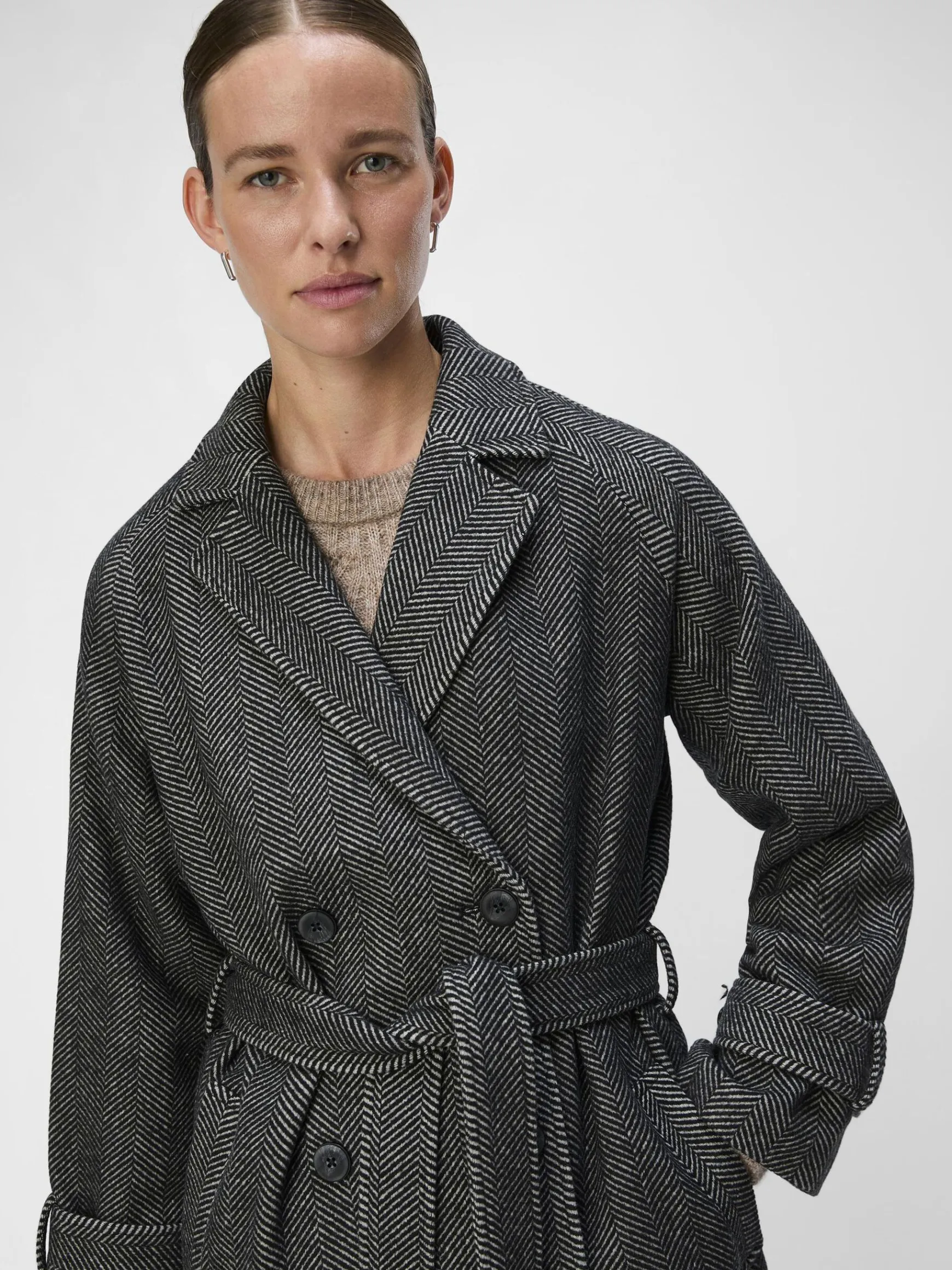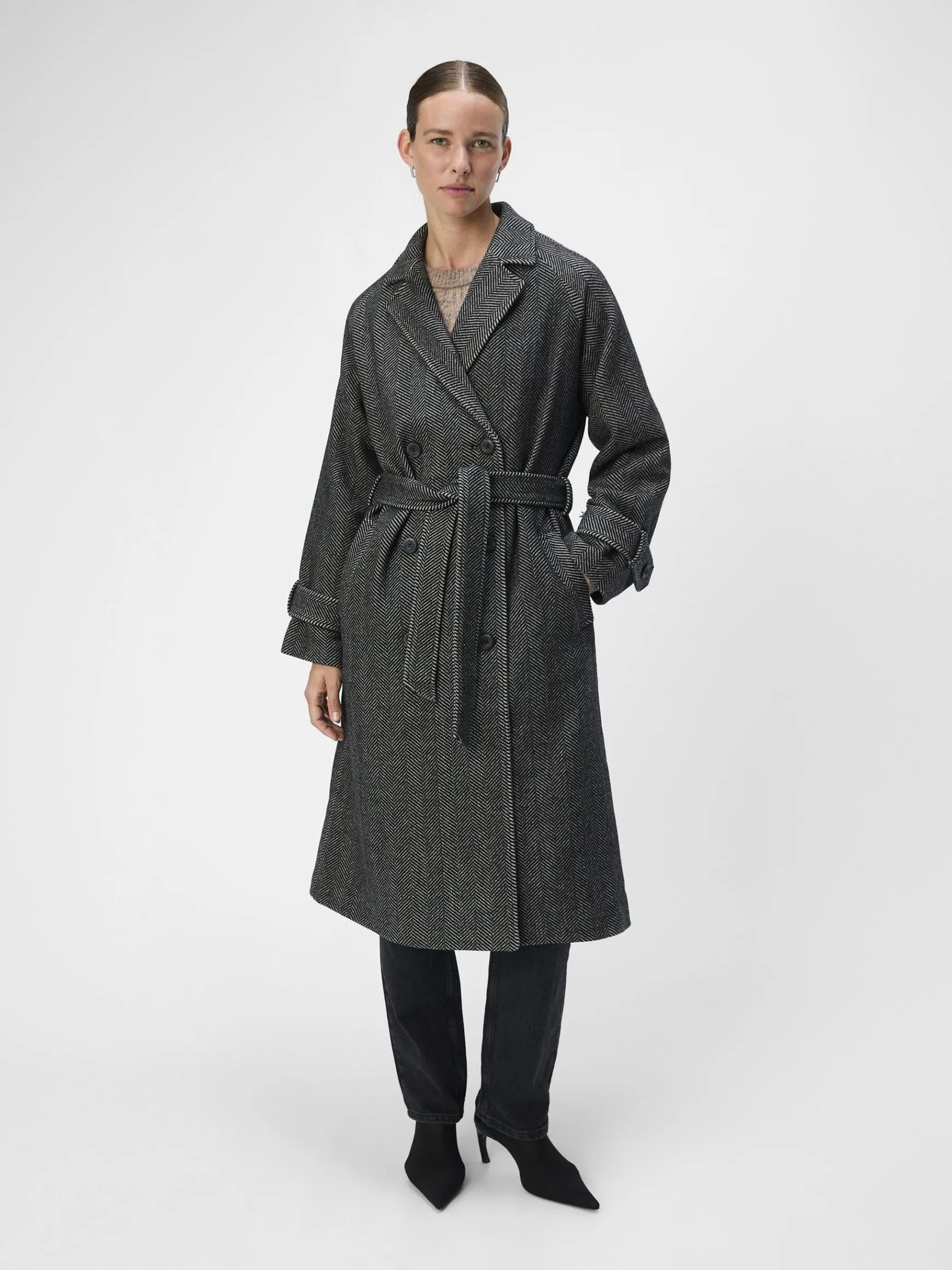 – Revers med hak- Dobbeltradet stil- Bindebælte- Tragtærmer- Fastspændte manchetter- Skrå sidelommer- Straight fitIN…