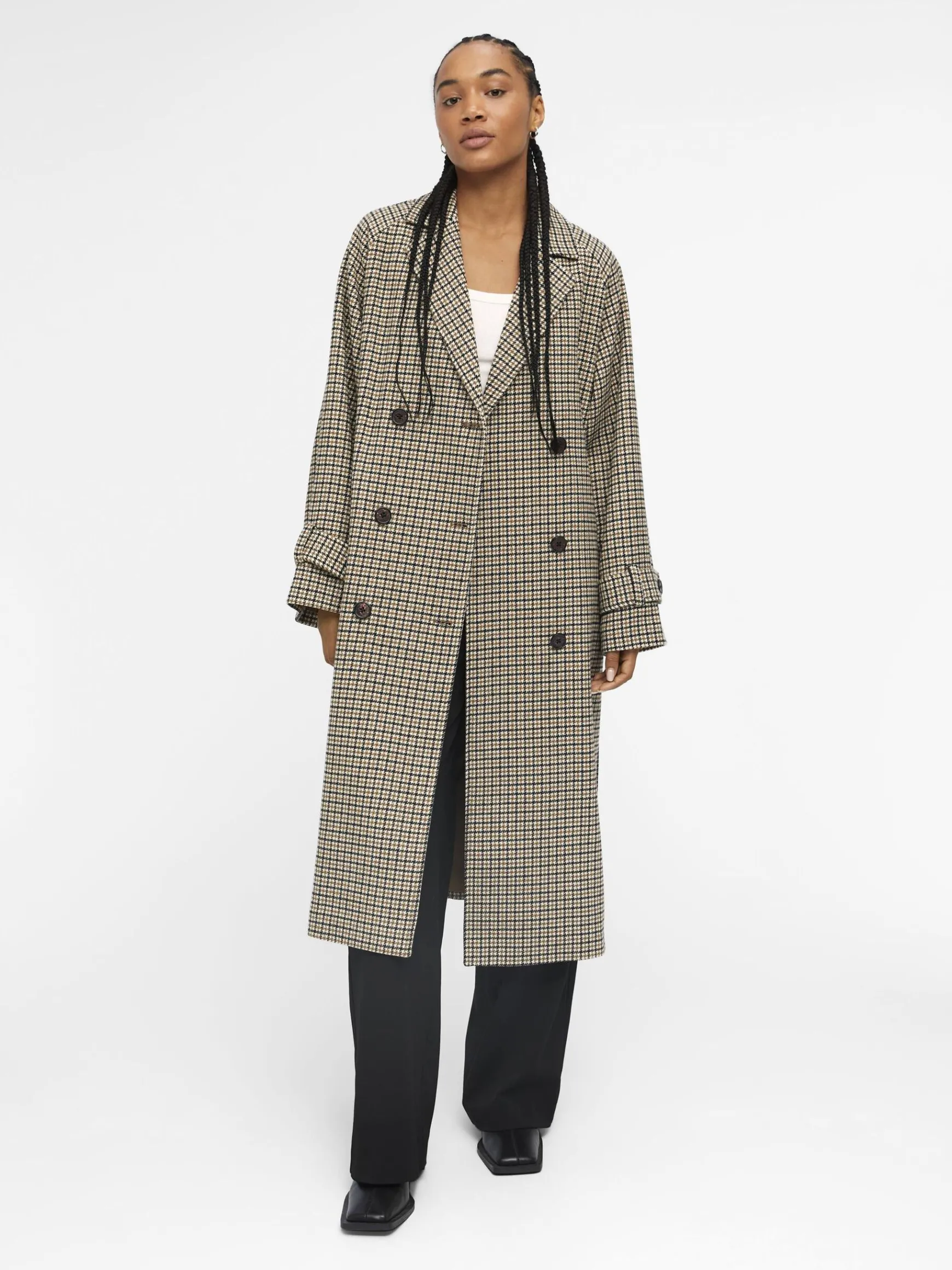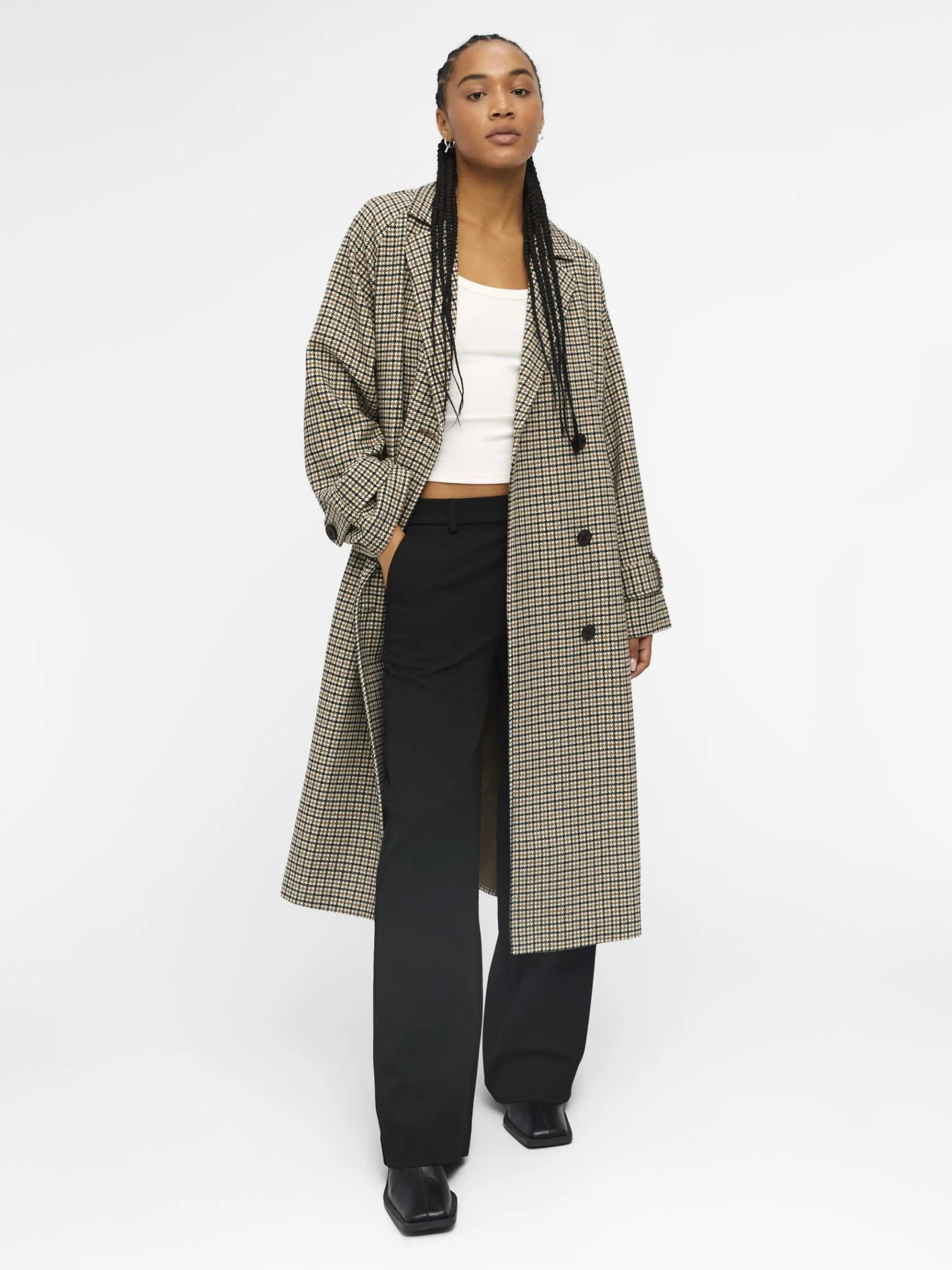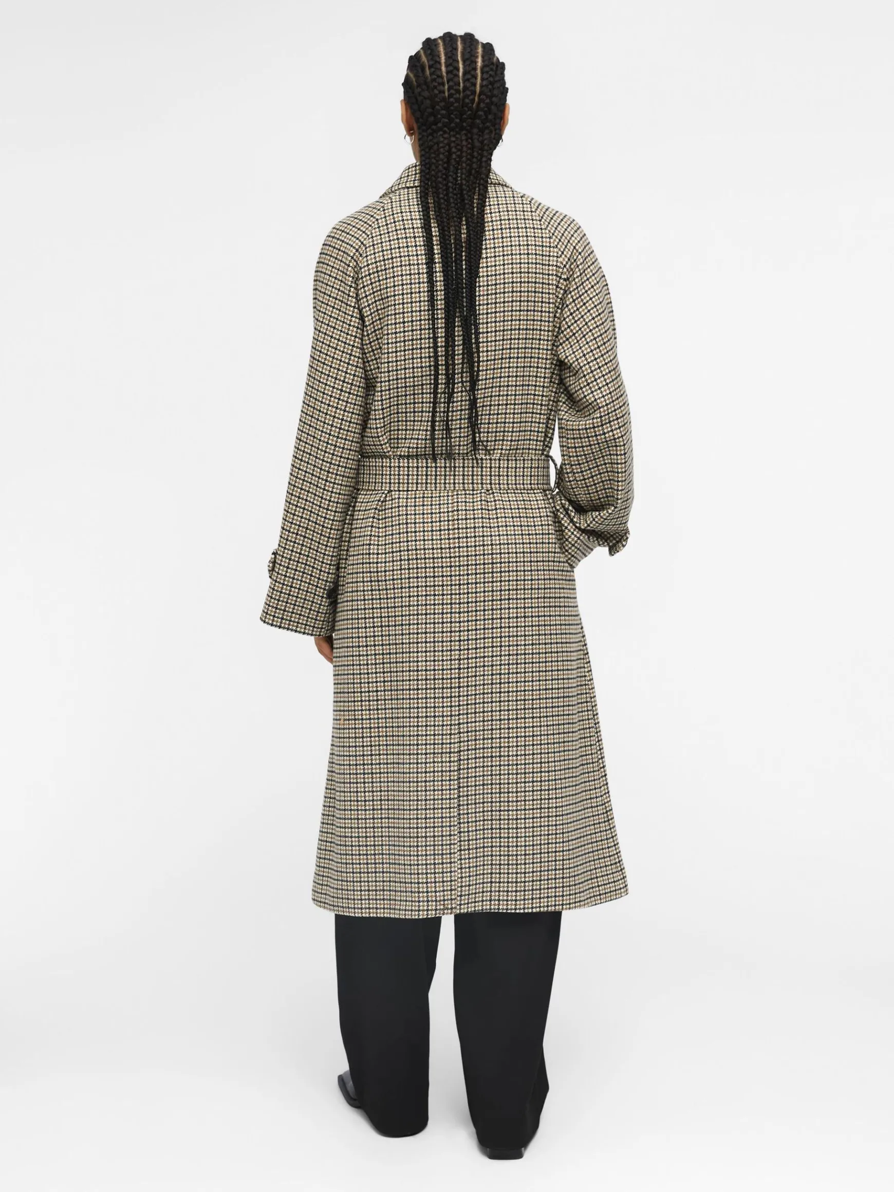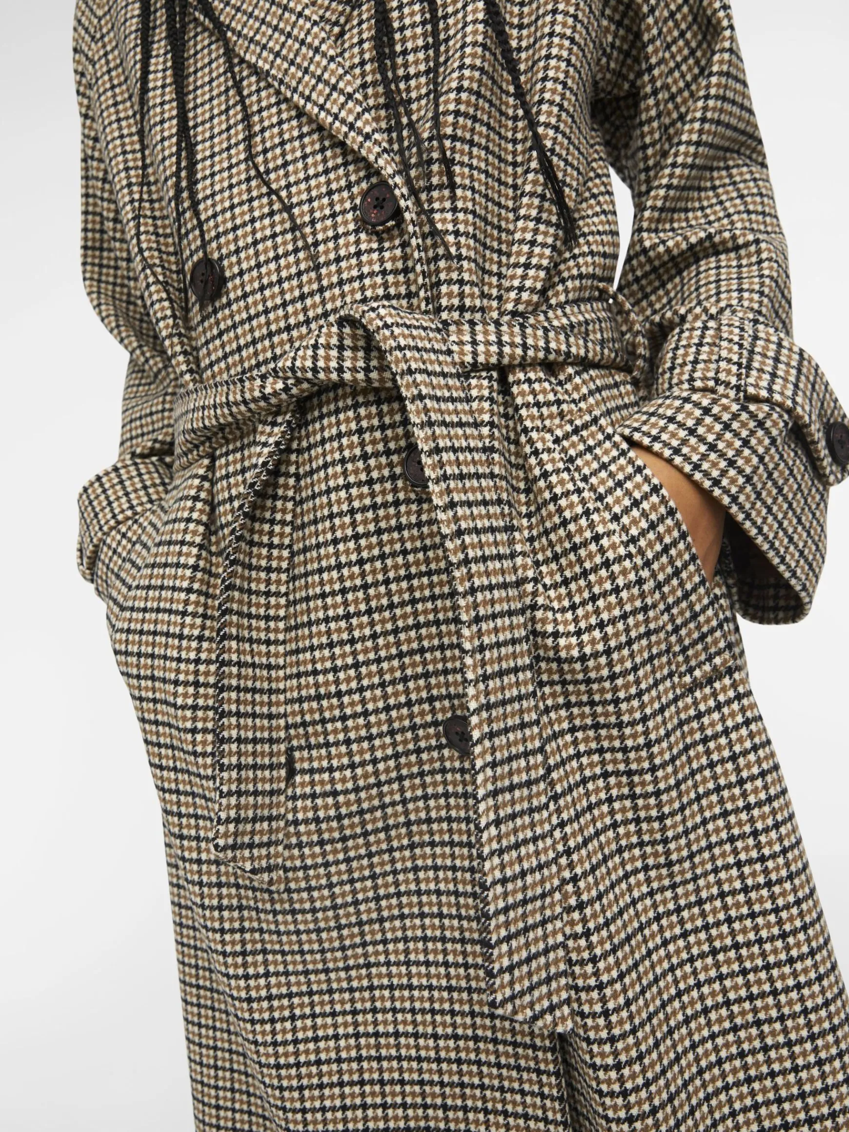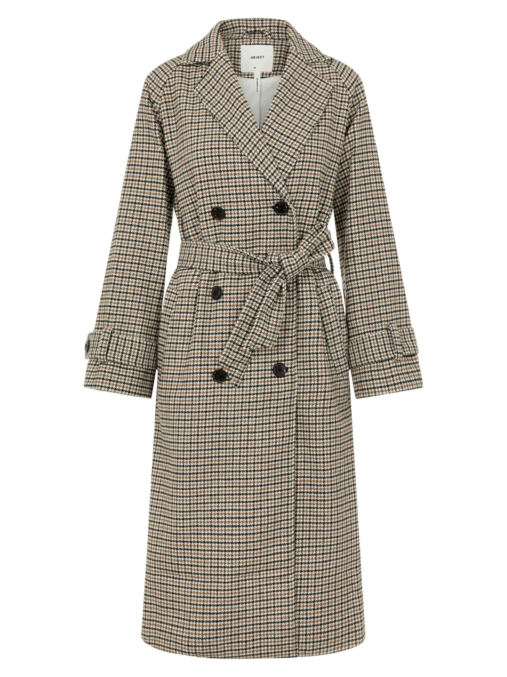 – Revers med hak- Dobbeltradet stil- Bindebælte- Tragtærmer- Fastspændte manchetter- Skrå sidelommer- Straight fitIN…