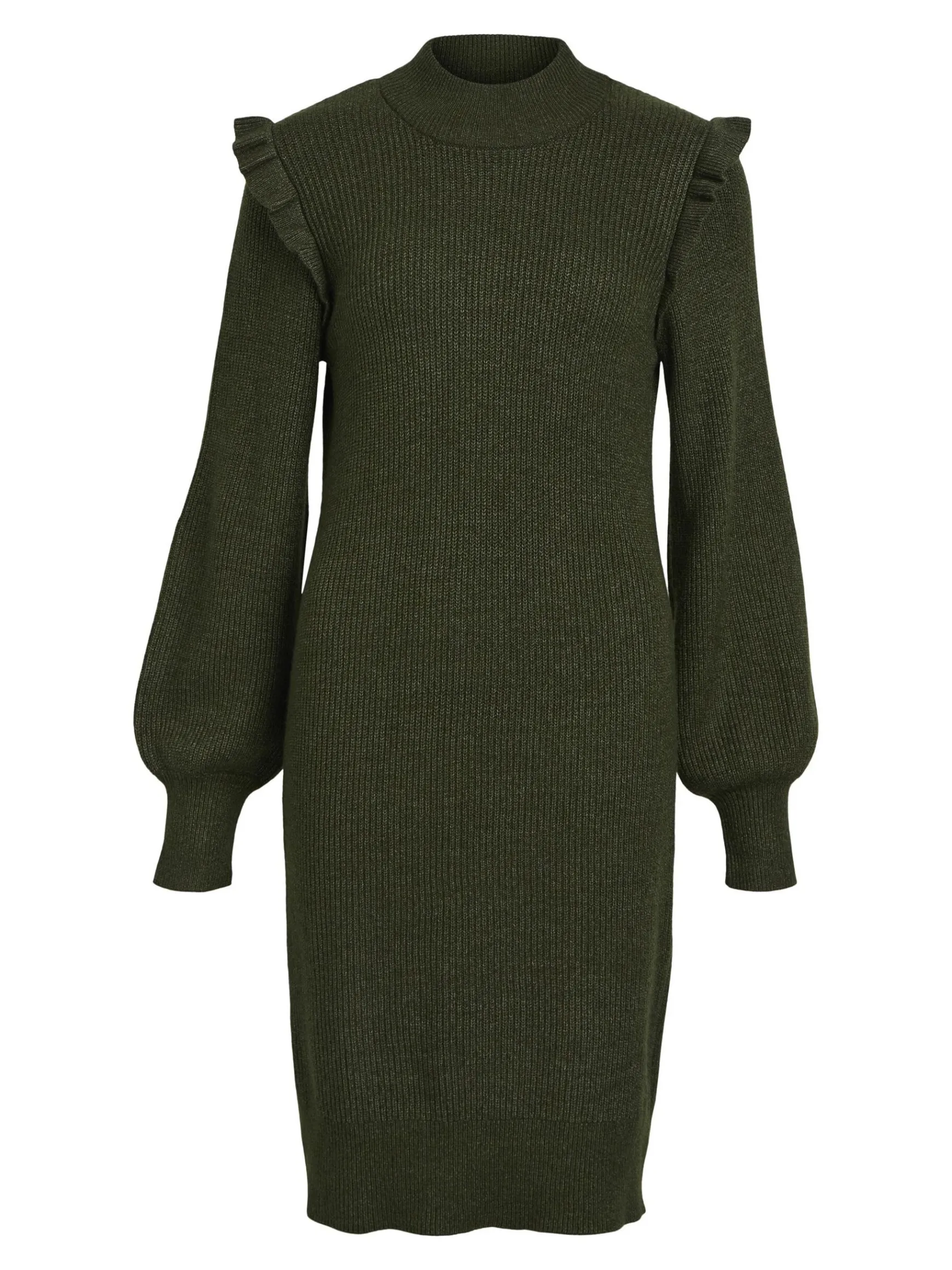 – Strikket midikjole med flæser ved skuldrene- Ballonærmer med aflange ærmekanter- Ribbet tekstur- Afslappet pasform-…