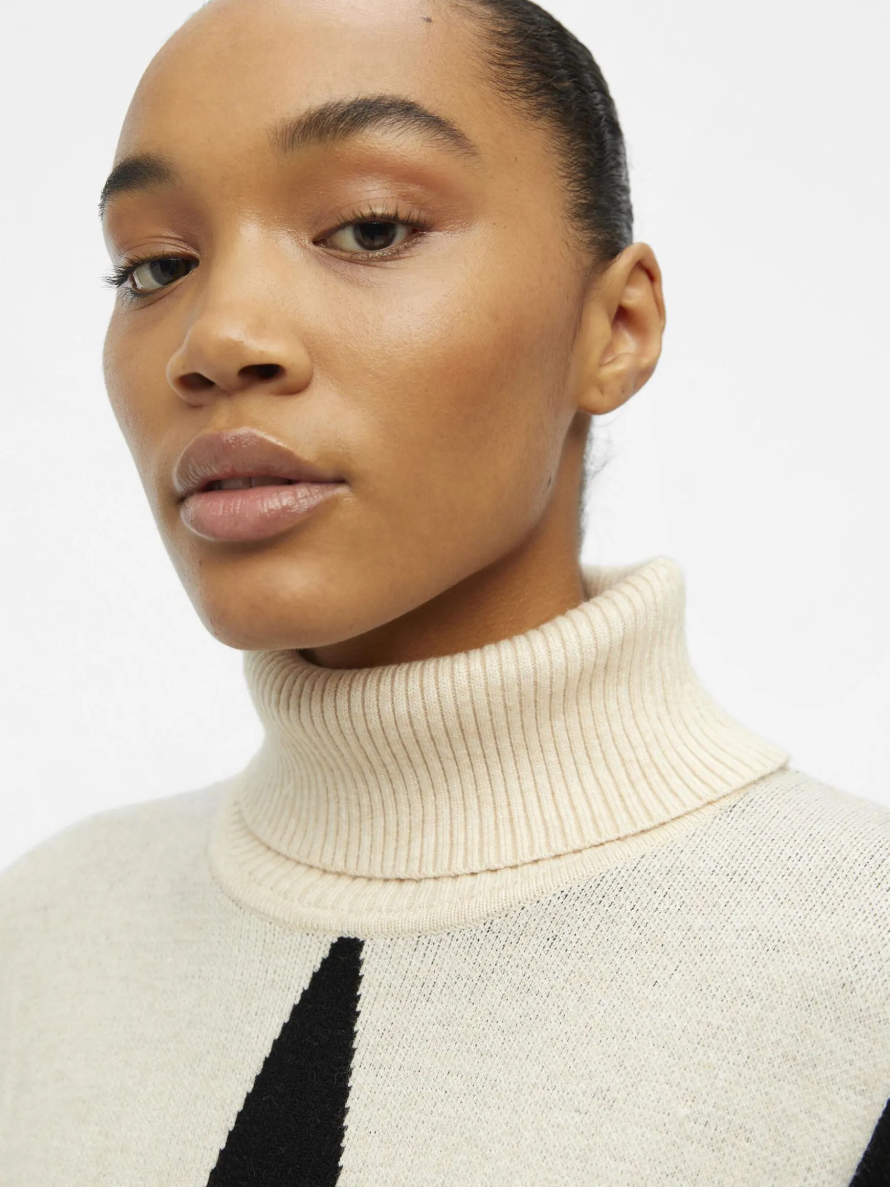 – Rullekrave- Sænkede skuldre- Lange ballonærmer- Tætsiddende ærmekanter- Ribstrikket kant- Løs pasform- Fremstillet med mere ansvarligt stof