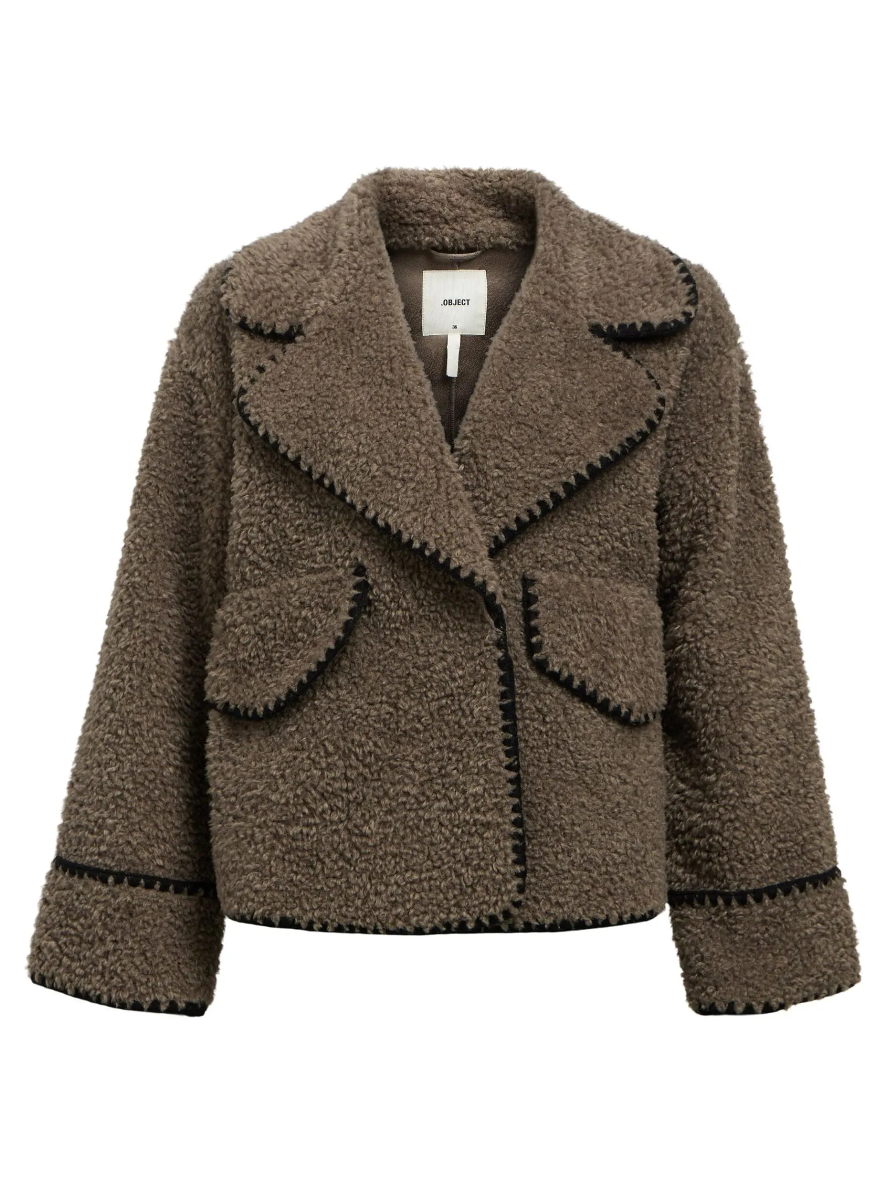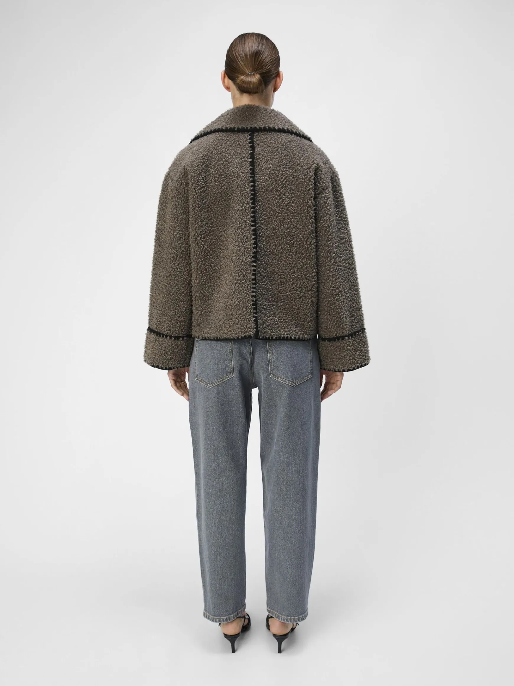 – Kort teddyjakke- Oversized krave med runde kanter- Syninger i kontrast i kanterne- Forlommer med klapper- Lange ærmer med sænkede skuldre- Skjulte trykknapper- Uforet- Afslappet pasform- Modellen er iført størrelse 36